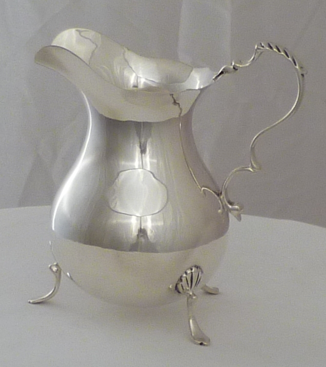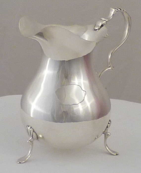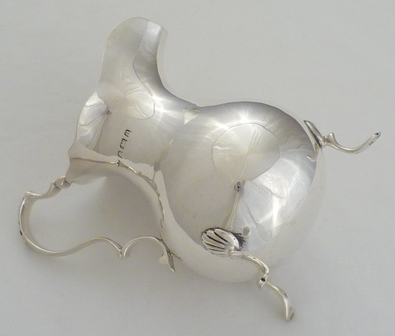 DESCRIPTION | Victorian silver tripod cream jug with shell capped feet, wavy top rim and leaf capped scrolling handle. |
