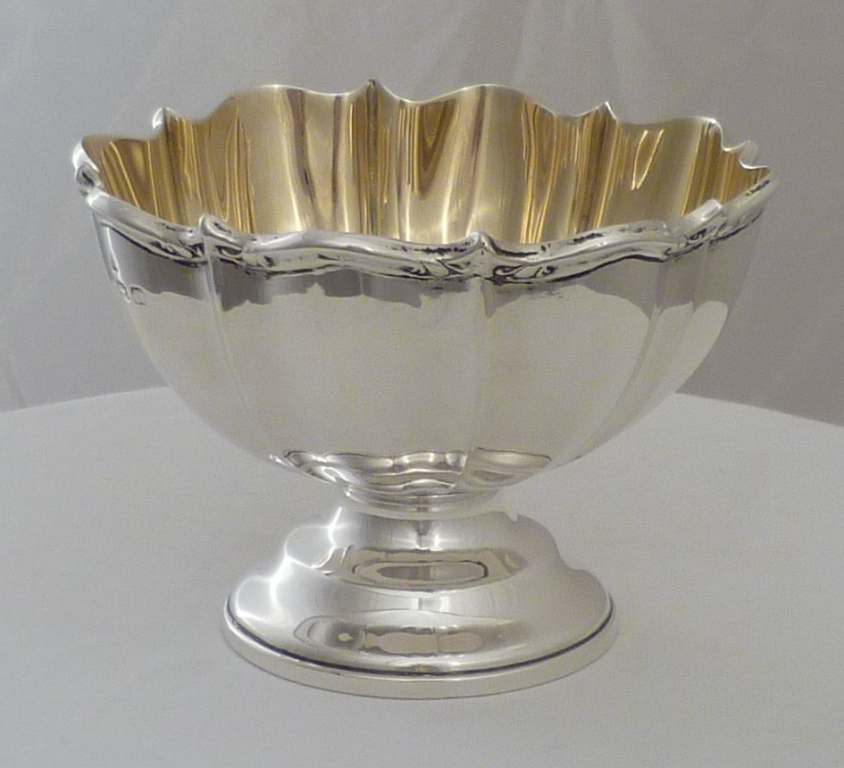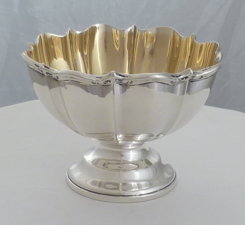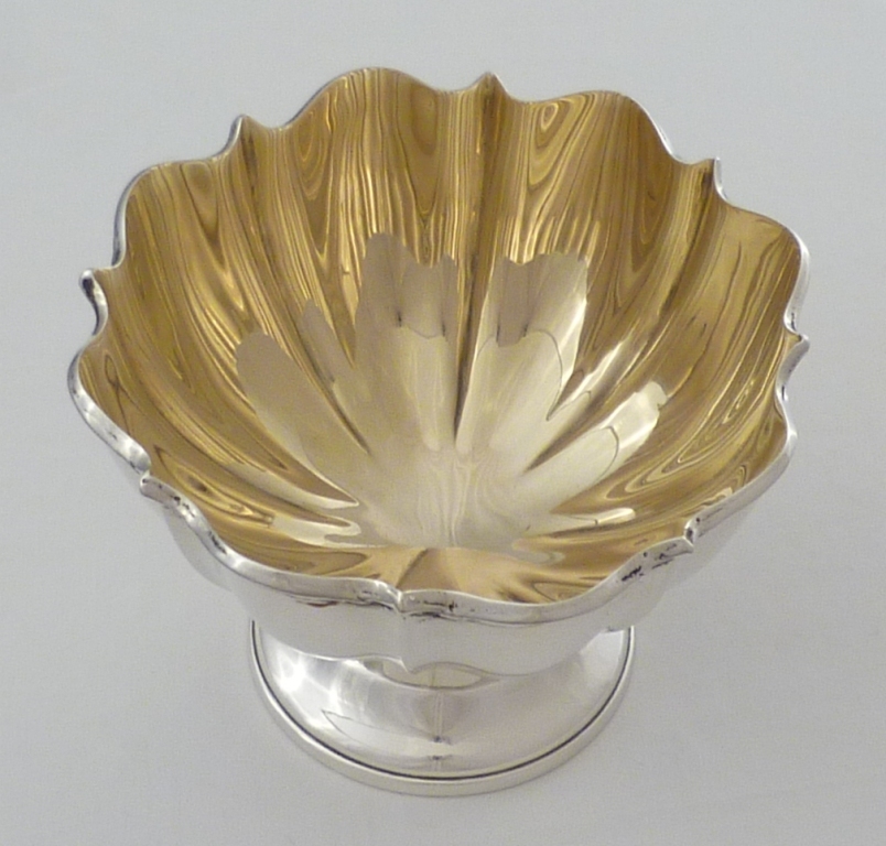 DESCRIPTION | Edwardian silver pedestal bowl with a fluted body, wavy rim and fully gilded interior. The open shape, fluted body and gilded interior work very well together and give this piece a high bling factor. |