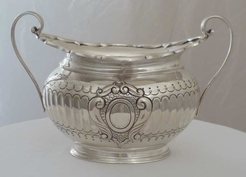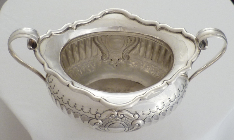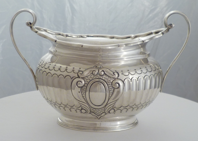 DESCRIPTION | Heavy Victorian silver two handled sugar basin. I have the matching tea pot and milk jug listed here m5686 and here m5684. The complete three piece tea set is listed at a significant discount here m5683. |