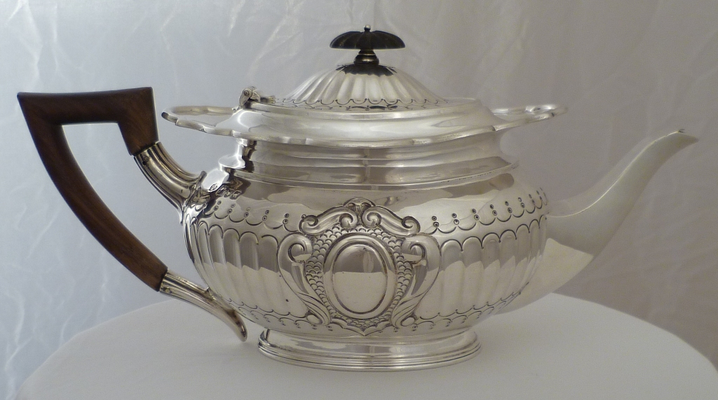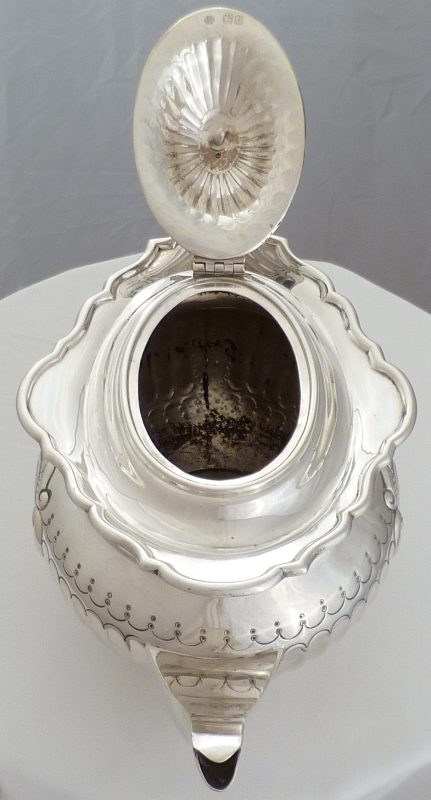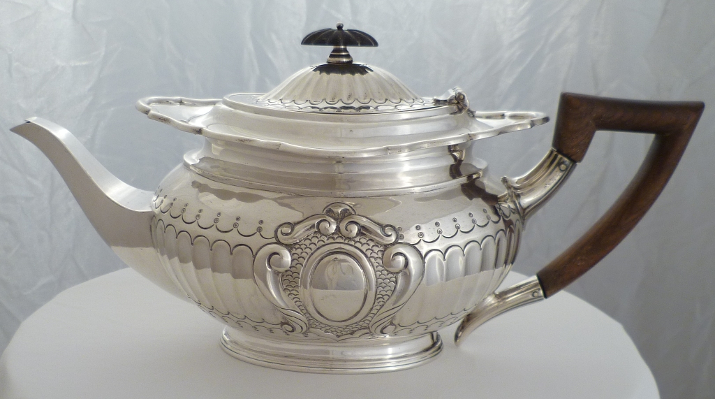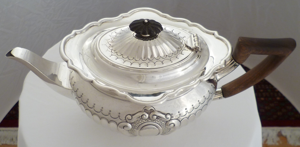 Very heavy Victorian silver tea pot. The wide top rim is functional as you will certainly need both hands to pour from this pot. I have the matching milk jug and sugar basin listed here m5684 and