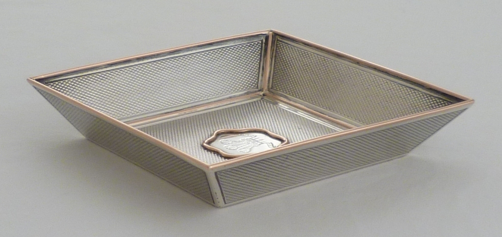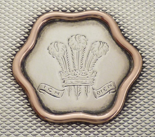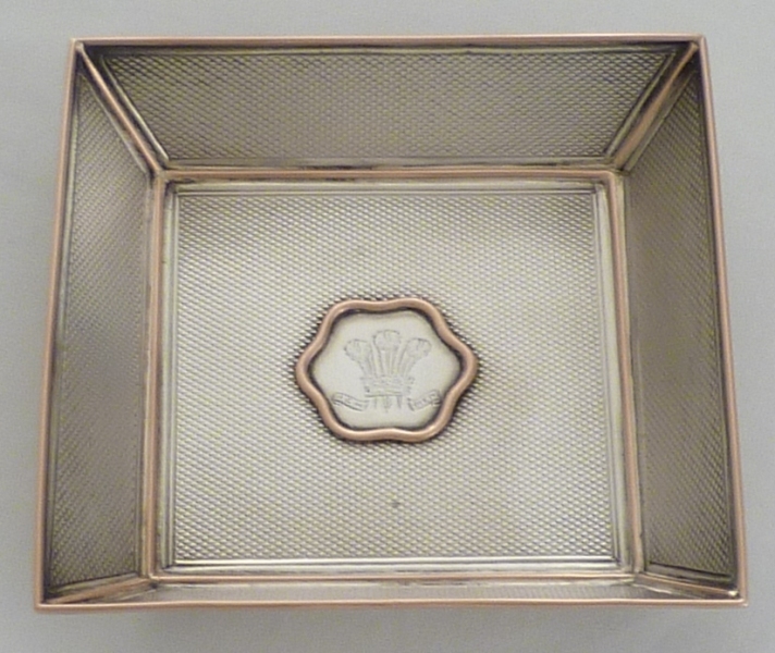 DESCRIPTION | Very smart little dish with engine turned decoration and solid red gold piped highlights. The applied central plaque is held on by four gold pins and is engraved with the Prince of Wales feathers and motto Ich Dien. More likely bought by the POW to be given away rather than for his own use. |