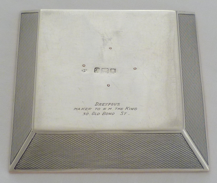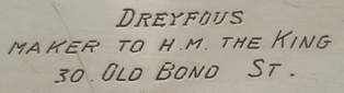 SILVERSMITH | retailer appears to have over-struck the maker's making both hard to read, also inscribed to the base 'Dreyfous, maker to H.M. The King, 30 Old Bond St. (London). Dreyfous were a high end retailer with shops in London, Paris and New York. |