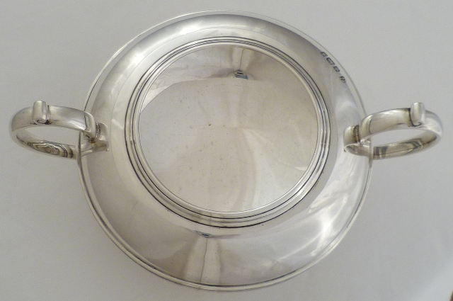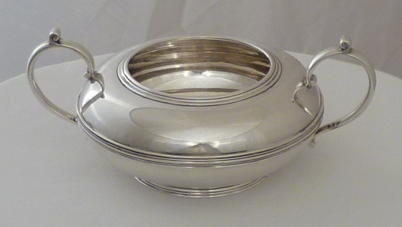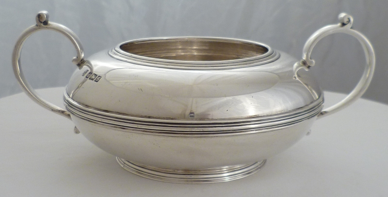 DESCRIPTION | Heavy Edwardian silver circular sugar bowl with a ring foot and thread decoration. |