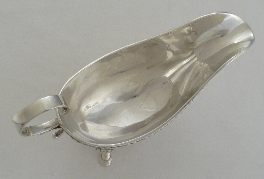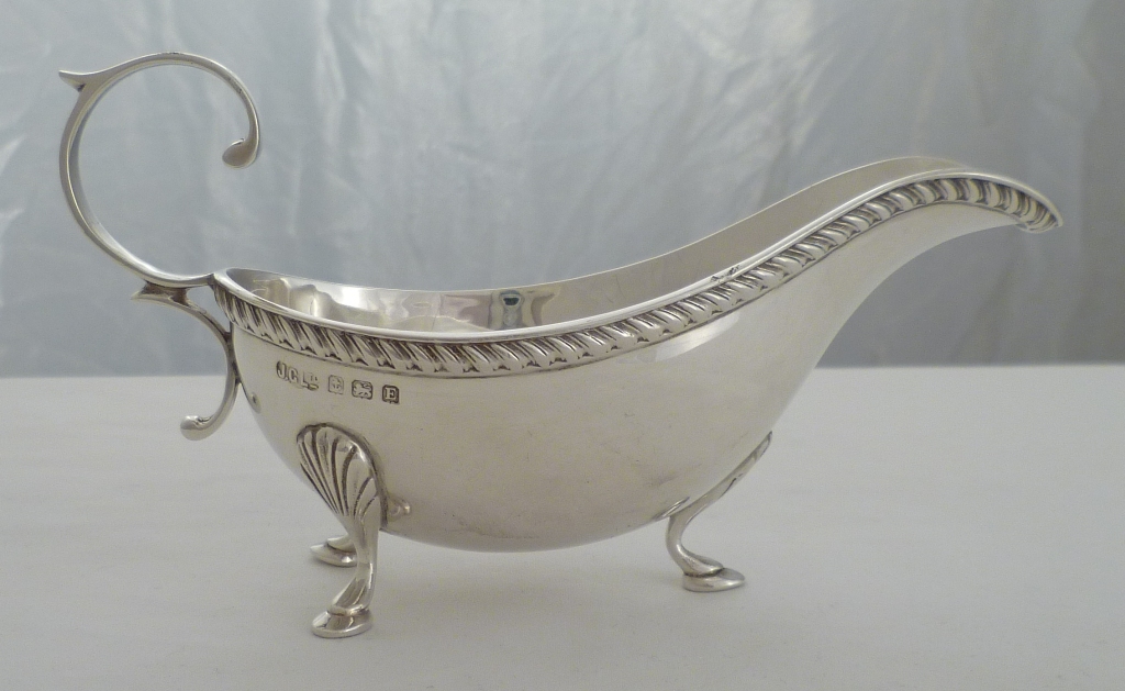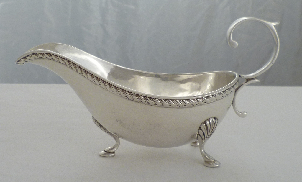 DESCRIPTION | Good quality smaller silver sauce boat with a scrolling handle, gadroon decorated top rim and three shell capped hoof feet. Far too small for a family serving of gravy but ideal for garlic butter and spicy sauces as the thick metal will help keep the contents hot if the boat is warmed before use. |