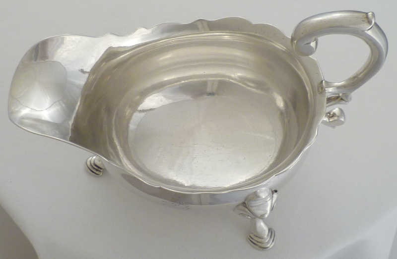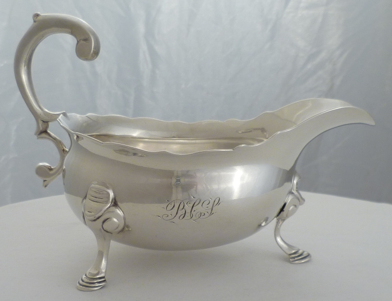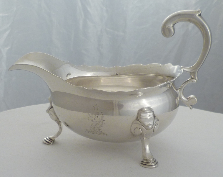 DESCRIPTION | Very good Georgian silver sauce boat, broad and hefty, with a scrolling handle, three interestingly capped hoof feet, monogram engraving to one side and attractive crest engraving to the other. Good and thick silver throughout, especially the base so if warmed before use it will help keep your sauce nicely hot. |