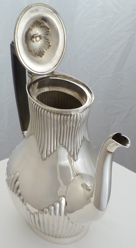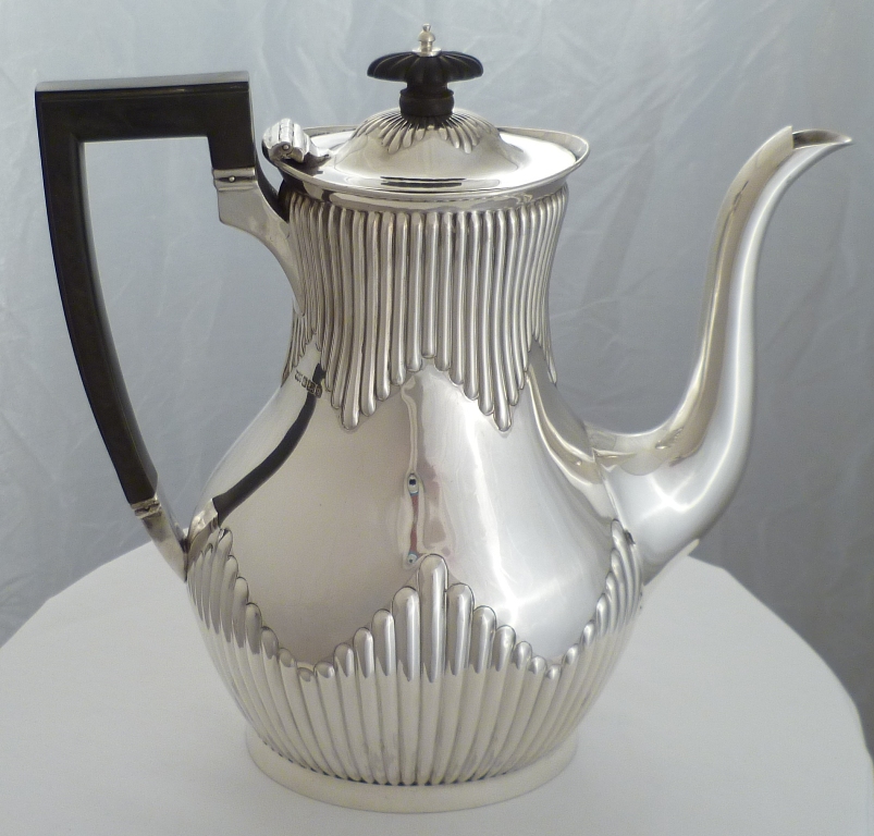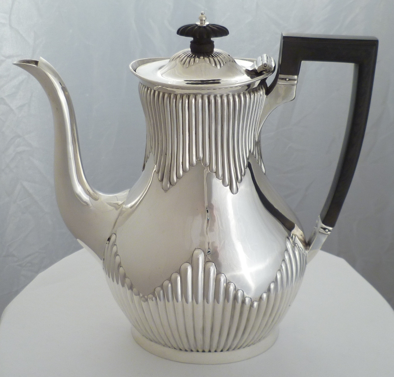 DESCRIPTION | Good Edwardian silver coffee pot with reeded decoration. Holds 2 ½ pints and is a faultless pourer. |