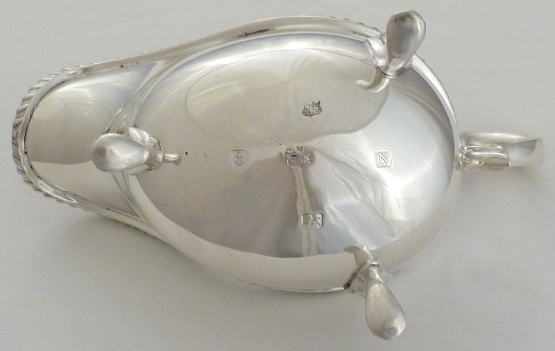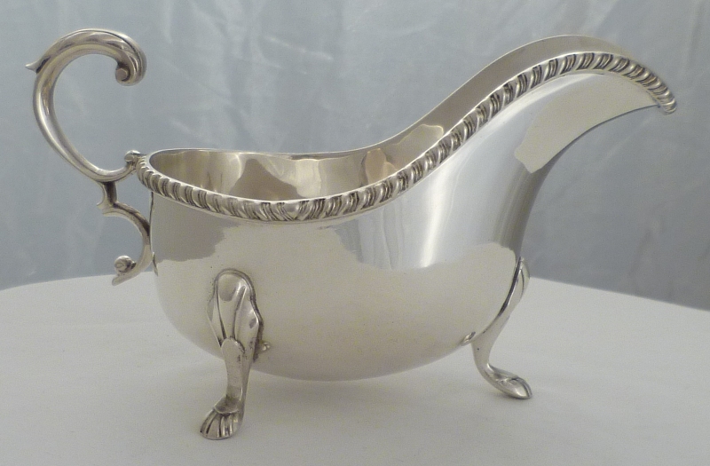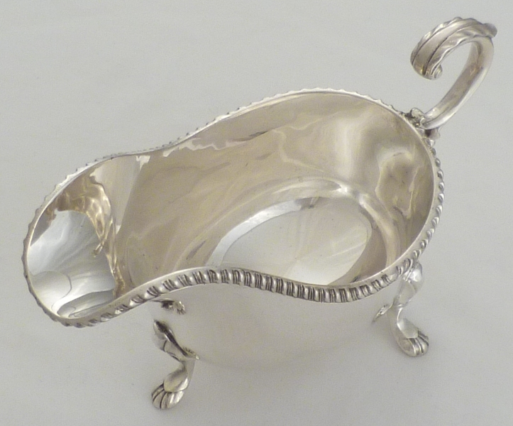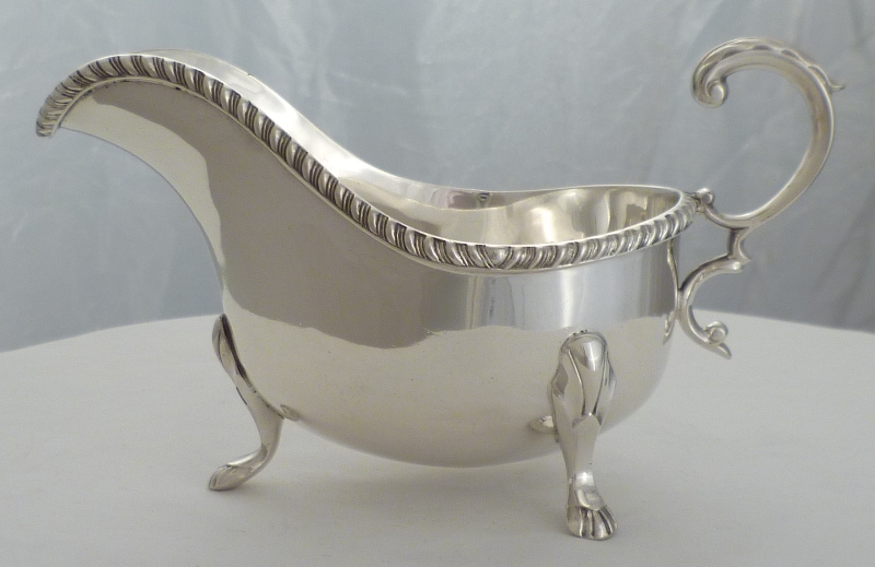 DESCRIPTION | Good quality and surprisingly heavy silver sauce boat with three paw feet, gadroon decorated top rim and flying leaf capped 'C' scroll handle. |