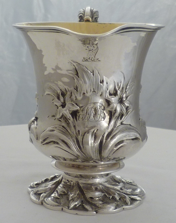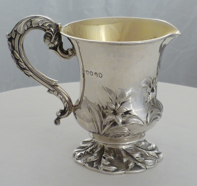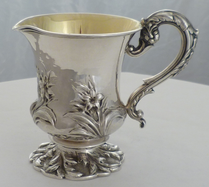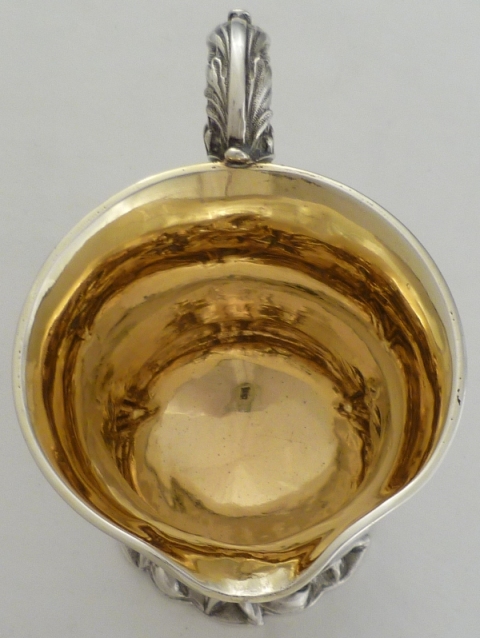 DESCRIPTION | Pretty little William IV silver cream jug with a strongly gilded interior and cast pedestal foot. Monogram engraving to the cartouche and a crest engraving below the lip. The dark grey colour in the images is just an odd reflection. |
