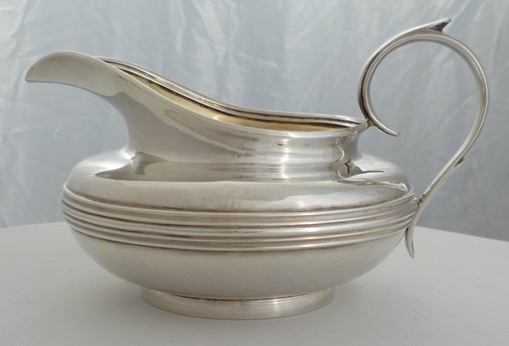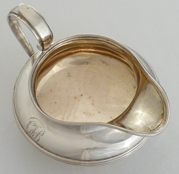 DESCRIPTION | Good quality and hefty Georgian silver cream or milk jug with thread decoration, monogram engraving and gilded interior. |