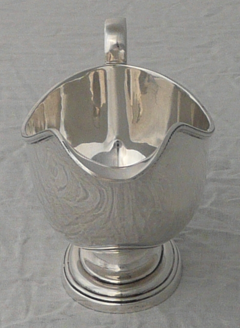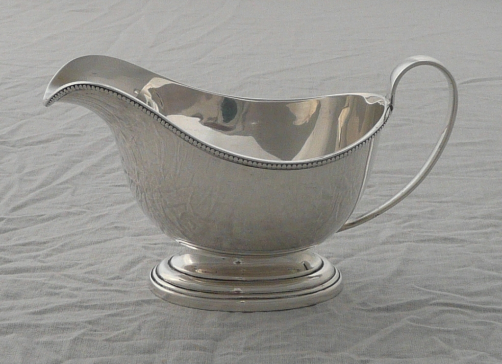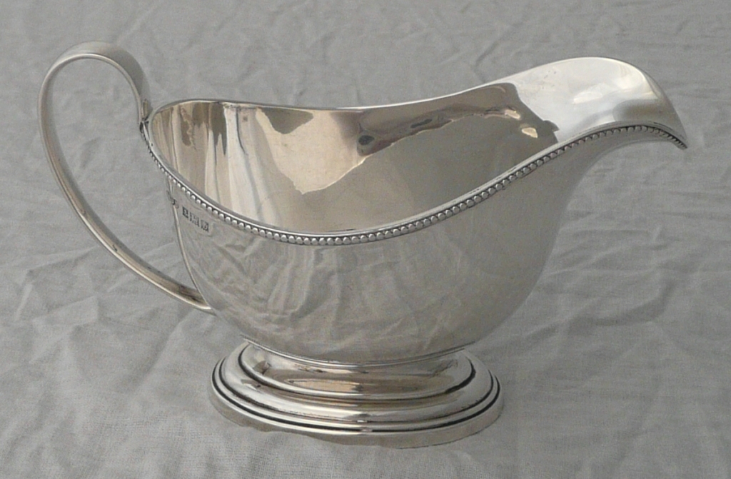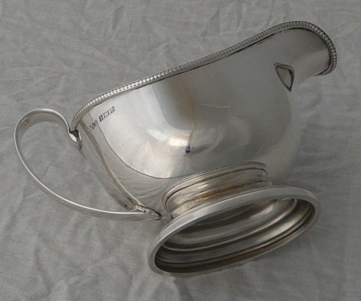 DESCRIPTION | Good little silver sauce boat with a bead decorated top rim and oval pedestal foot. |