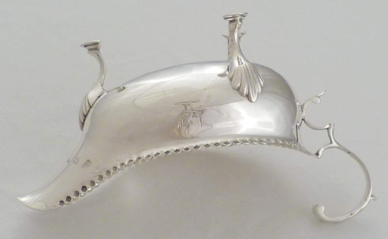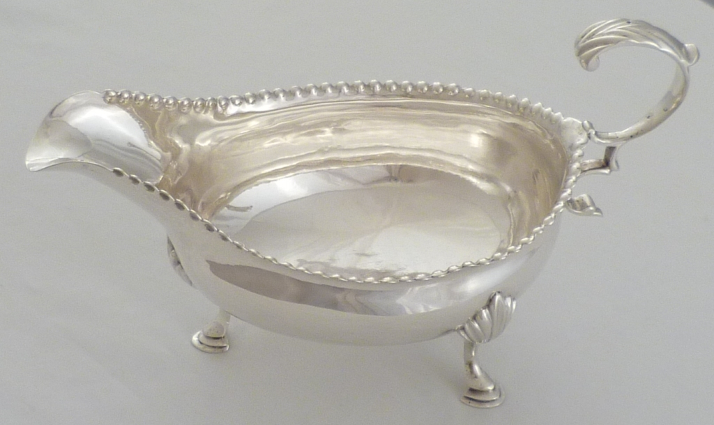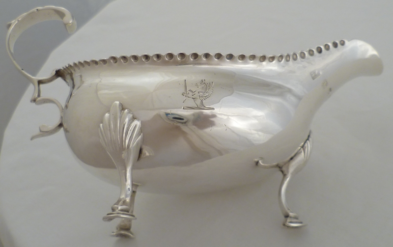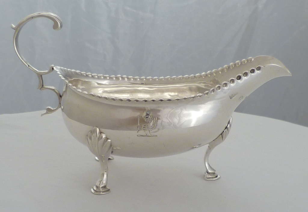 DESCRIPTION | Good Georgian silver sauce or cream boat with a bead decorated top rim, three shell capped hoof feet, flying leaf capped and scrolling handle and a crest engraving to one side. |