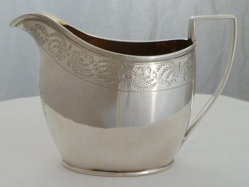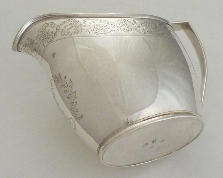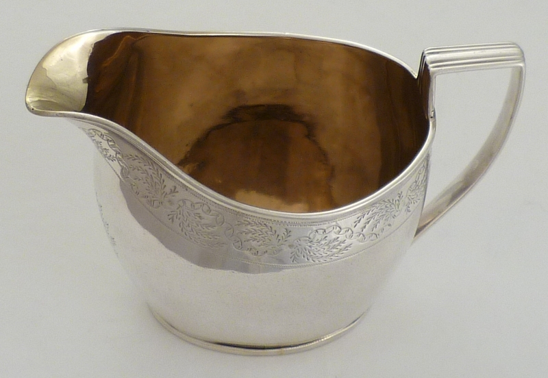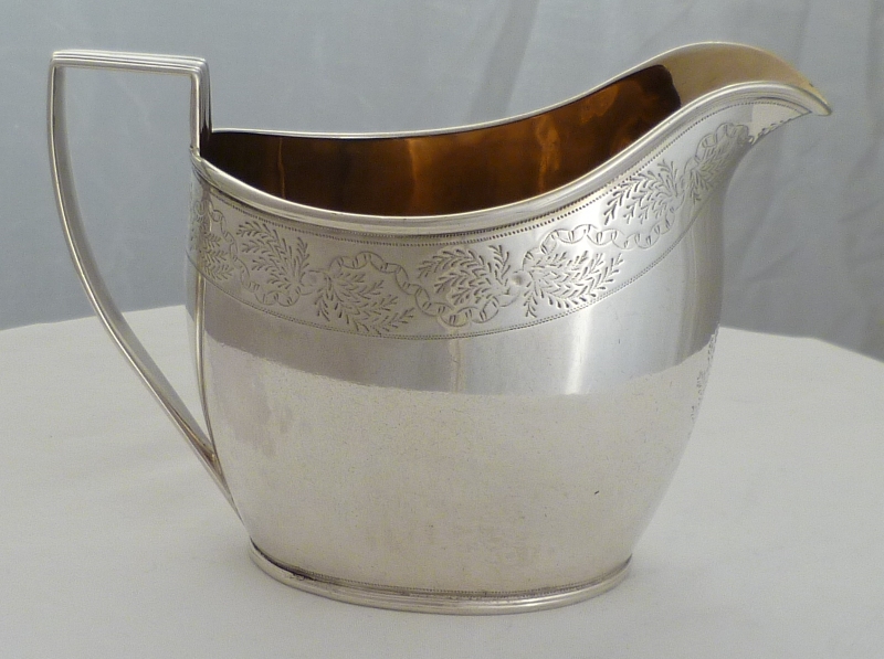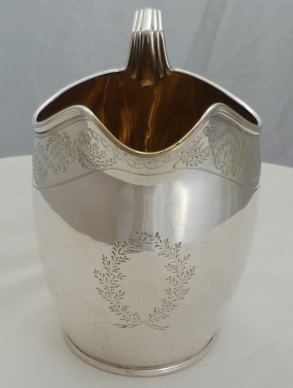 DESCRIPTION | Pretty Georgian silver jug with a gilded interior and upper band of engraved decoration. Blank foliate cartouche to the front and no engraving or erasure. |