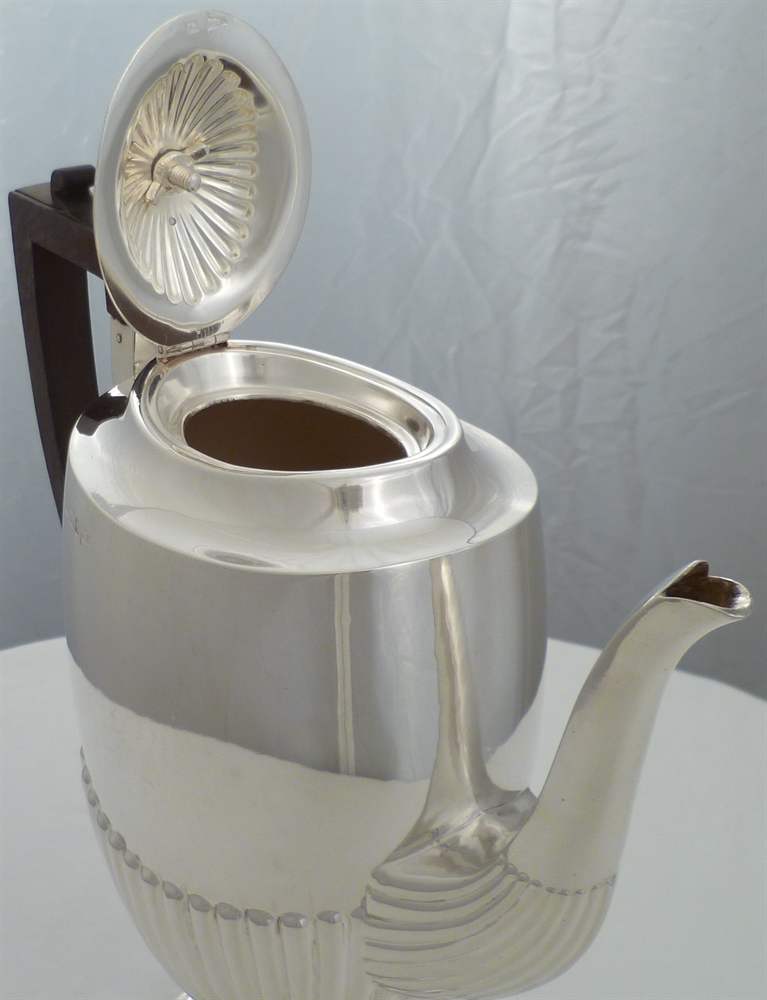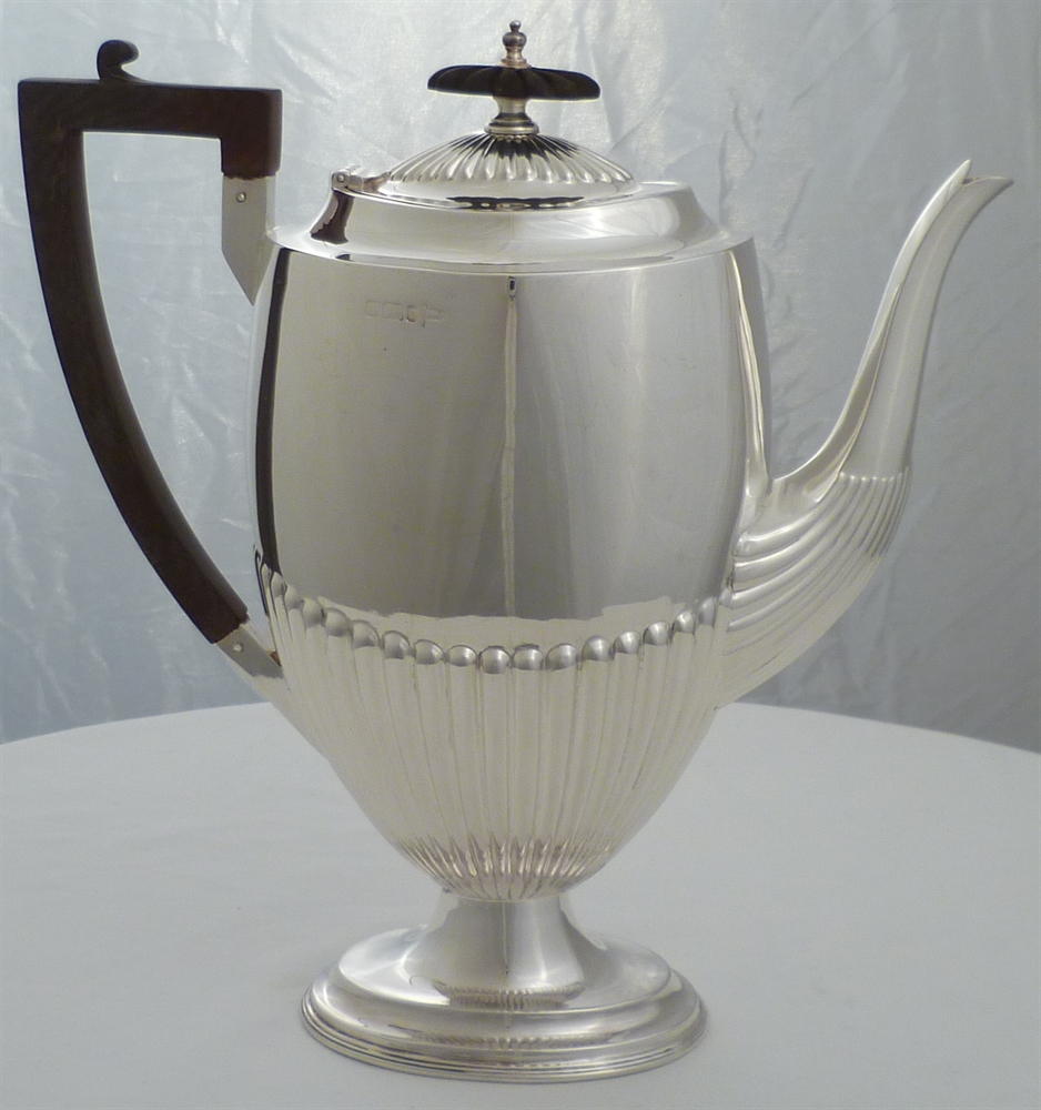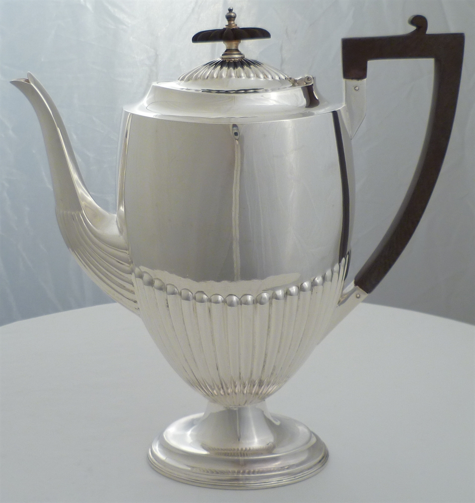 DESCRIPTION | Large Edwardian silver coffee pot. Excellent pourer and holds 58 fluid ounces or 1700 ml. |