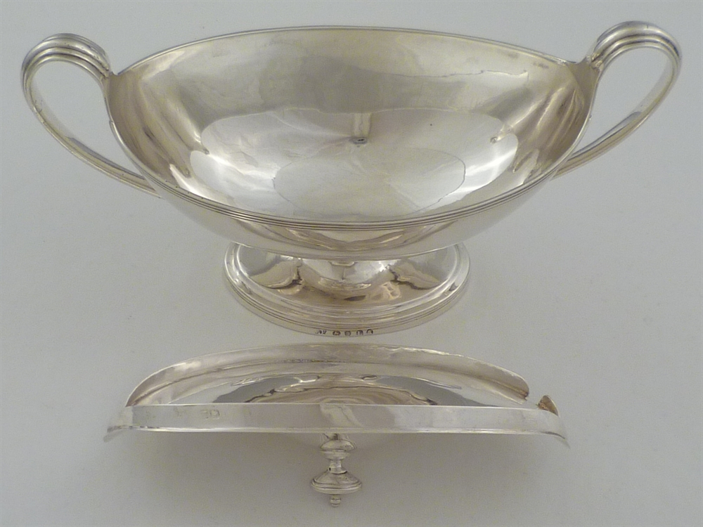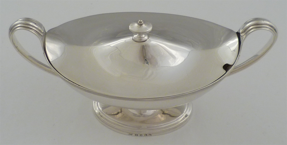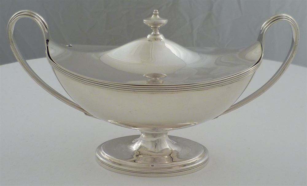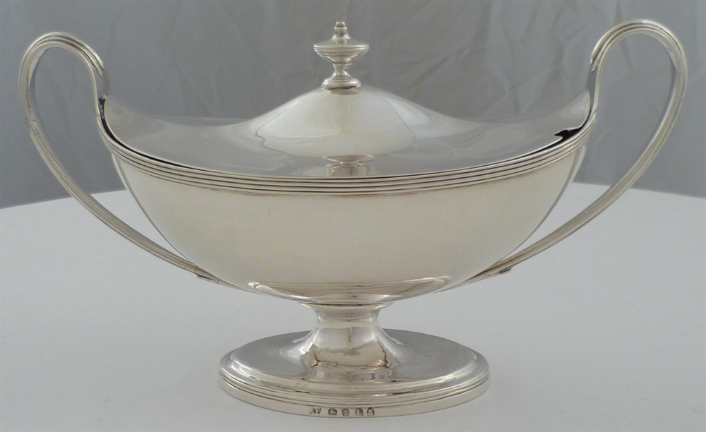 DESCRIPTION | Georgian silver sauce tureen with twin loop handles, pedestal foot, thread decoration and lift off lid with conforming finial. Correctly and clearly hallmarked to foot and lid rim. |