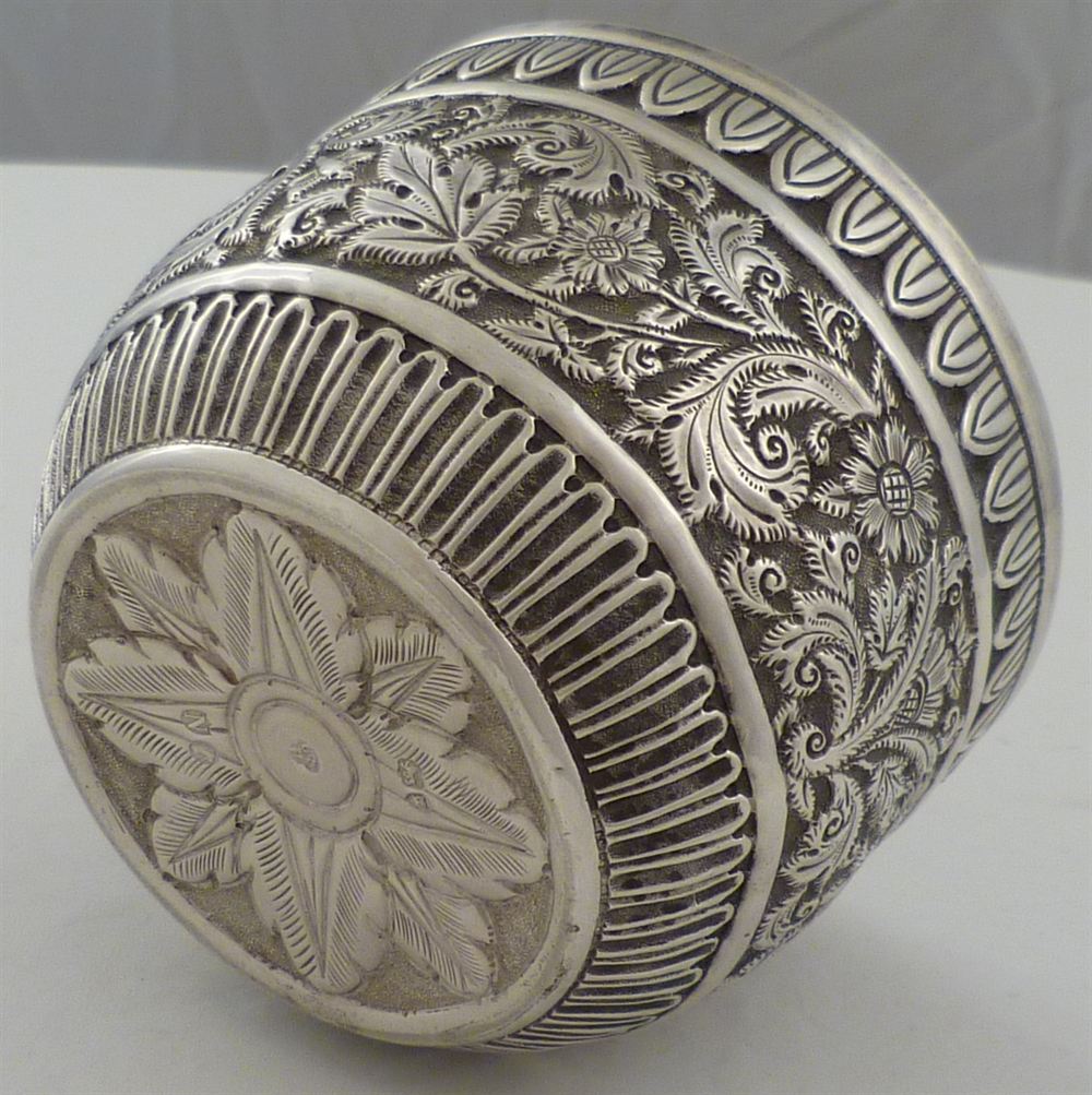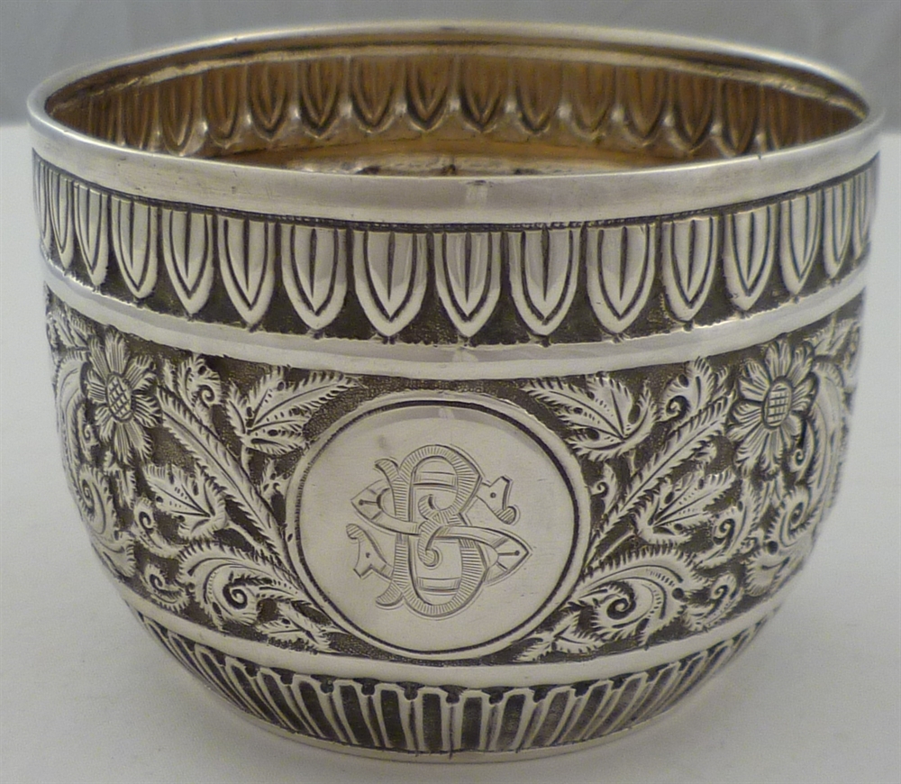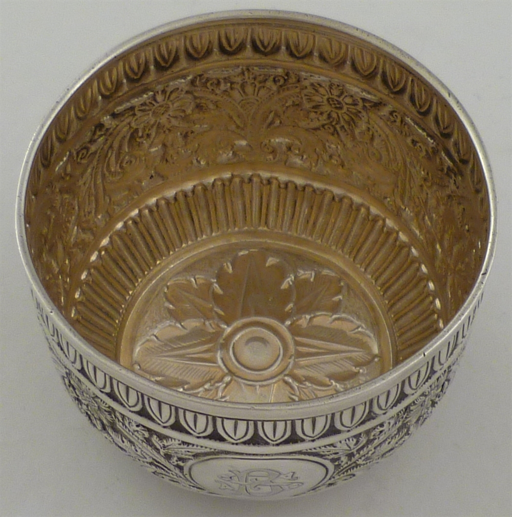 DESCRIPTION | Good quality and decorative Victorian silver bowl with embossed and engraved decoration, lightly gilded interior and a monogram engraved circular cartouche. |