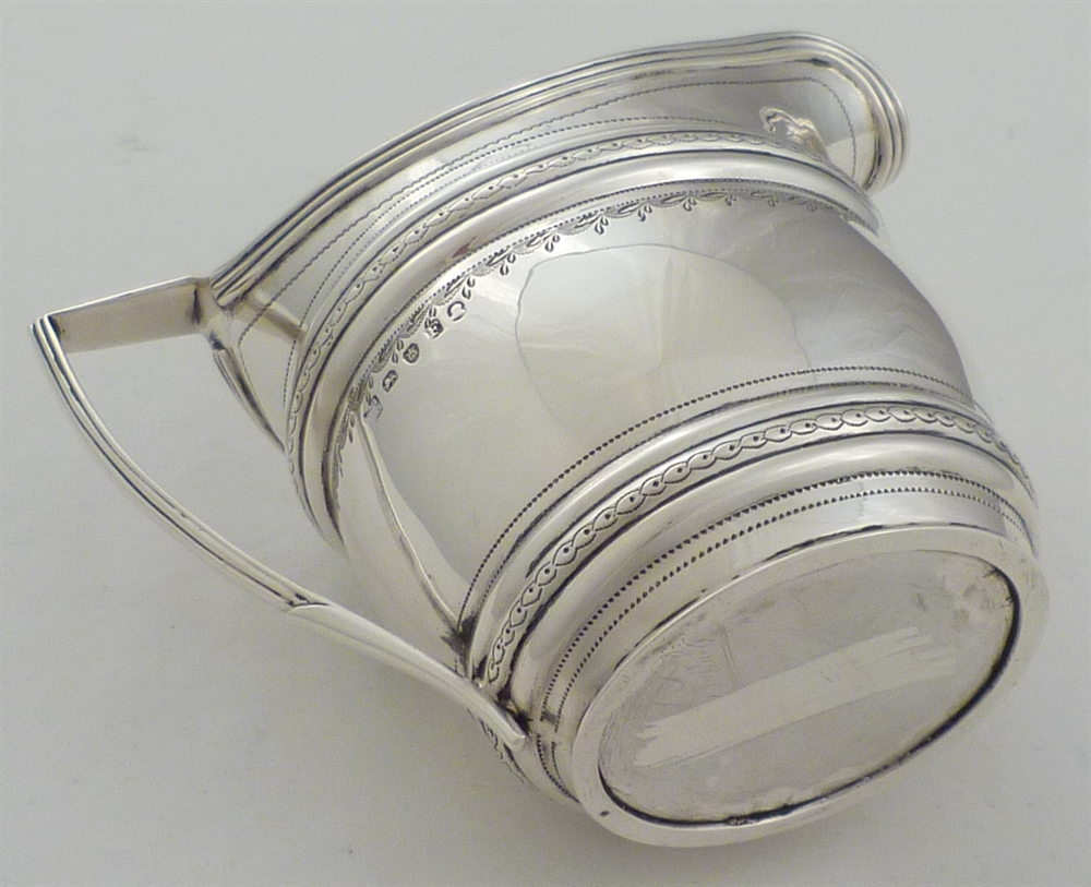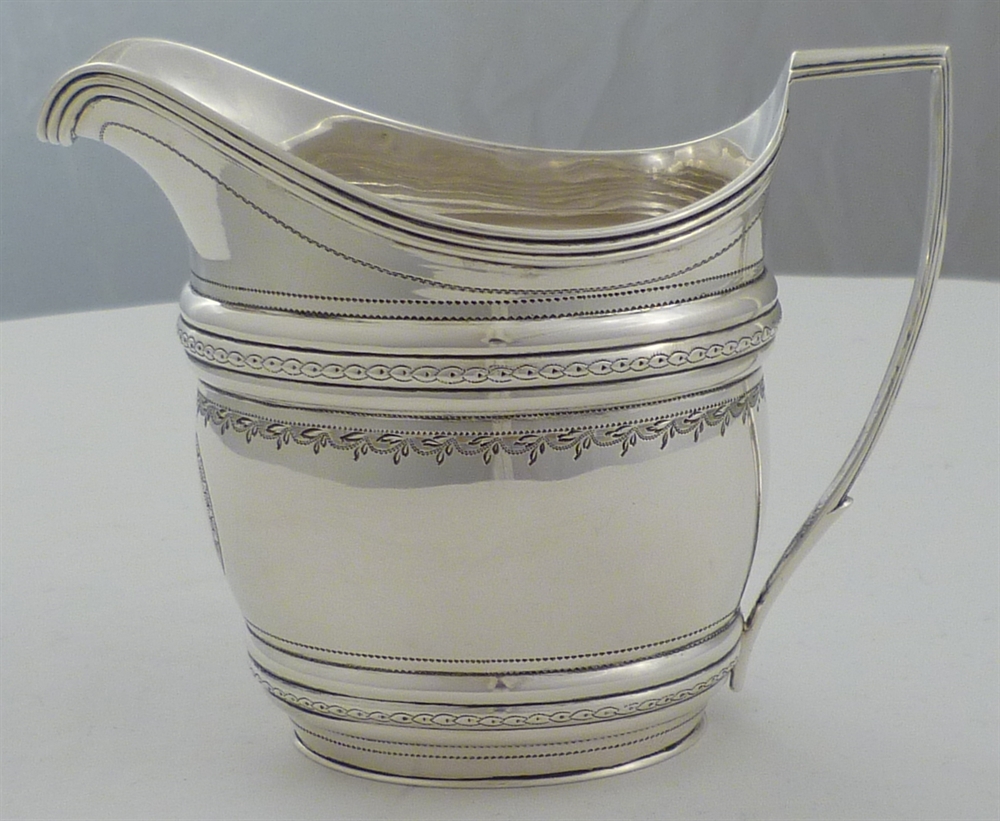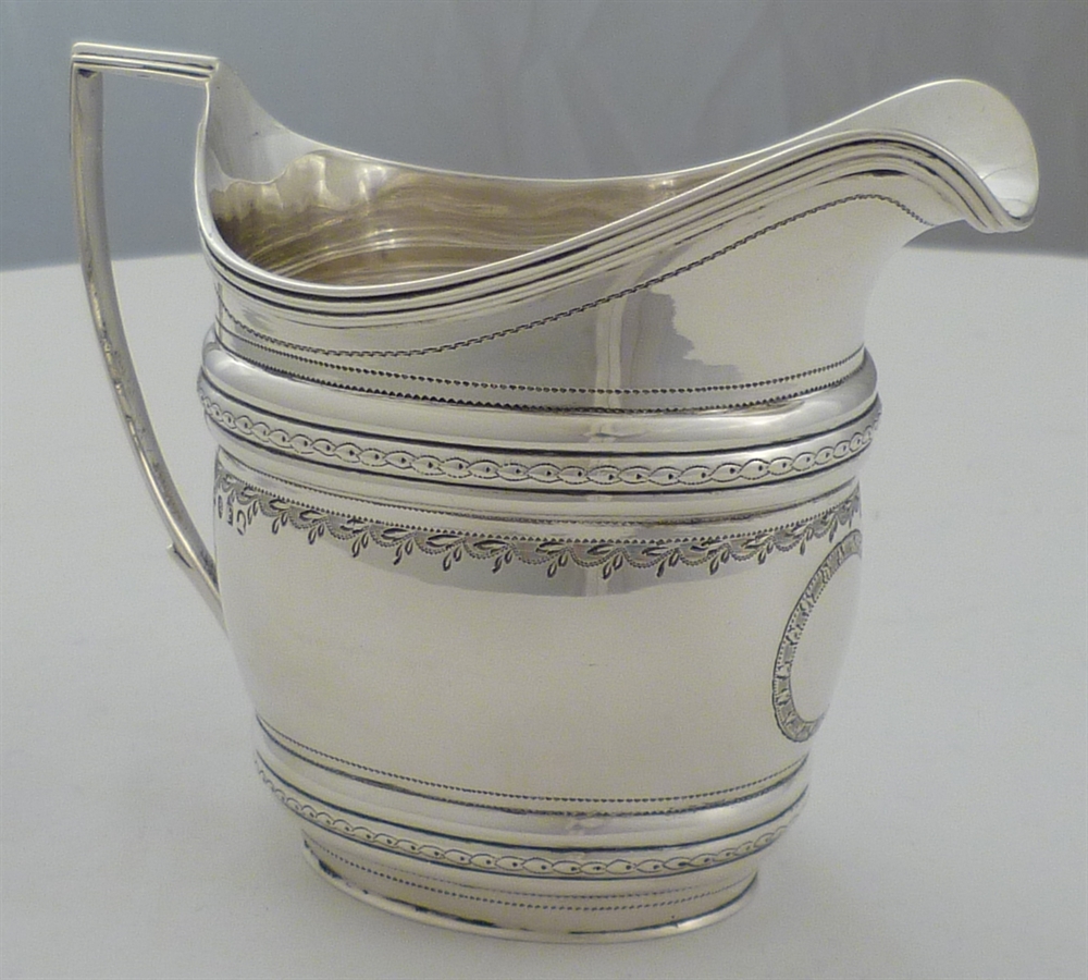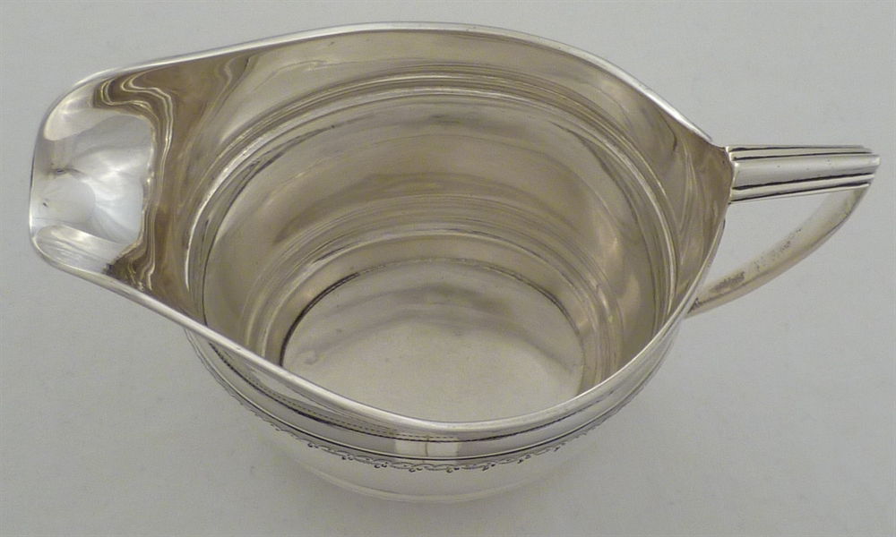 DESCRIPTION | Good quality Georgian silver cream jug with engraved decoration. The lighter area to the centre of the base is where the assayer took his scrape of silver to assay for quality. |