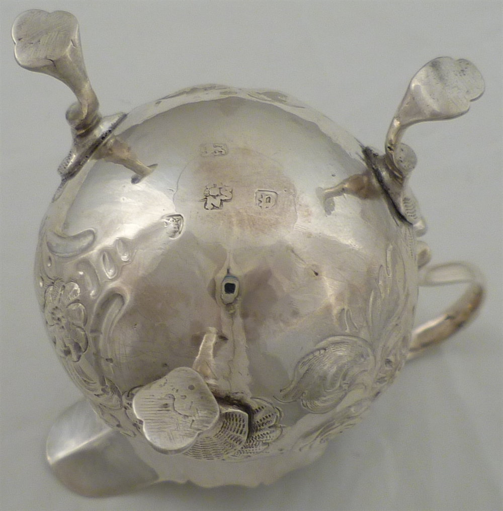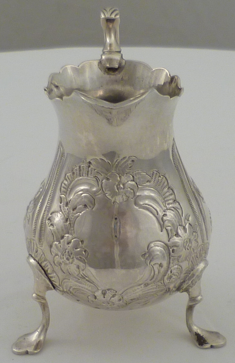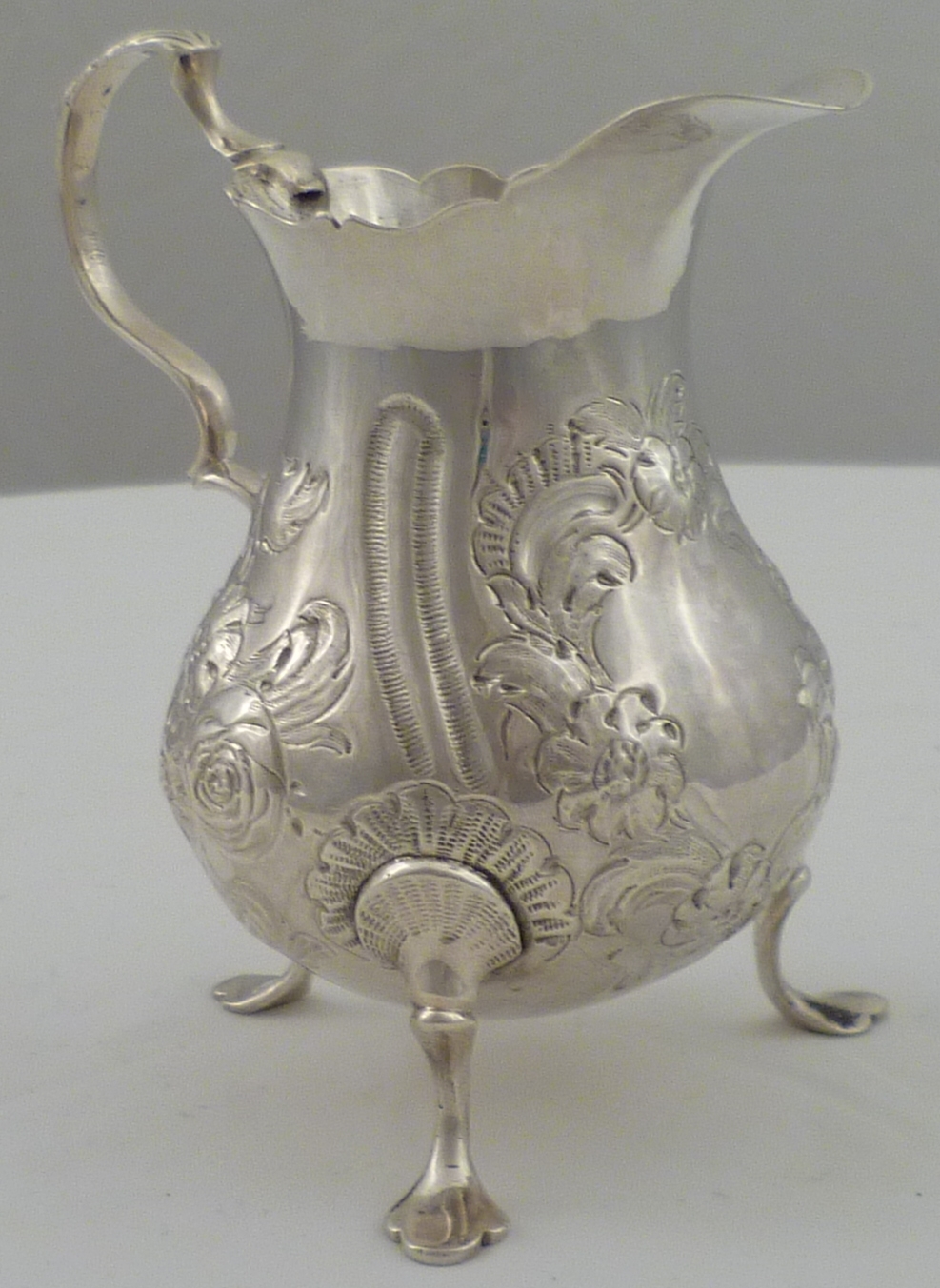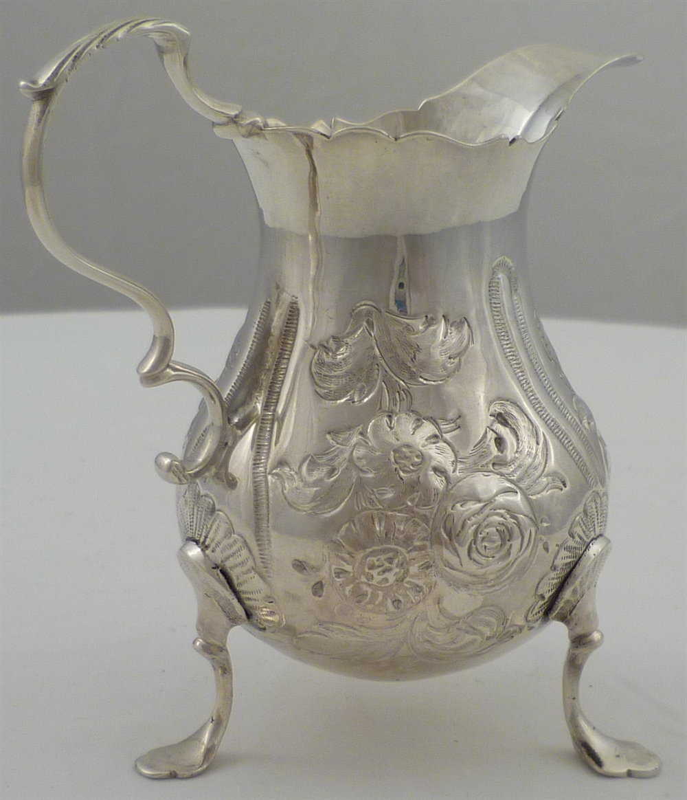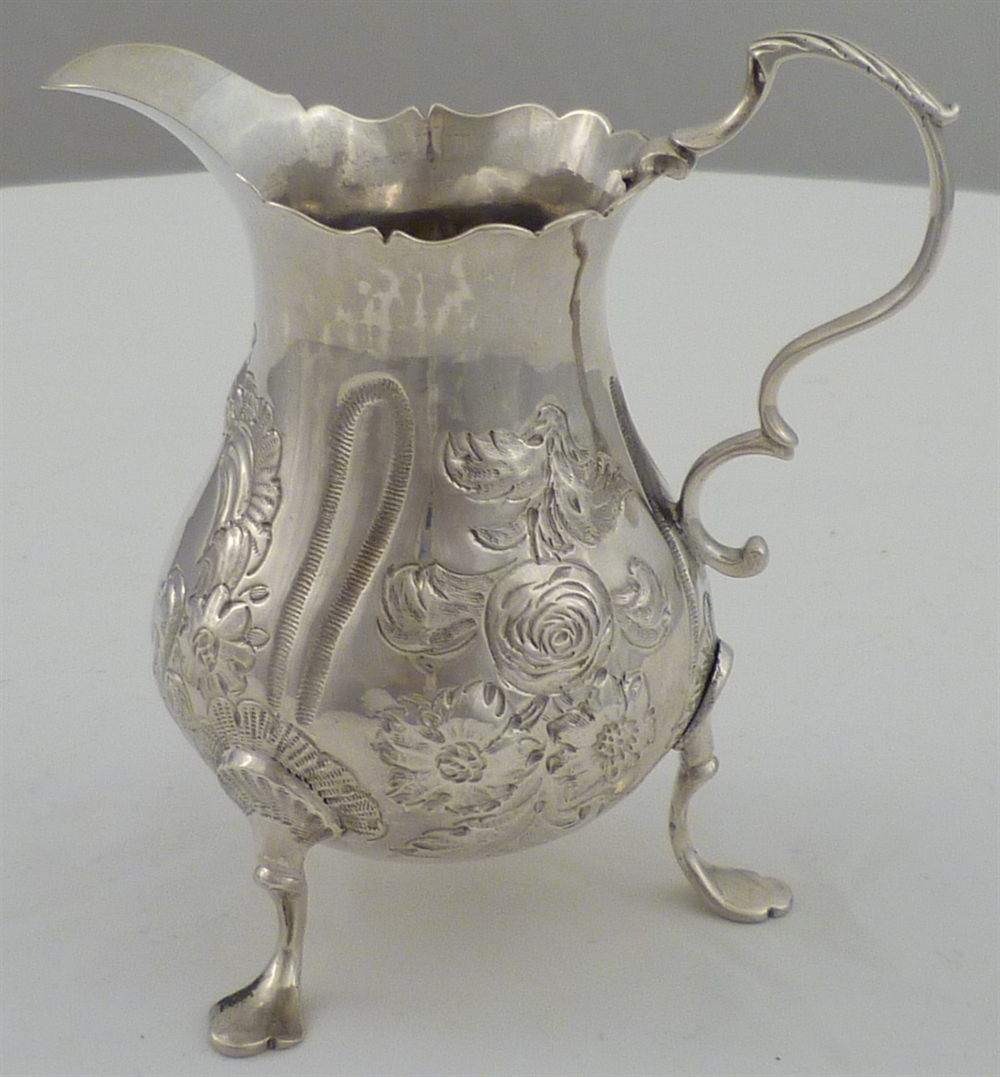 DESCRIPTION | Pretty Georgian silver tripod cream jug with embossed and engraved decoration and a vacant cartouche. |