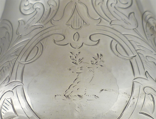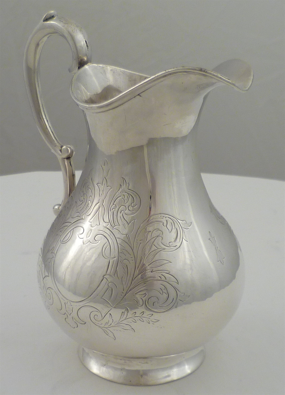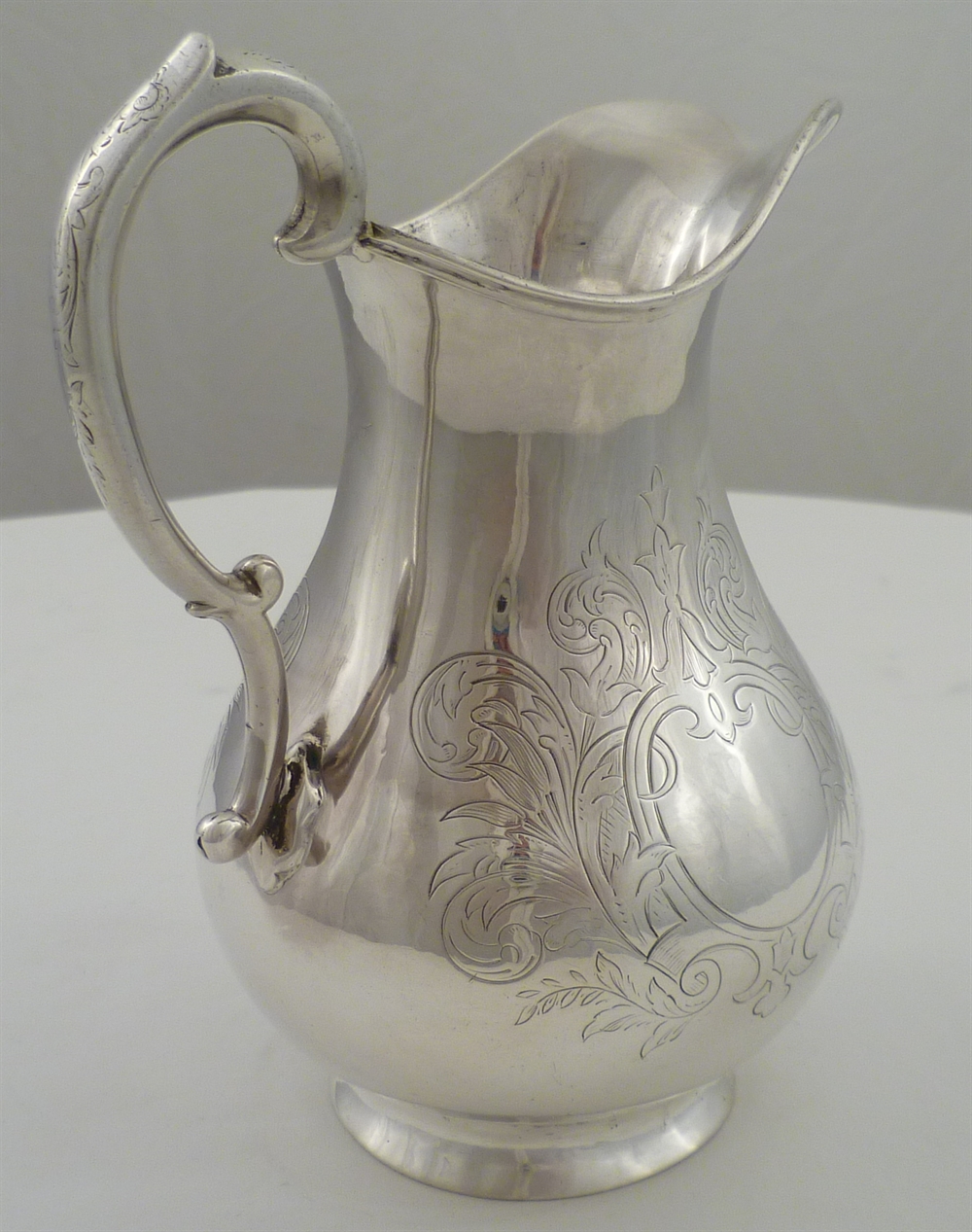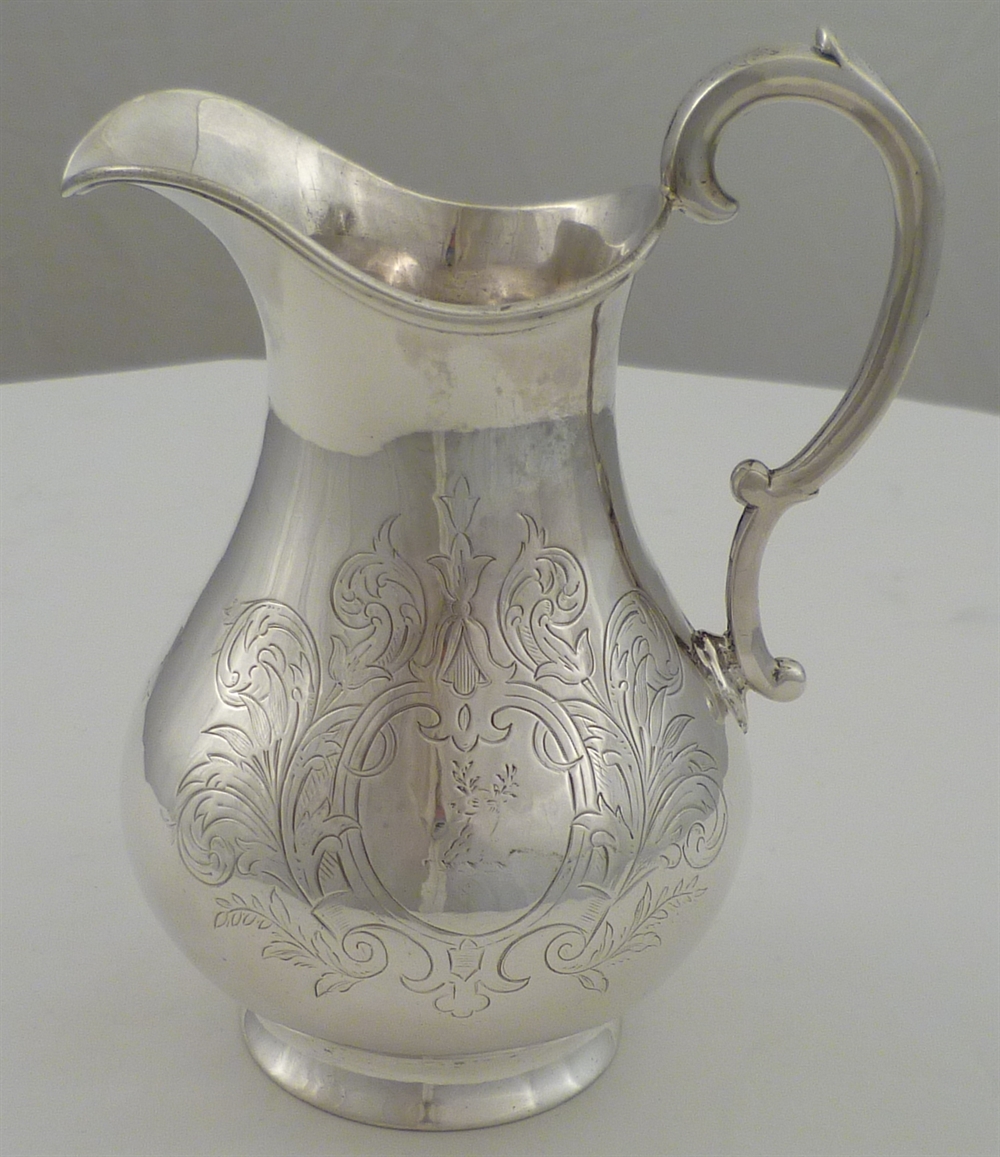 DESCRIPTION | Large Victorian silver milk jug with engraved decoration and a crest engraving to one cartouche. |