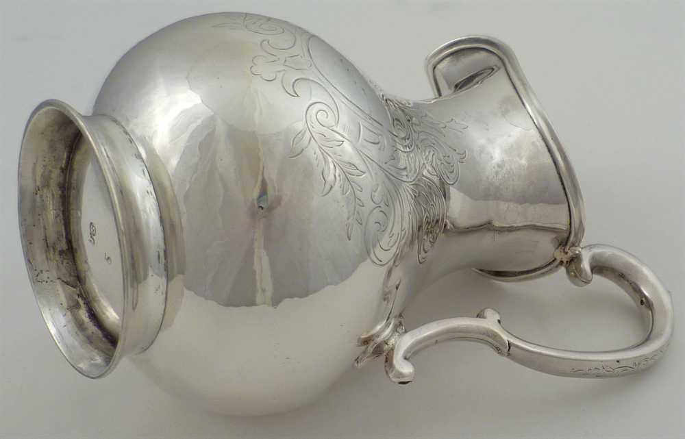 OVERALL CONDITION | good, no bumps, handle has probably been reattached and a monogram engraving may have been erased from below the pouring lip although there is no sign of thinning |