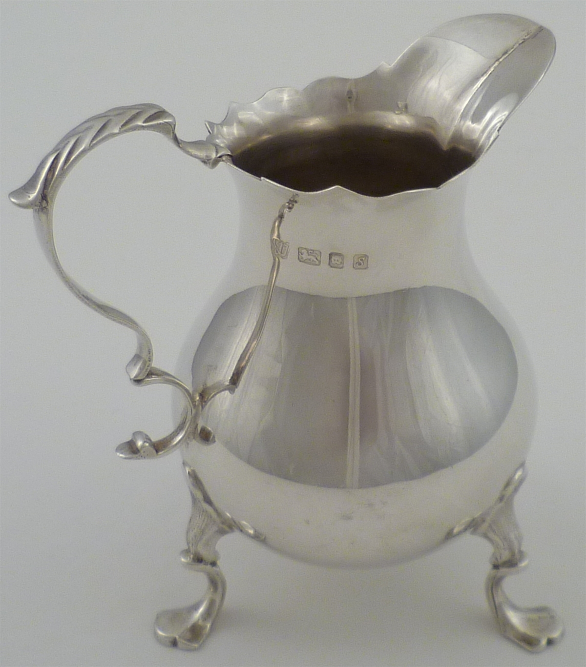 DESCRIPTION | Mid 18th century style solid silver tripod baluster cream jug with no engraving or erasure. |