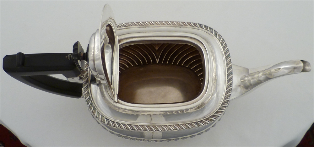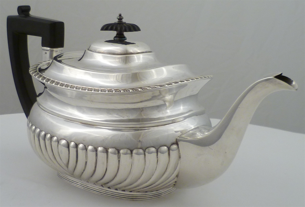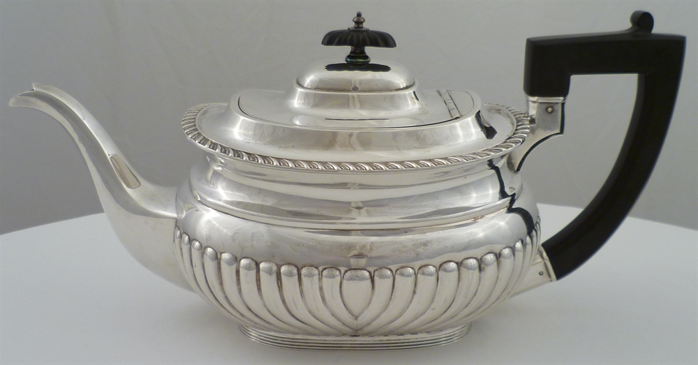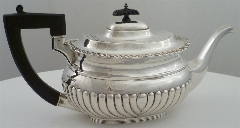 DESCRIPTION | Good quality large Edwardian silver tea pot with gadroon decoration, concealed hinge and no engraving. Holds 1200ml. There is a pleasing amount of tannin to the inside that I have left in place as many believe this improves the flavour of the tea. However, this could easily be removed should you wish. |
