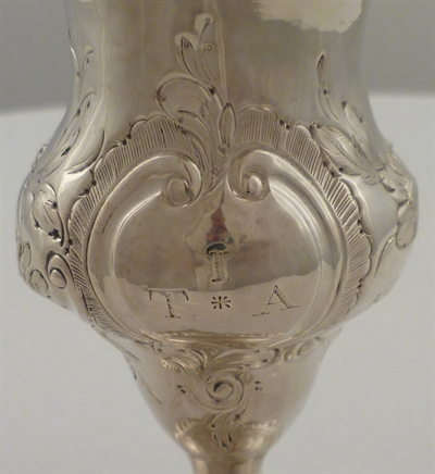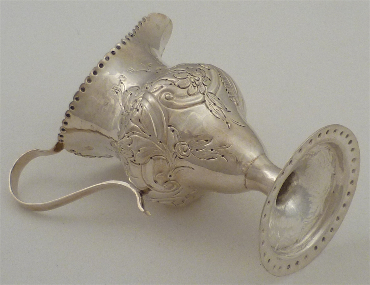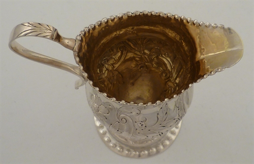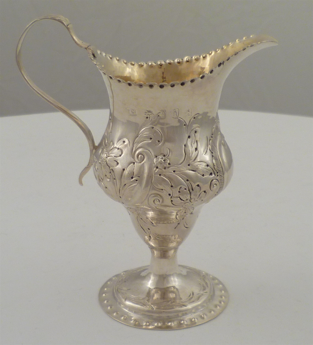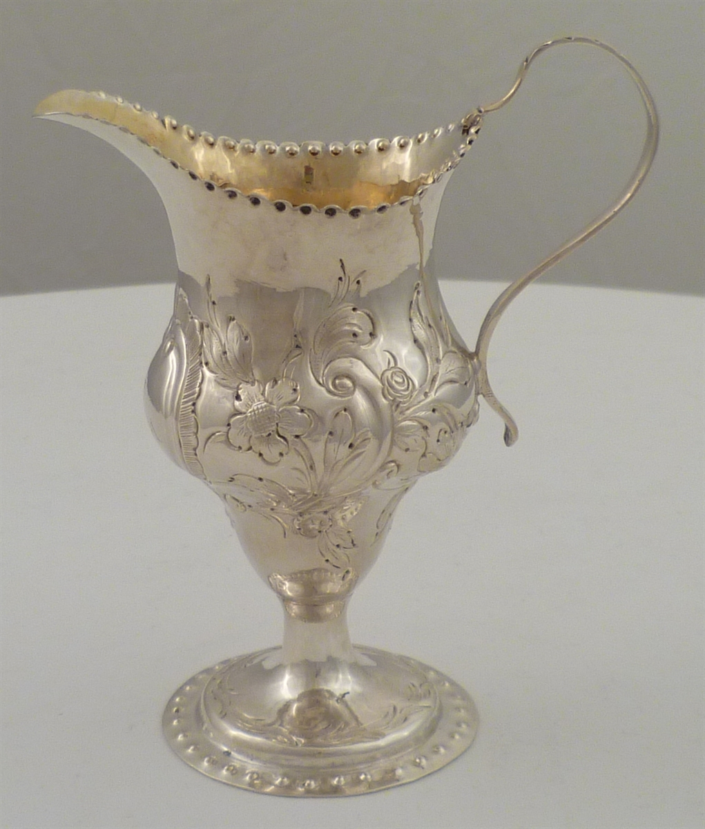 DESCRIPTION | Pretty Georgian silver cream jug with embossed and engraved decoration, original initials within rococo cartouche, punched bead rims and a gilded interior. |