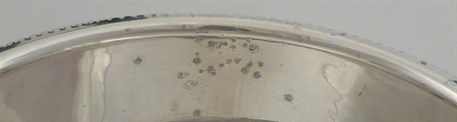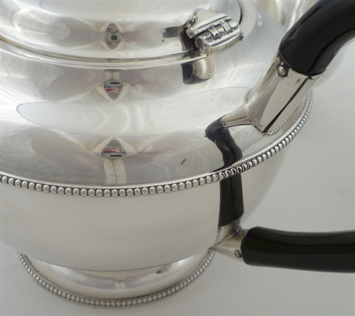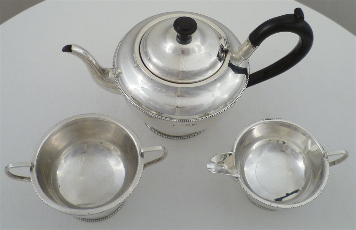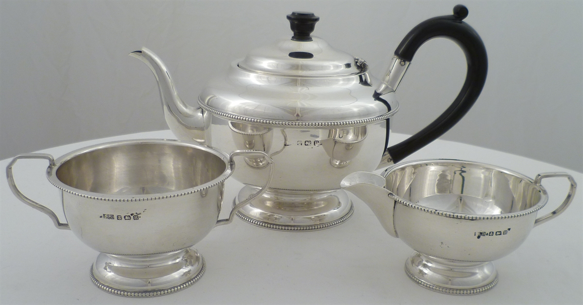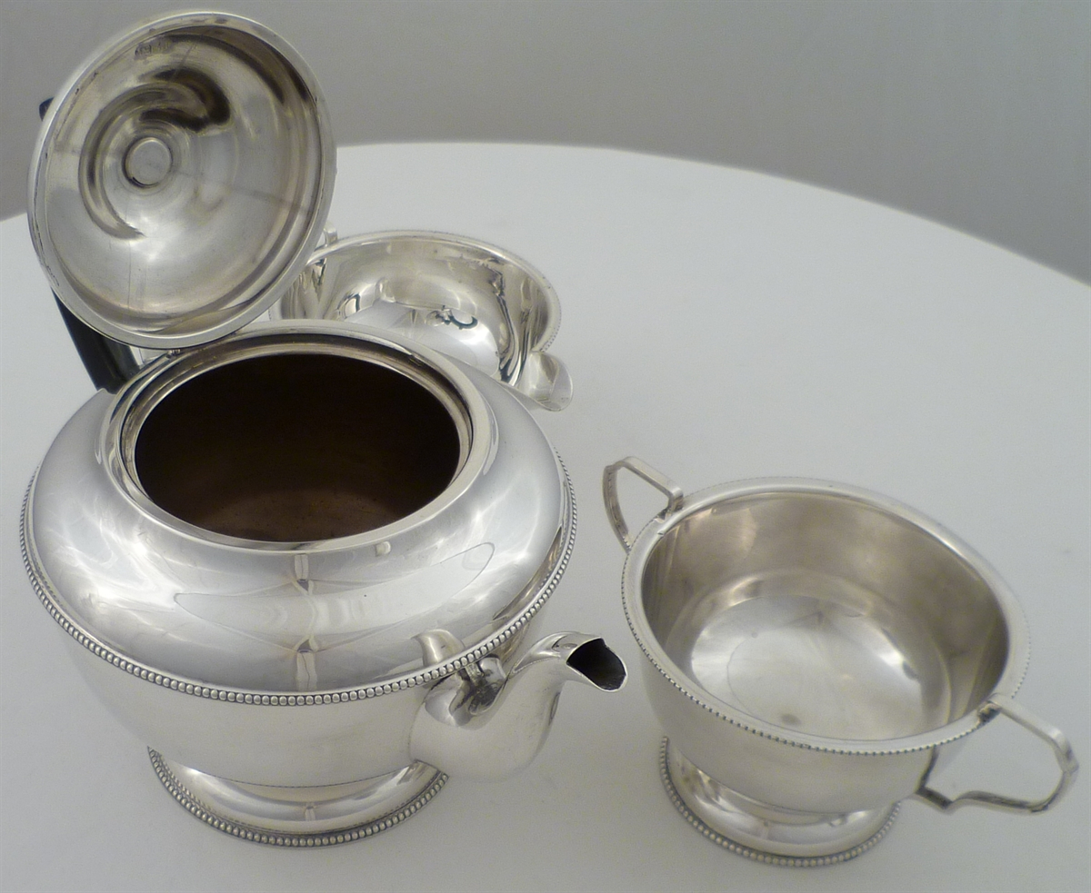 DESCRIPTION | Solid silver Art Deco three piece tea set with bead edge decoration and no engraving or erasure. Holds 1 ½ pints. |