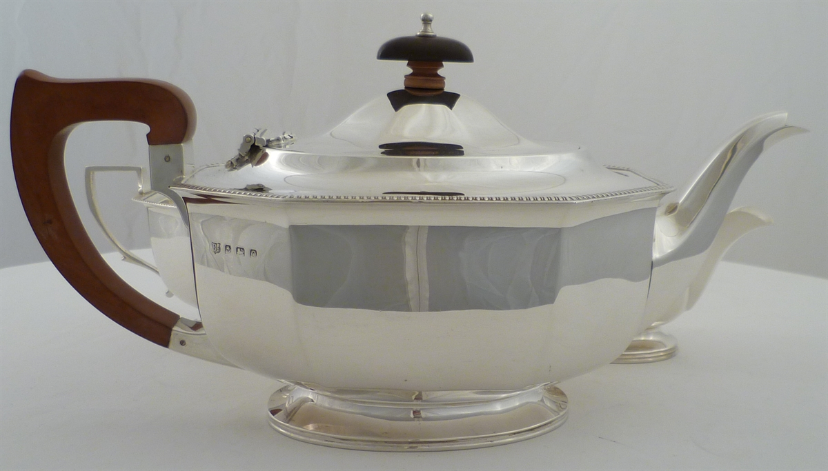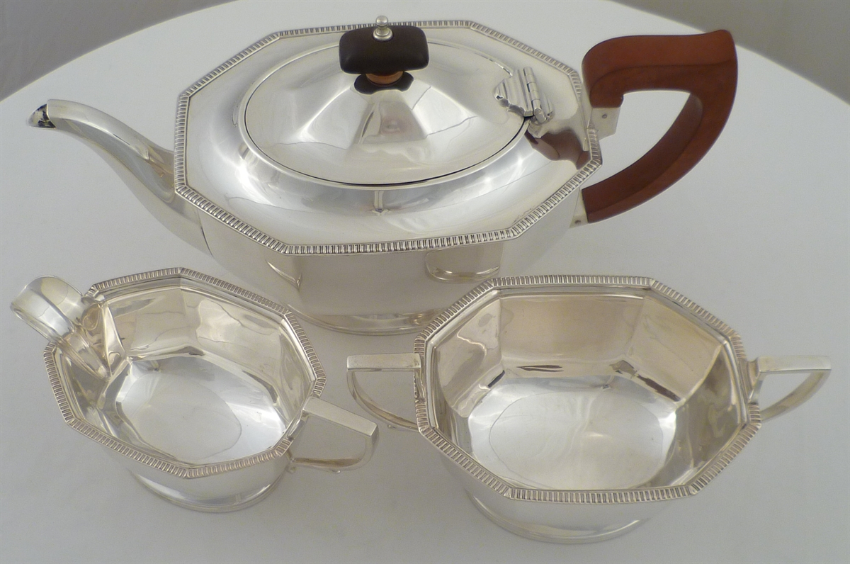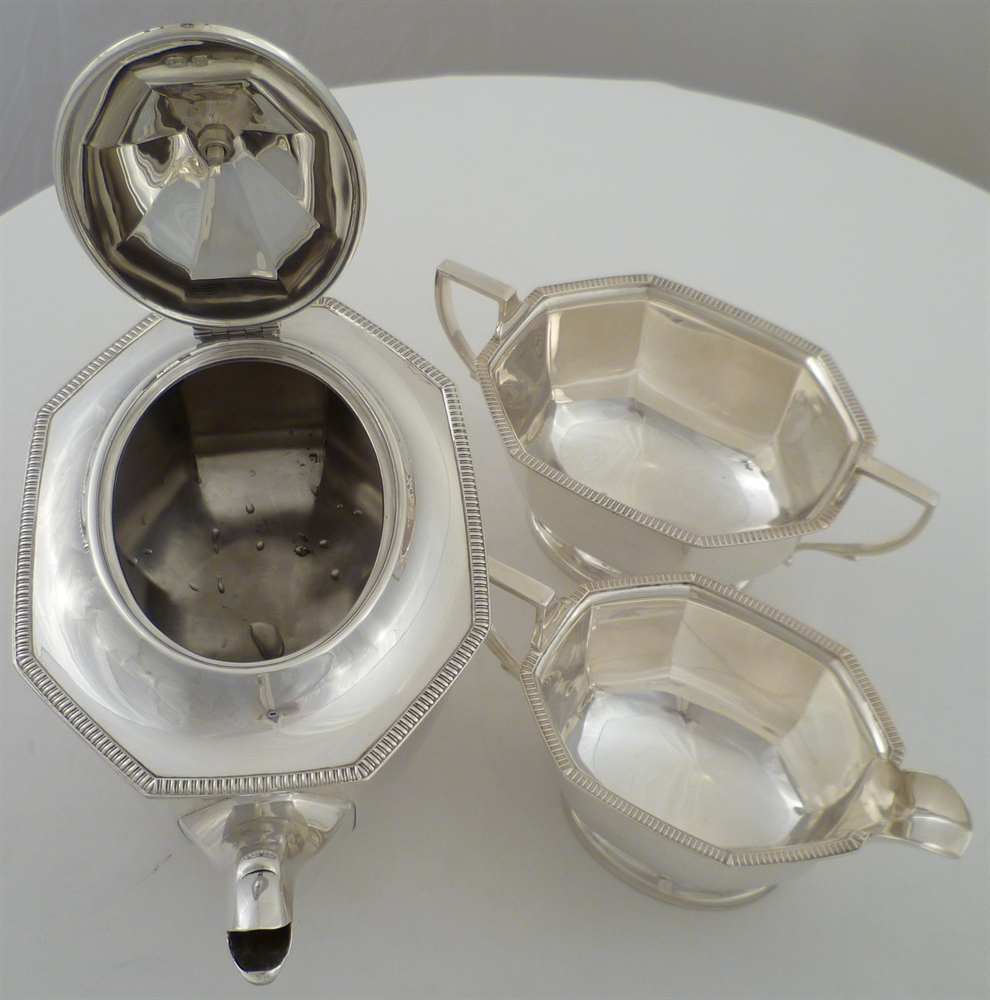 DESCRIPTION | Good solid silver three piece tea set with gadroon decorated top rims. Tea pot holds 1 ¾ pints. |