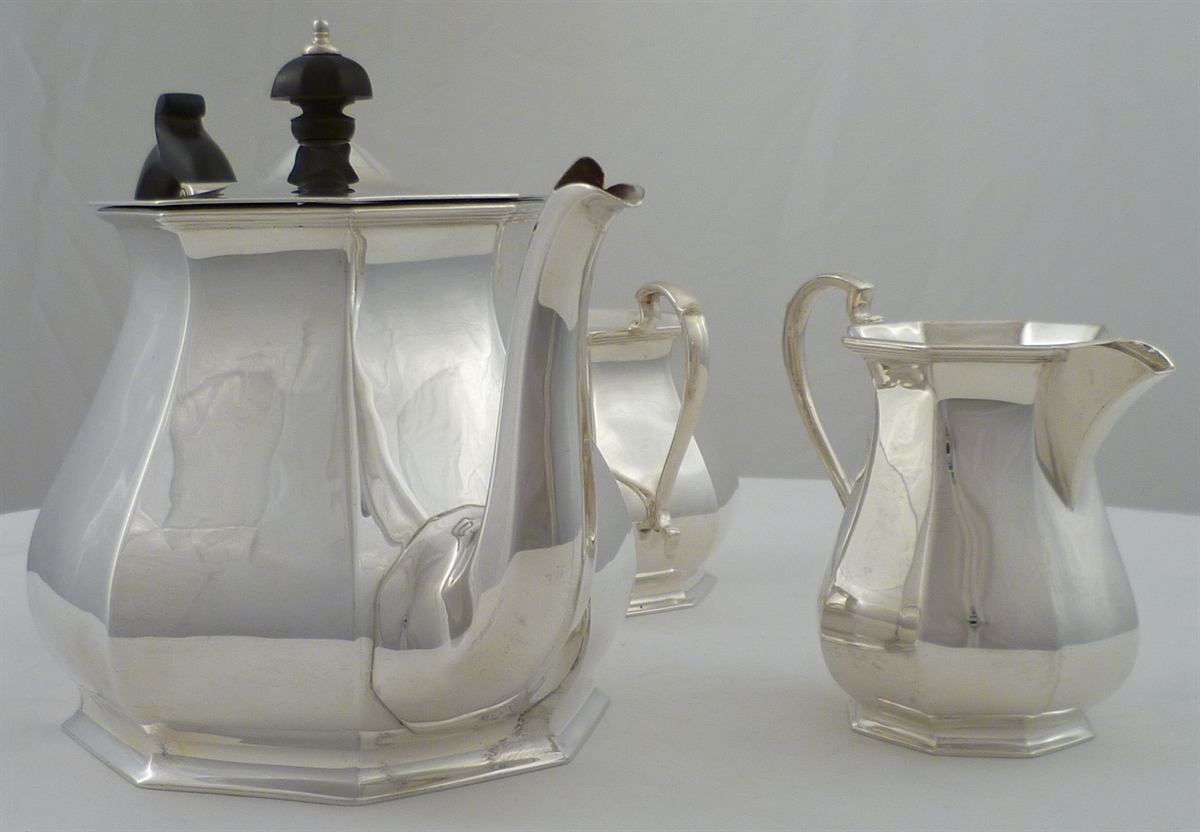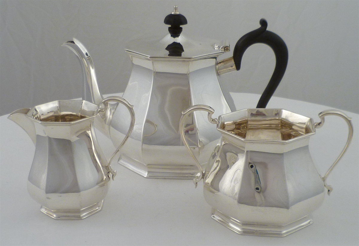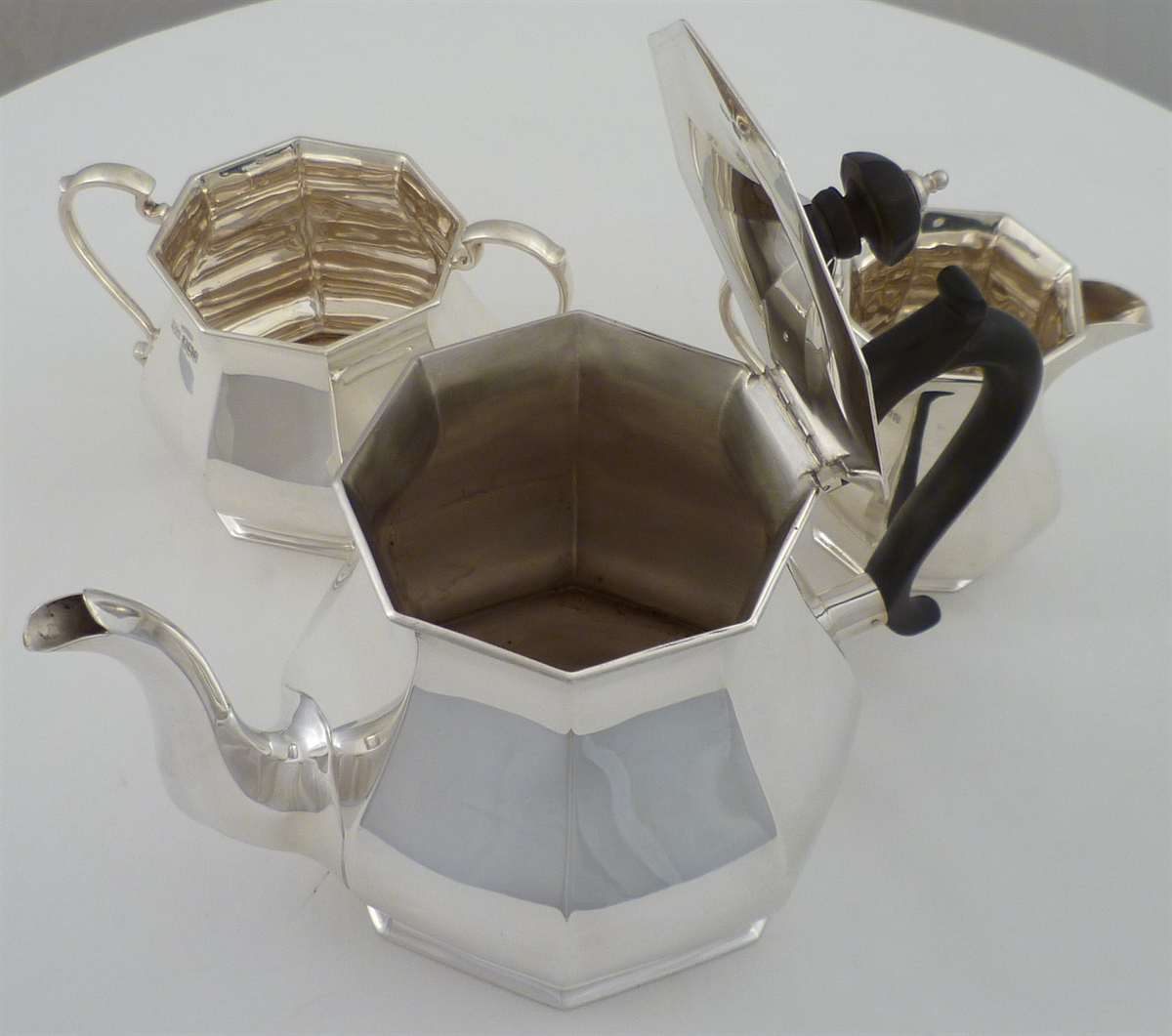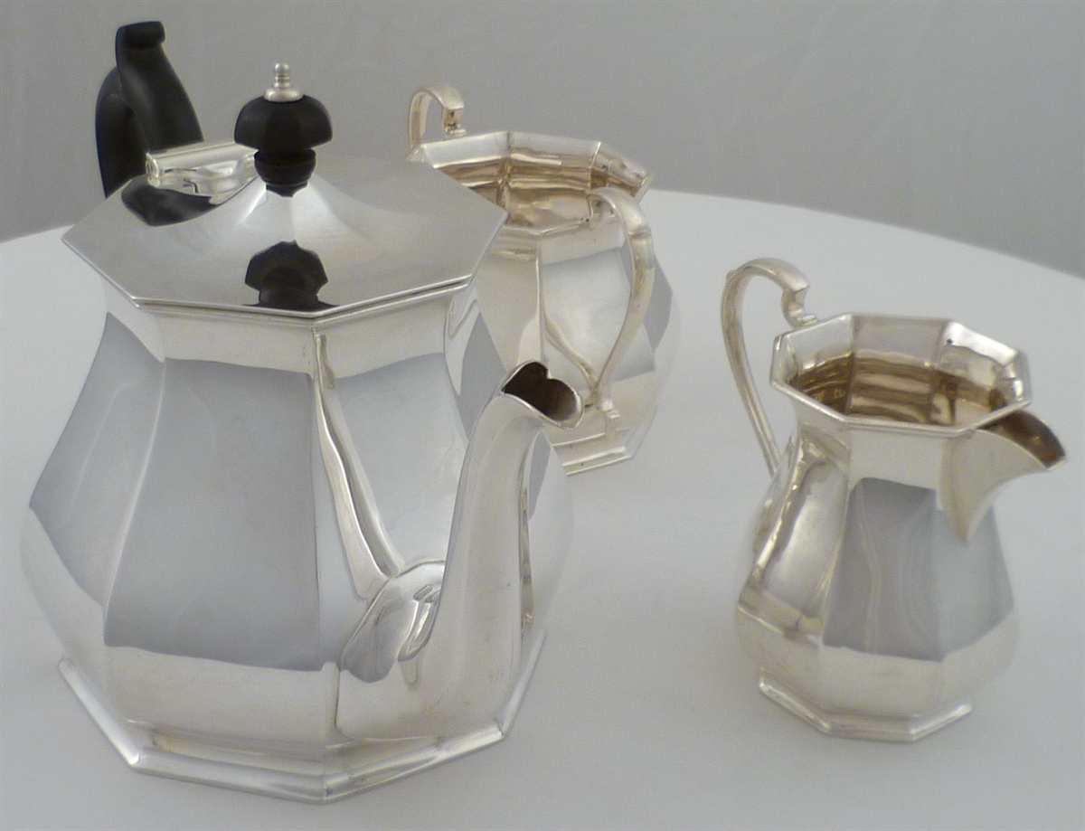 DESCRIPTION | High quality and very stylish Arts & Crafts solid silver three piece tea set. Tea pot holds 1200ml, just over 2 pints. |