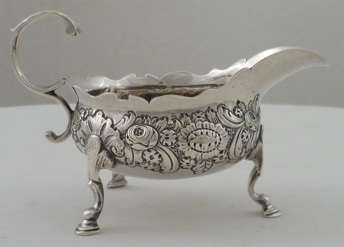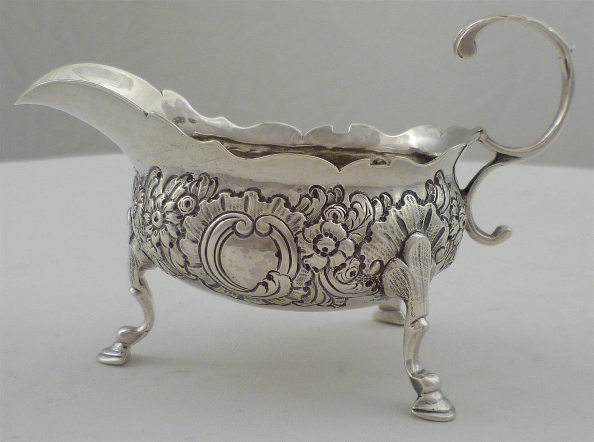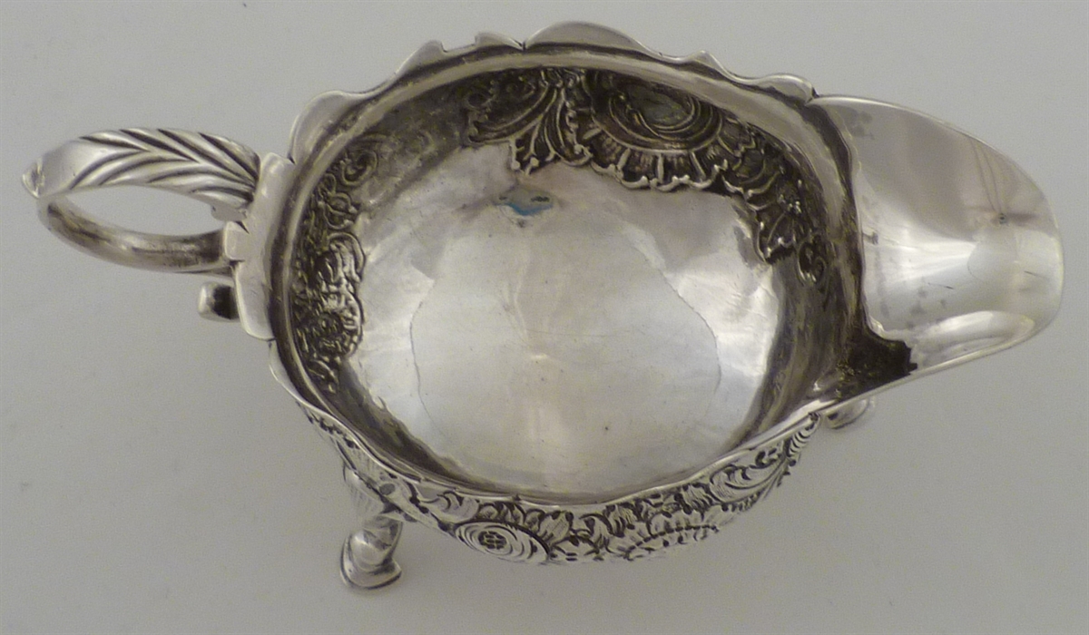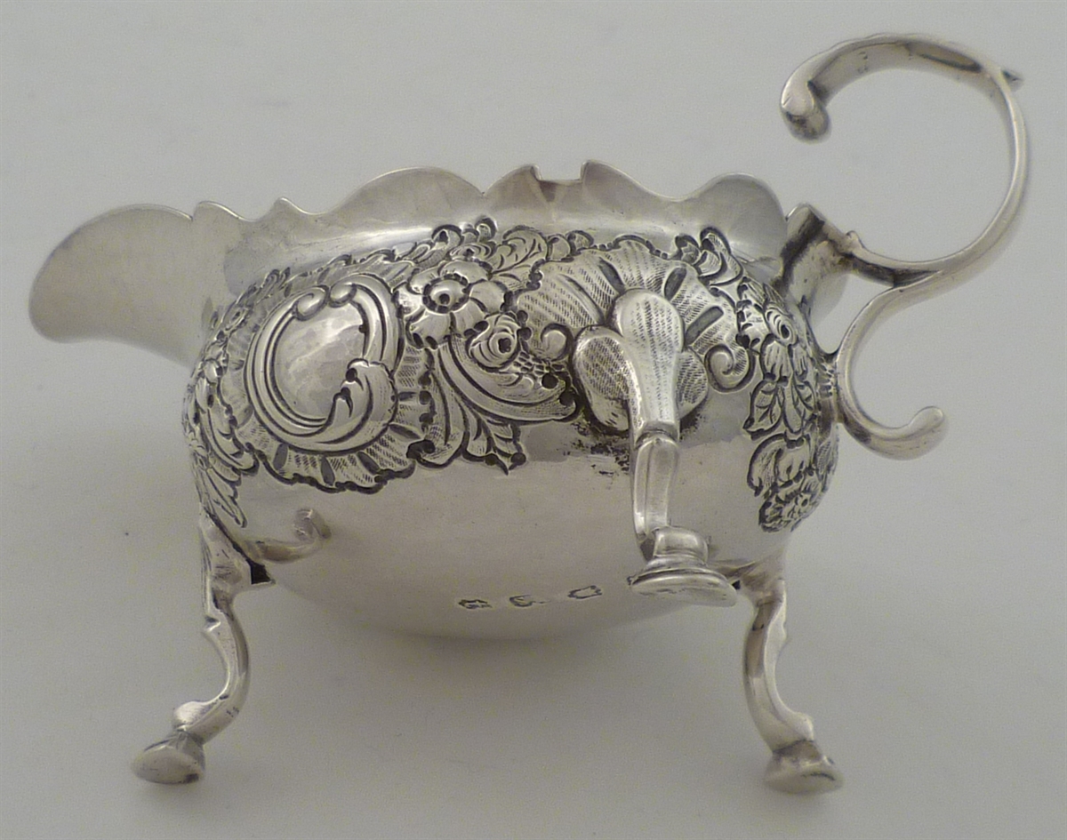 DESCRIPTION | Georgian solid silver cream boat with a flying leaf capped 'C' scroll handle, three hoof feet and embossed and engraved decoration. |