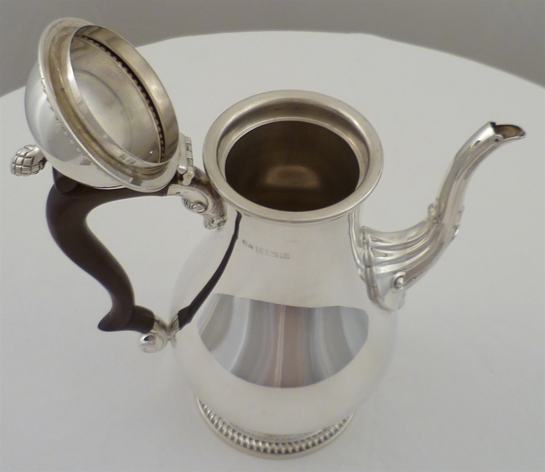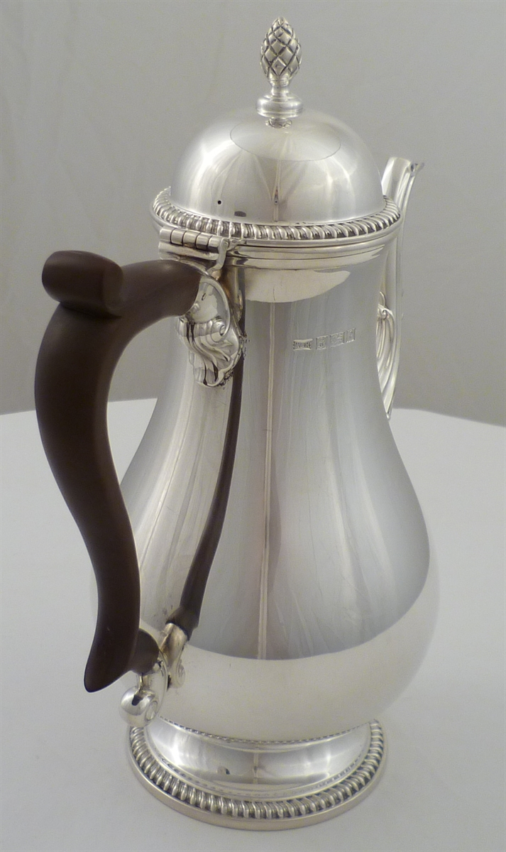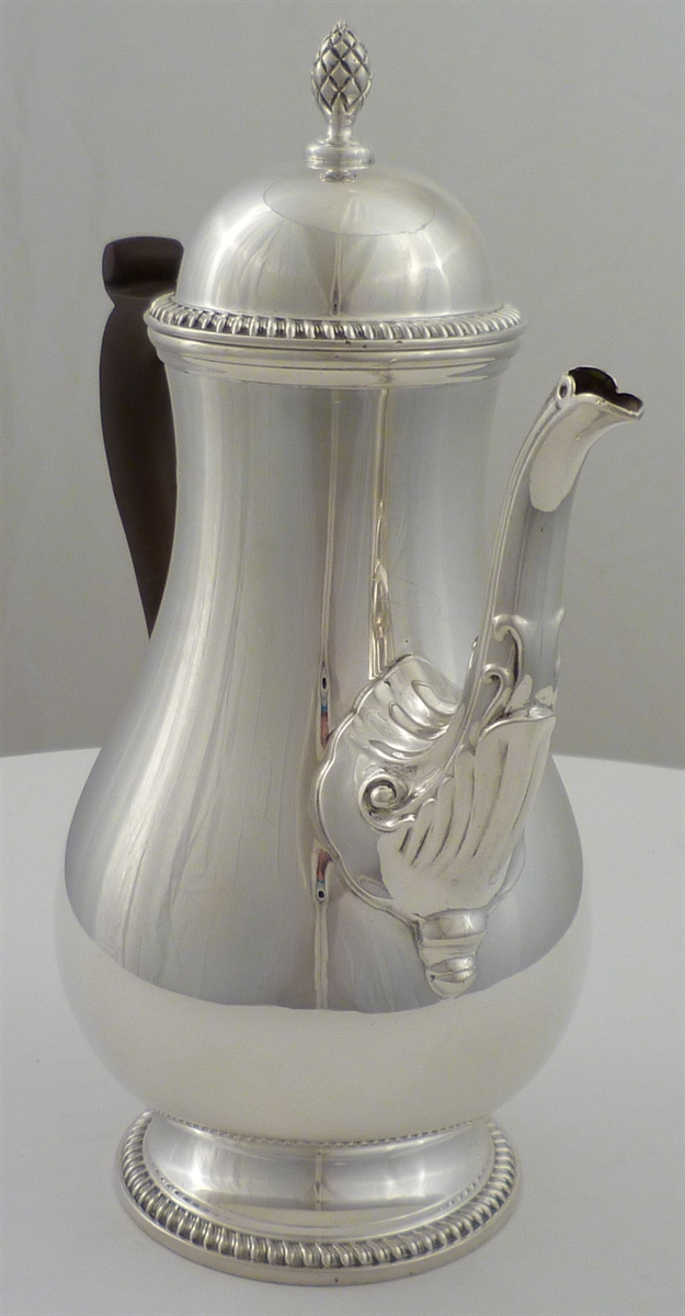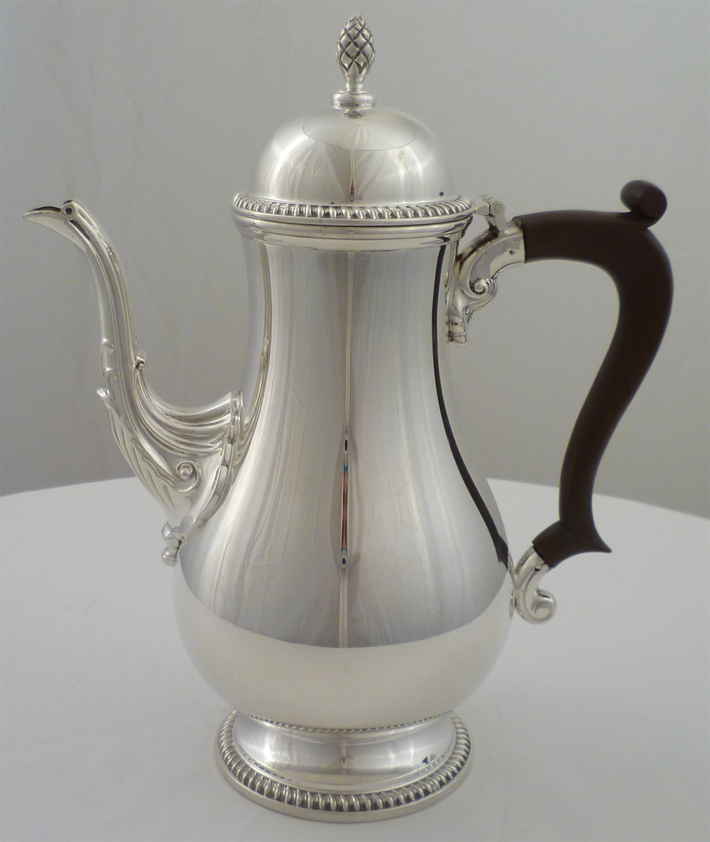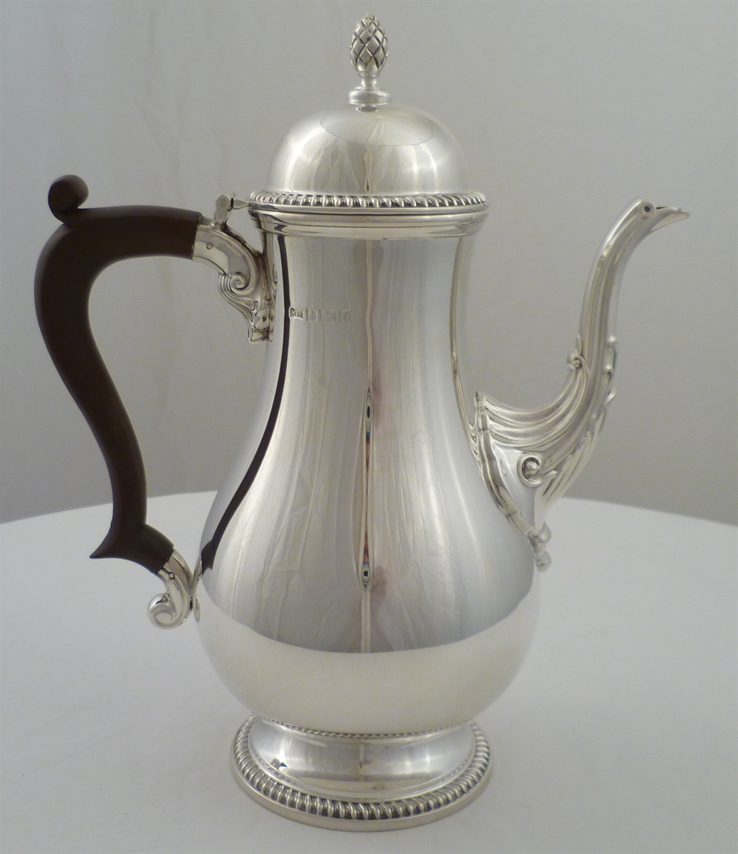 DESCRIPTION | Superb quality solid silver 1760's style coffee pot with a bulbous body, dome lid and pineapple finial. Holds 1 ½ pints, 850ml and is an excellent pourer, no drips. |