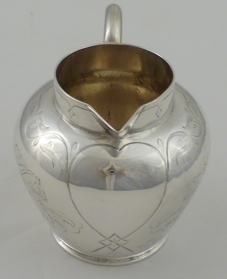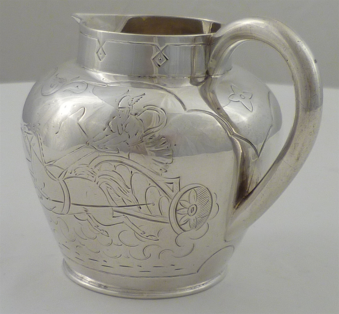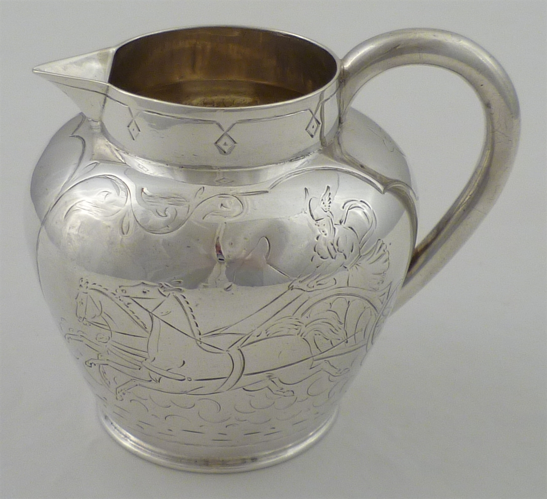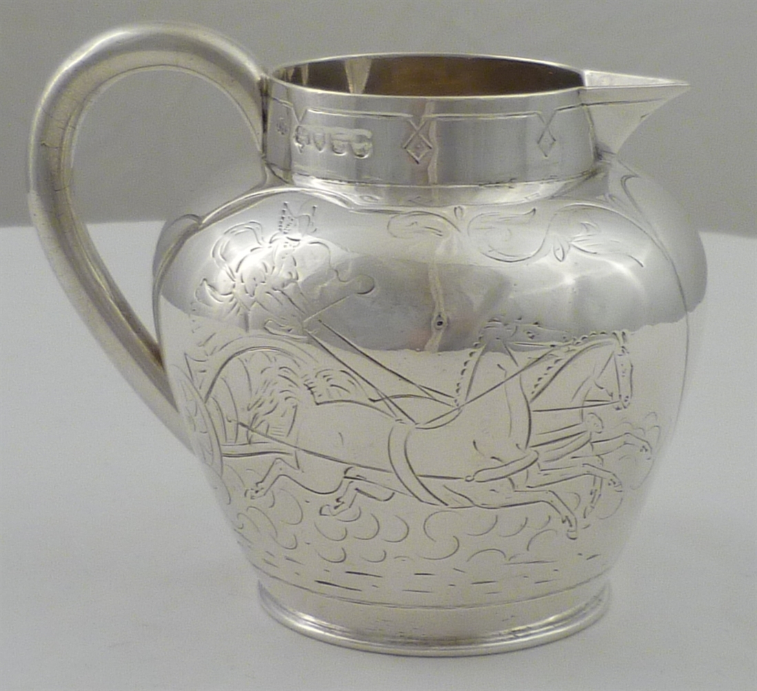 DESCRIPTION | Unusual Victorian solid silver jug decorated with engraved chariots. |