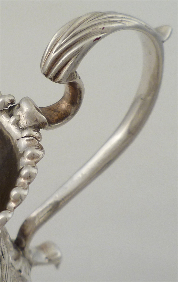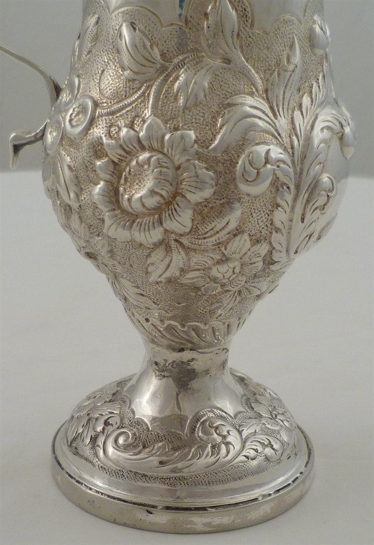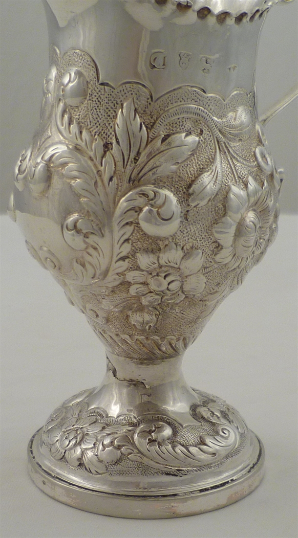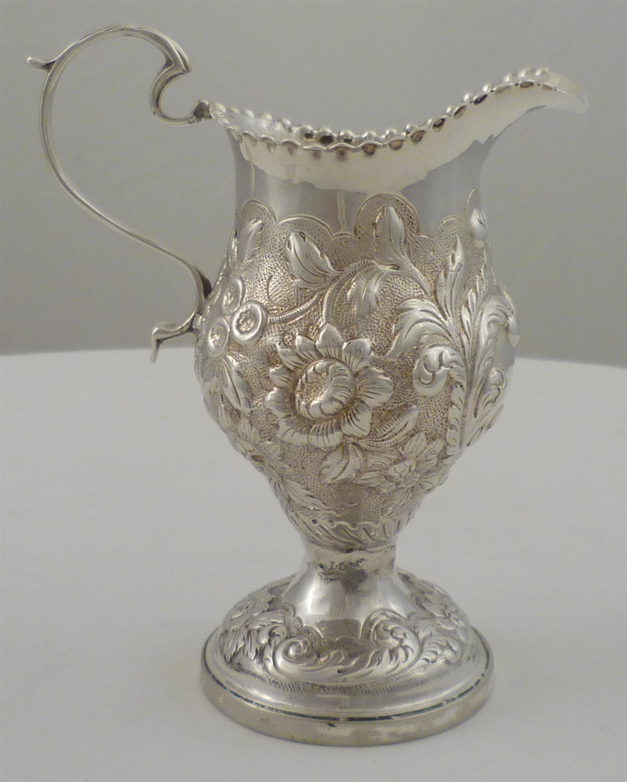 DESCRIPTION | Georgian solid silver pedestal cream jug with a punched bead top rim, flying leaf capped 'C' scroll handle, embossed and engraved decoration and a blank cartouche. |