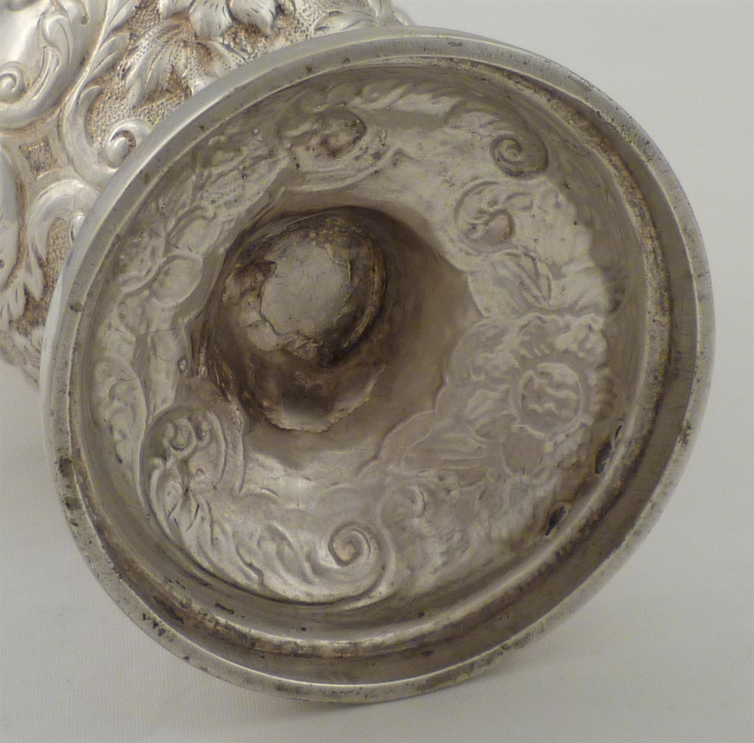 CONDITION | silver surprisingly thick, small split to the rim either side of the top handle joint, bottom handle joint may have been redone, significant old repair to pedestal stem leaving body with slight lean |