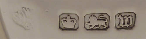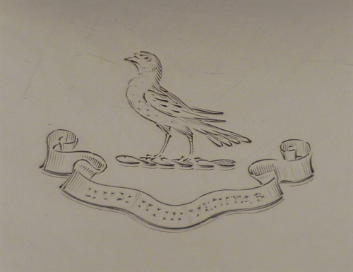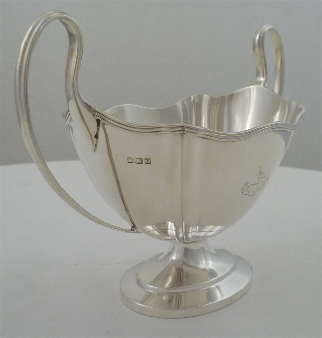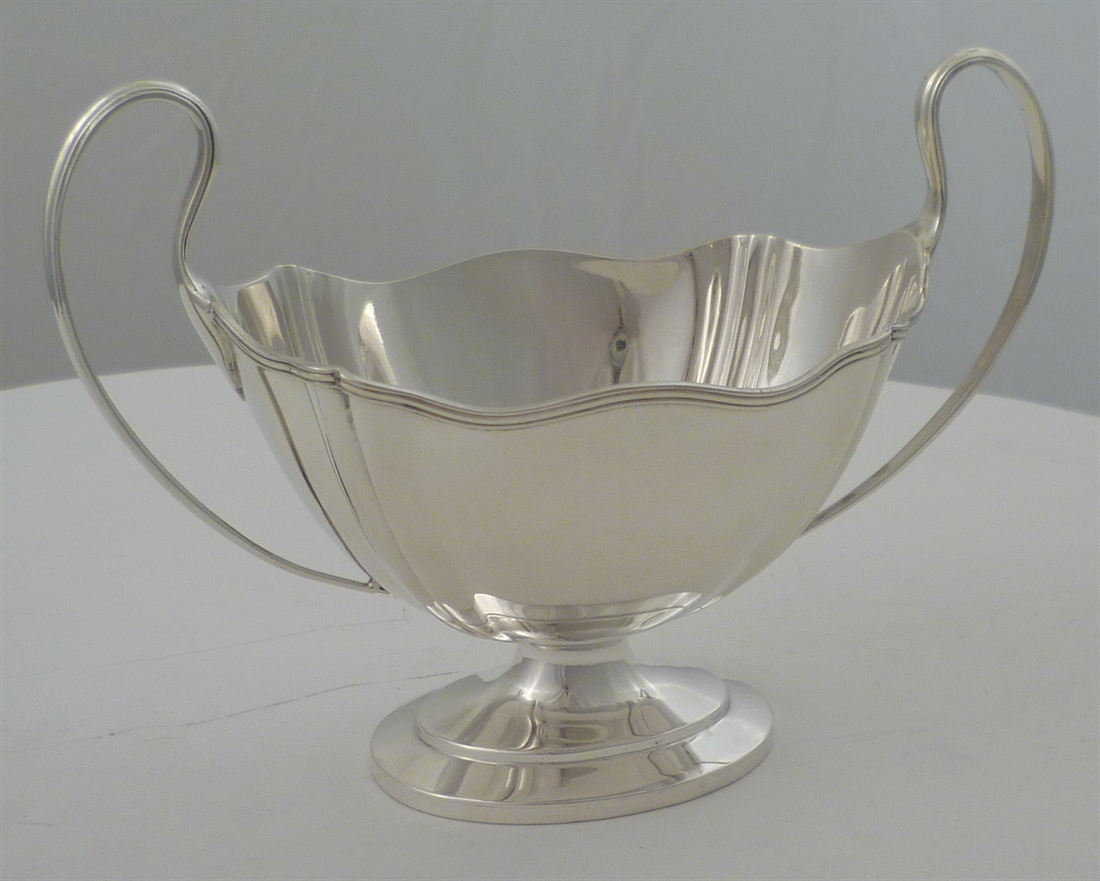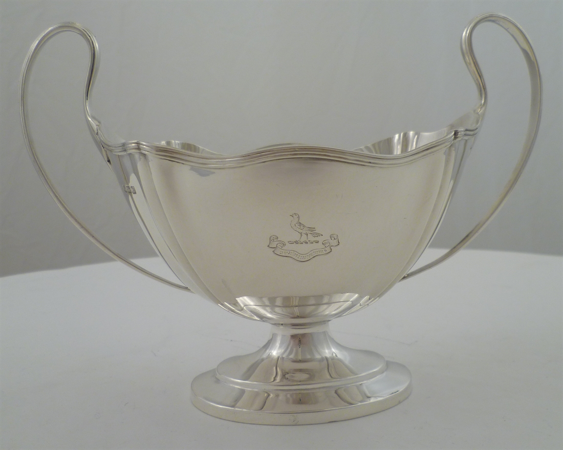DESCRIPTION | High quality solid English silver neo classical two handled pedestal bowl with a crest engraving above a motto. |