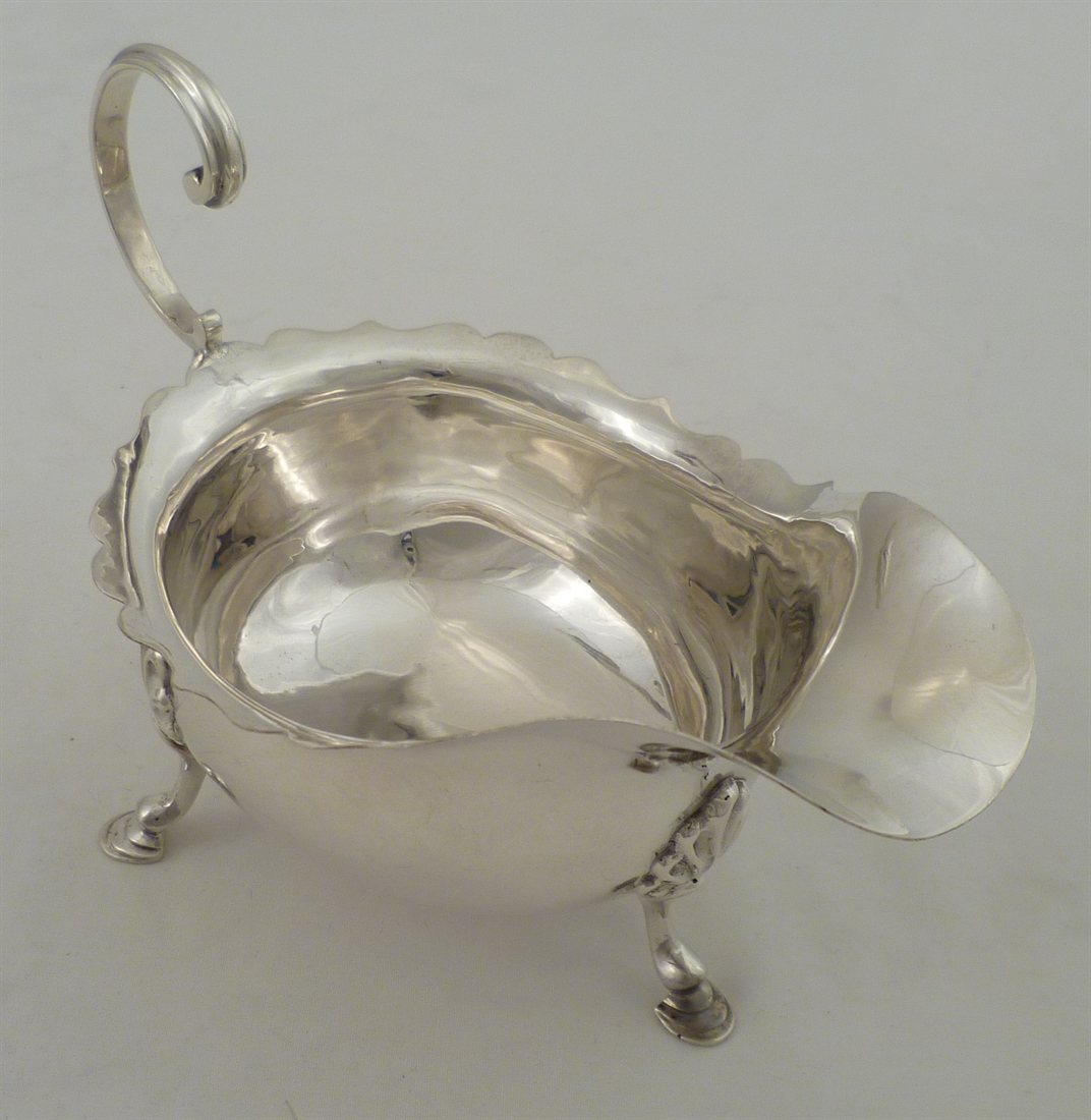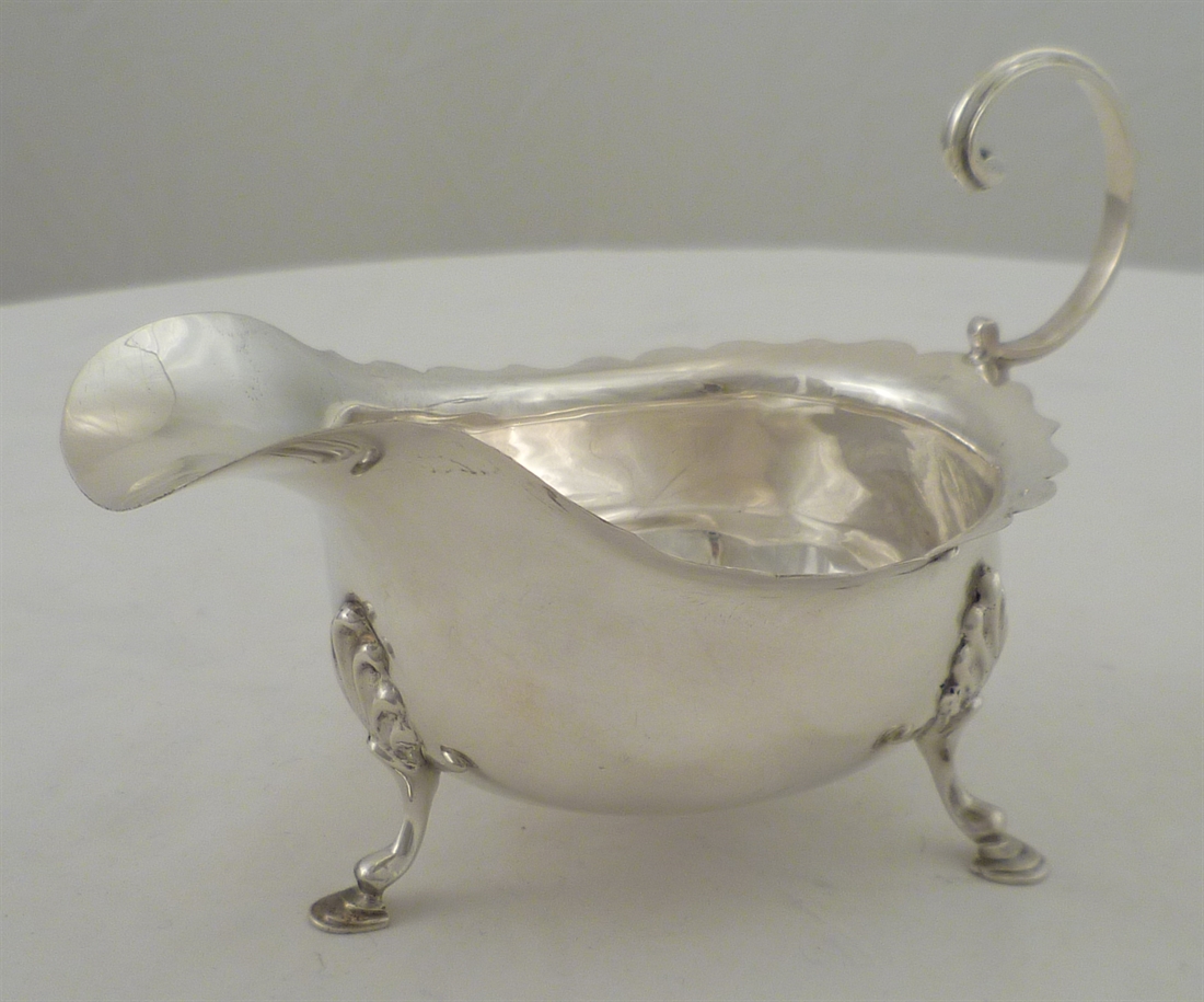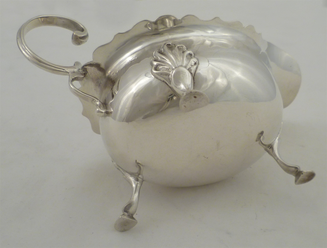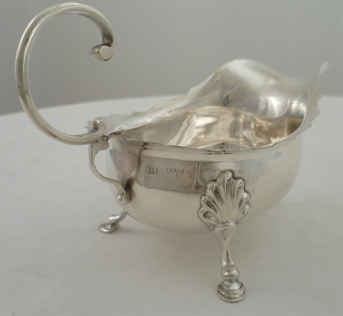 DESCRIPTION | Edwardian solid silver sauce or cream boat on three shell capped pad feet. |