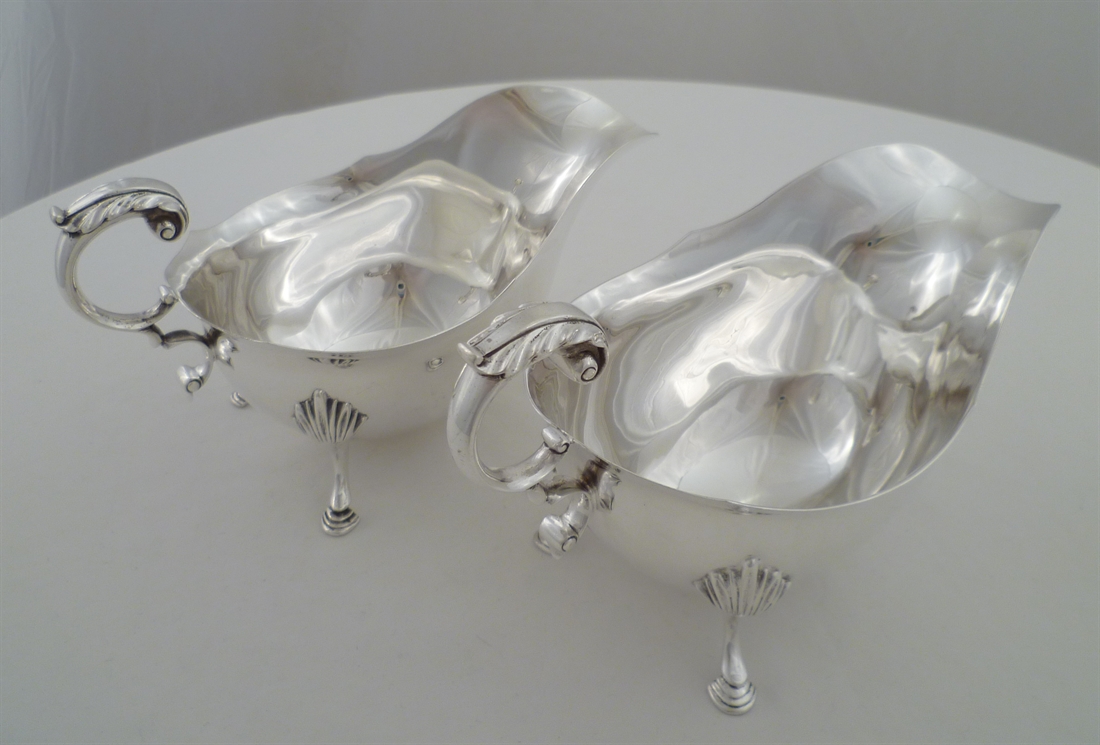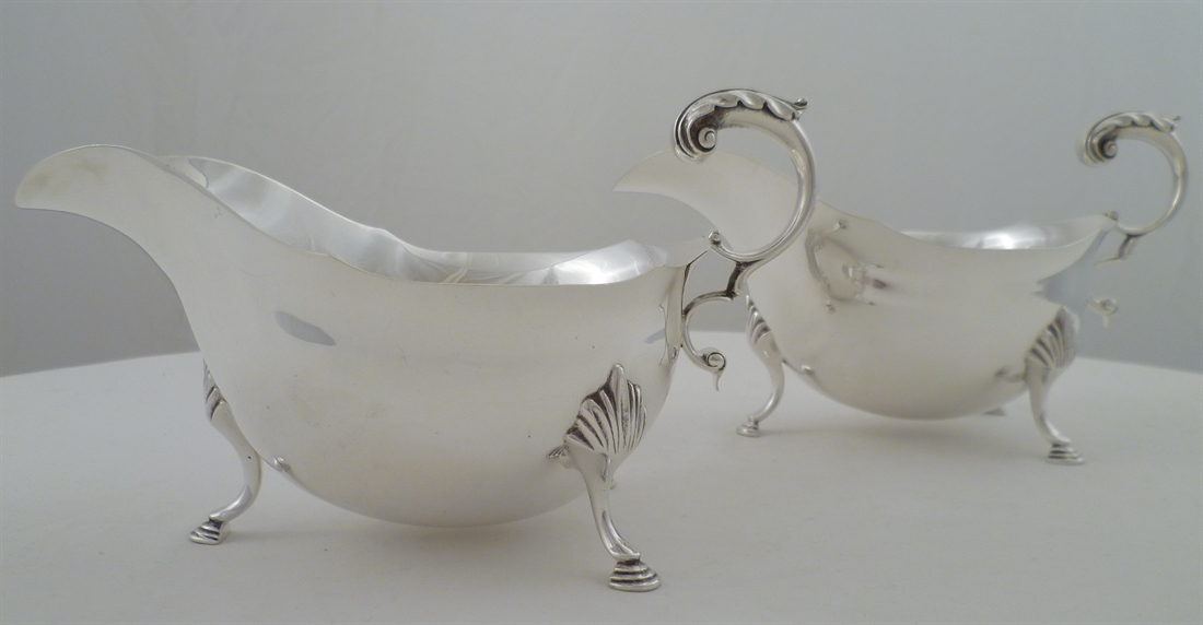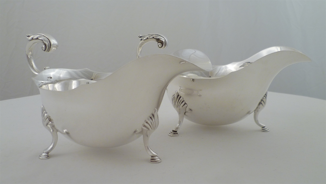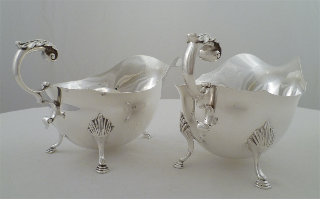 DESCRIPTION | Useful pair of solid silver sauce or gravy boats with flying leaf capped scrolling handles and shell capped hoof feet. Each holds a maximum of 12 fluid ounces or 350ml. |