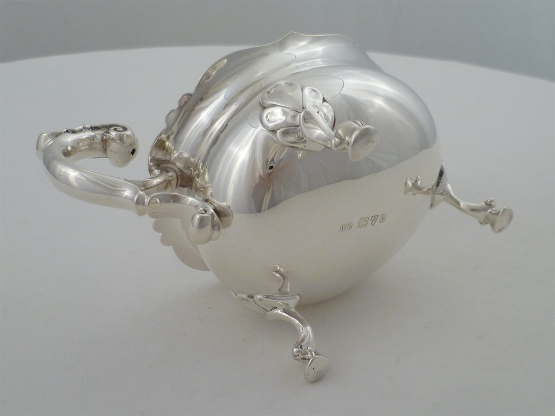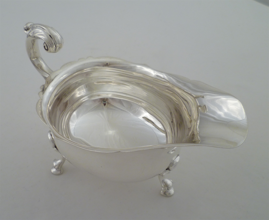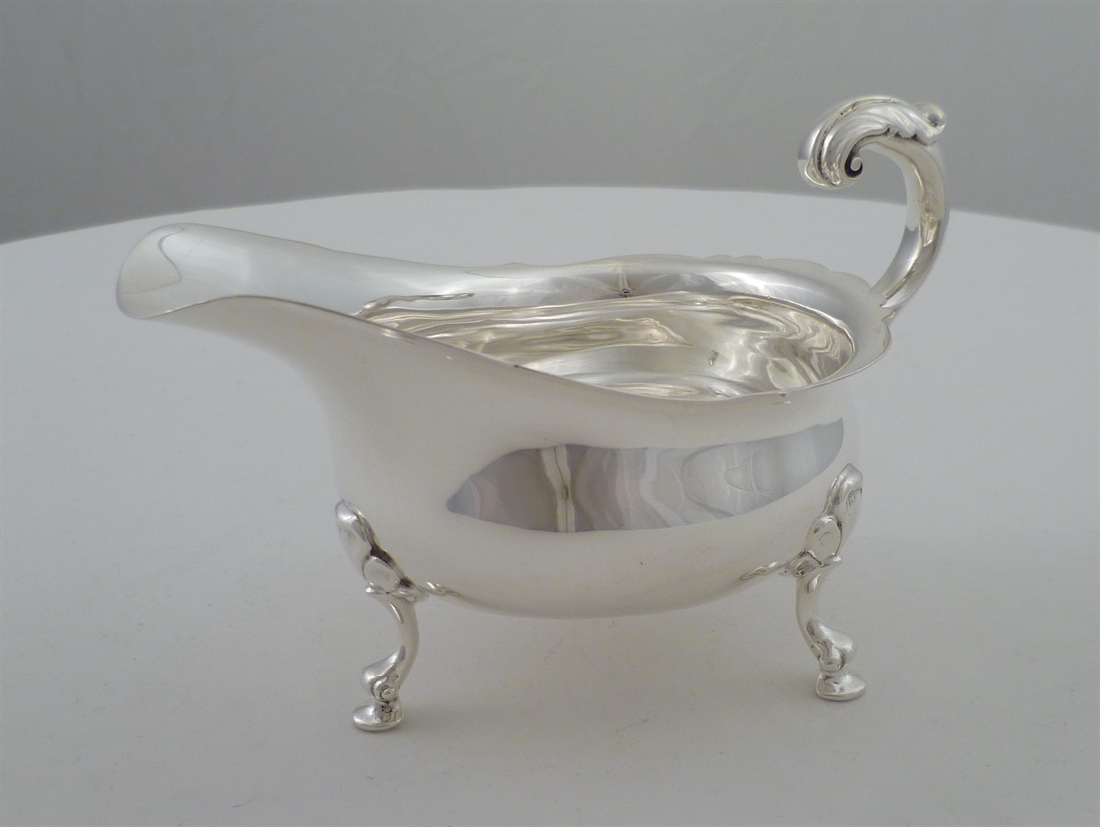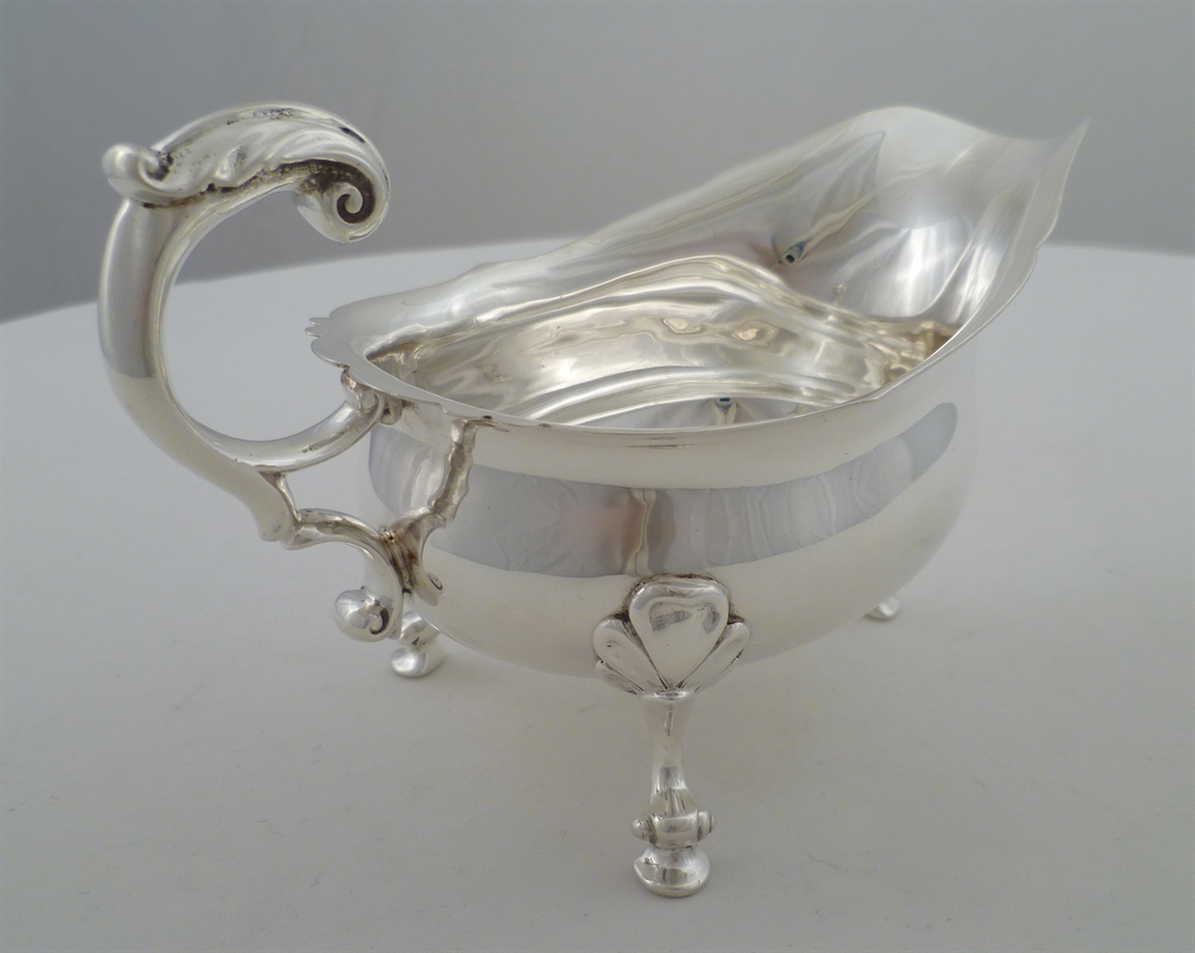 DESCRIPTION | Good English solid sterling silver sauce boat with a leaf capped scrolling handle and shell capped pad feet. |