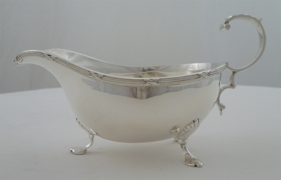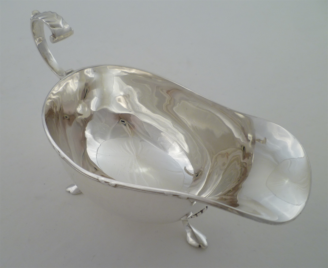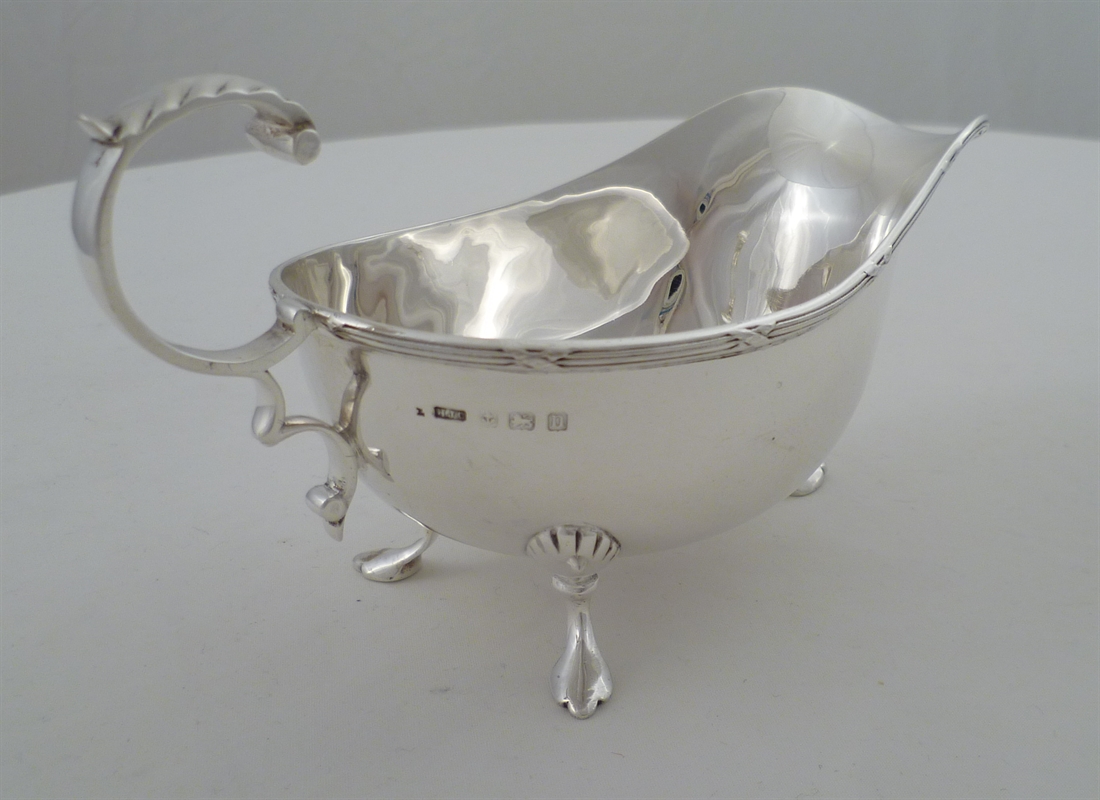 DESCRIPTION | Good English solid sterling silver sauce boat with a leaf capped scrolling handle, ribbon & thread top rim and shell capped feet. |