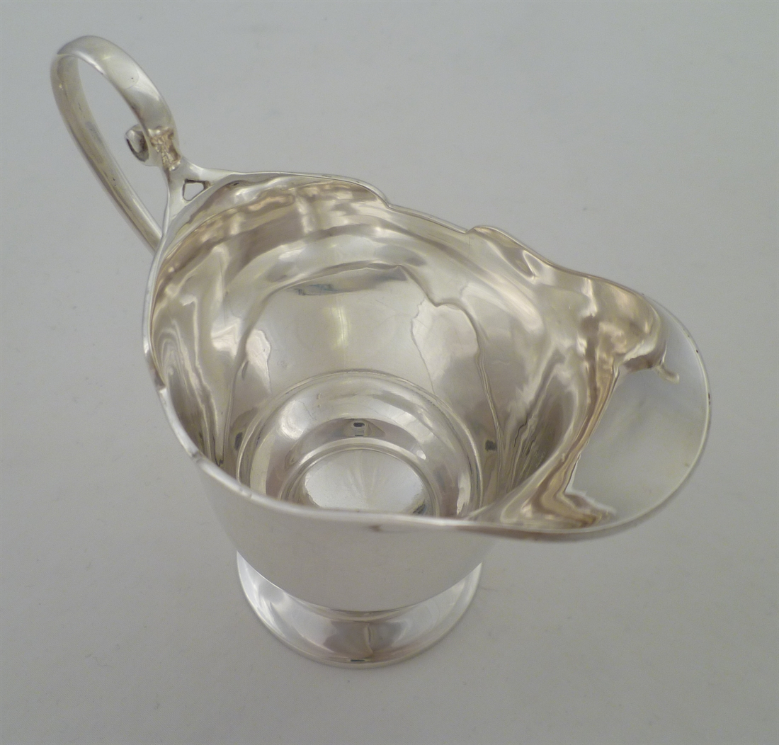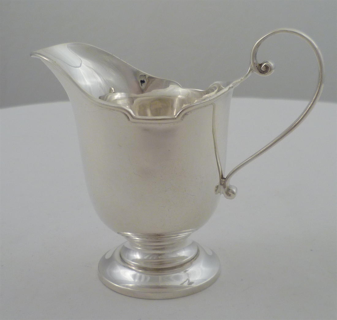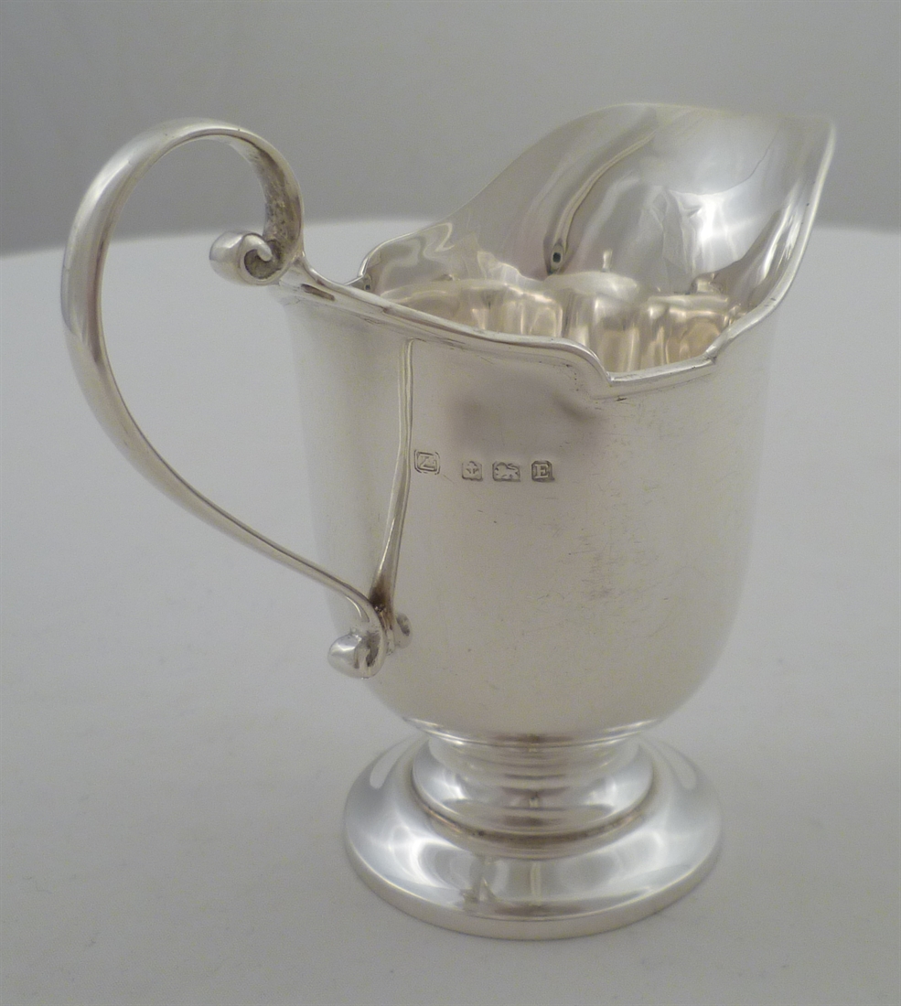 DESCRIPTION | Pretty little helmet form English solid silver cream jug with a pedestal base. |