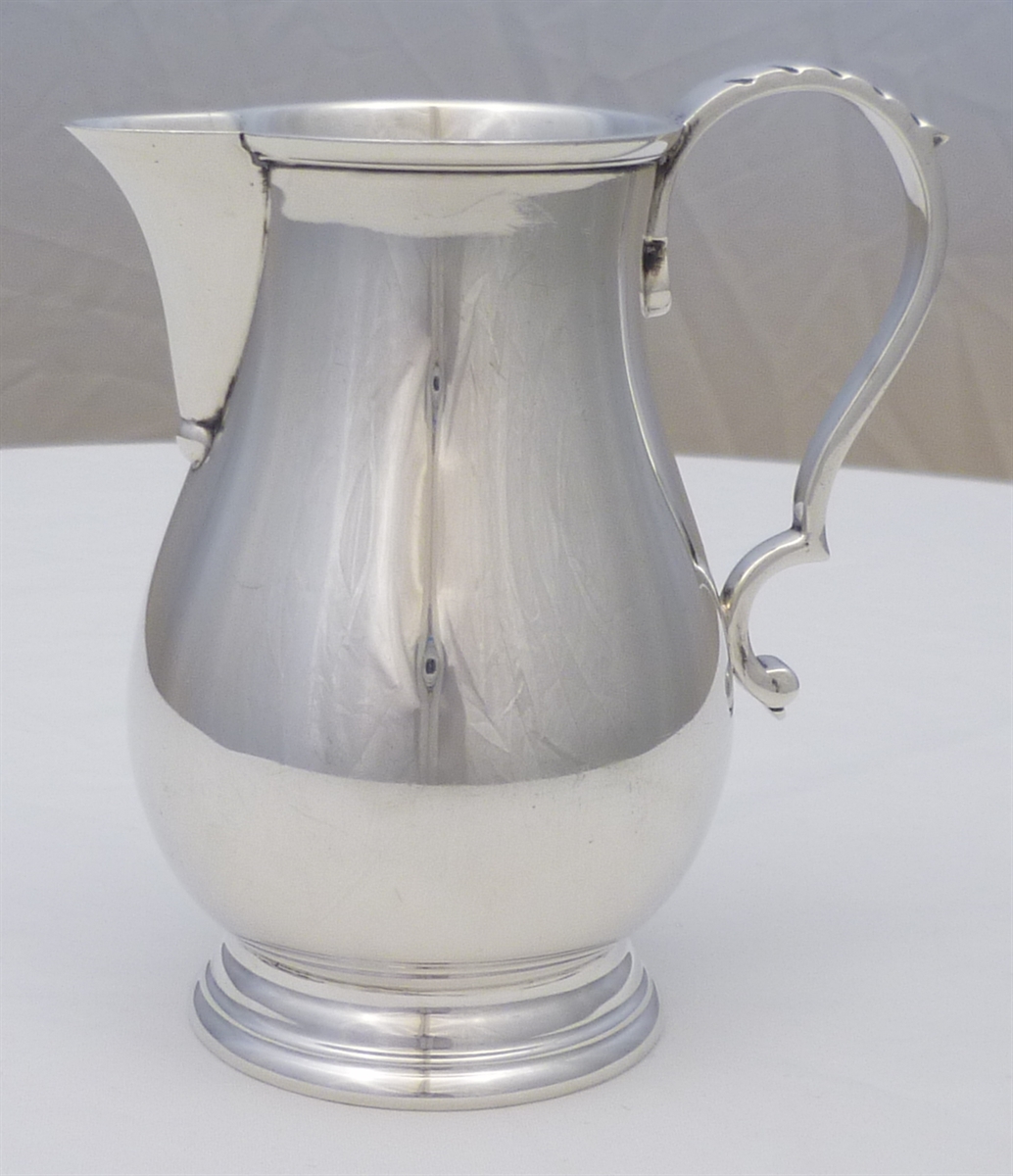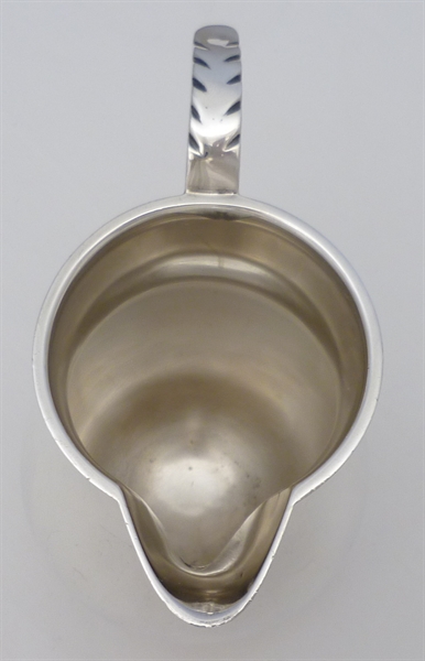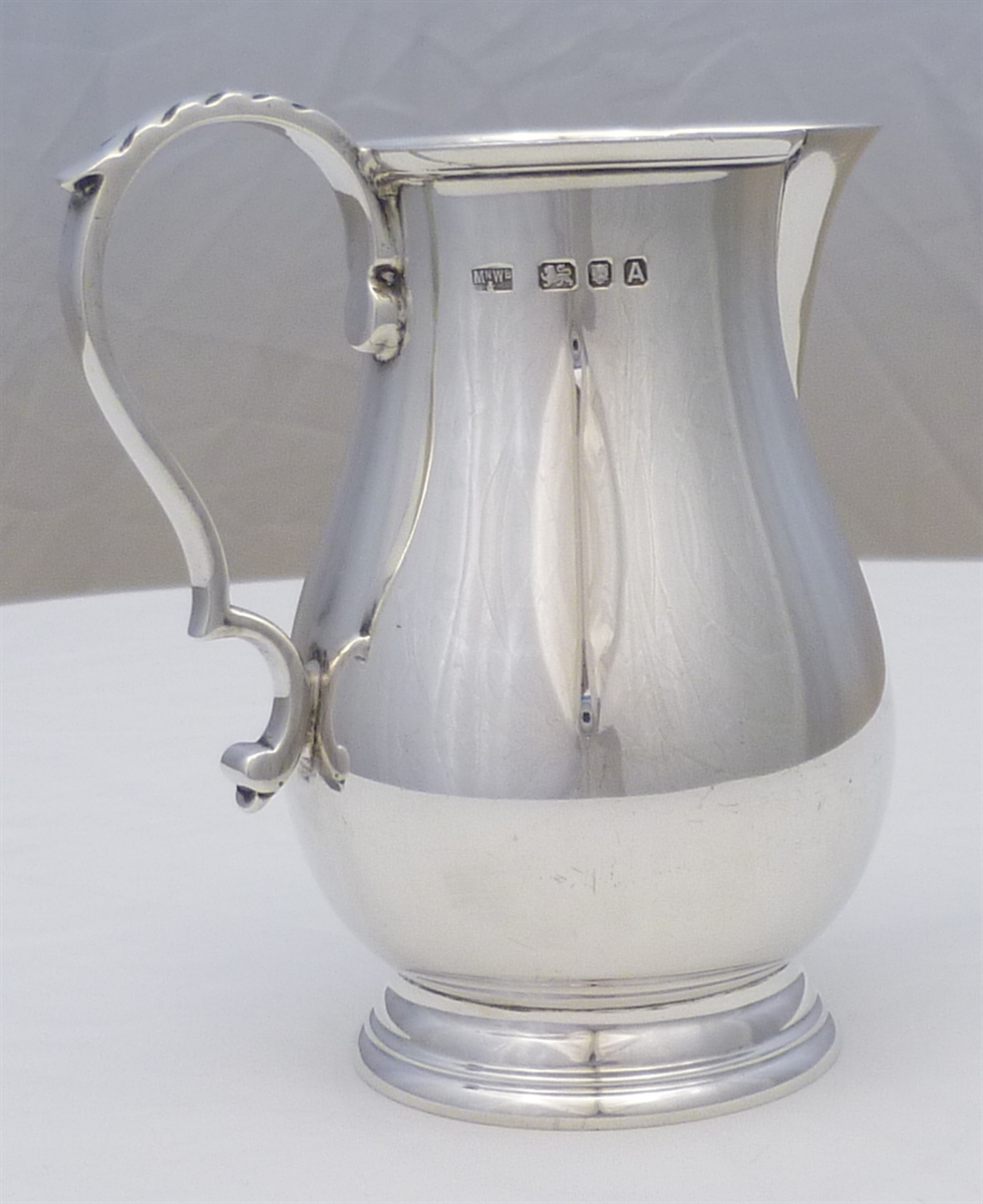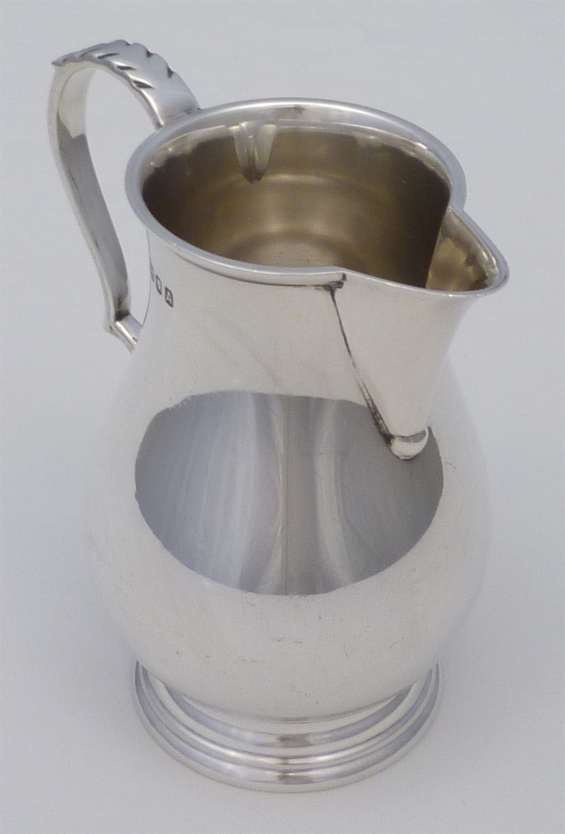 DESCRIPTION | Superb George I style (1720's) English solid sterling silver sparrow beak cream jug with bulbous body, ring turned foot and flying leaf capped scrolling handle. |
