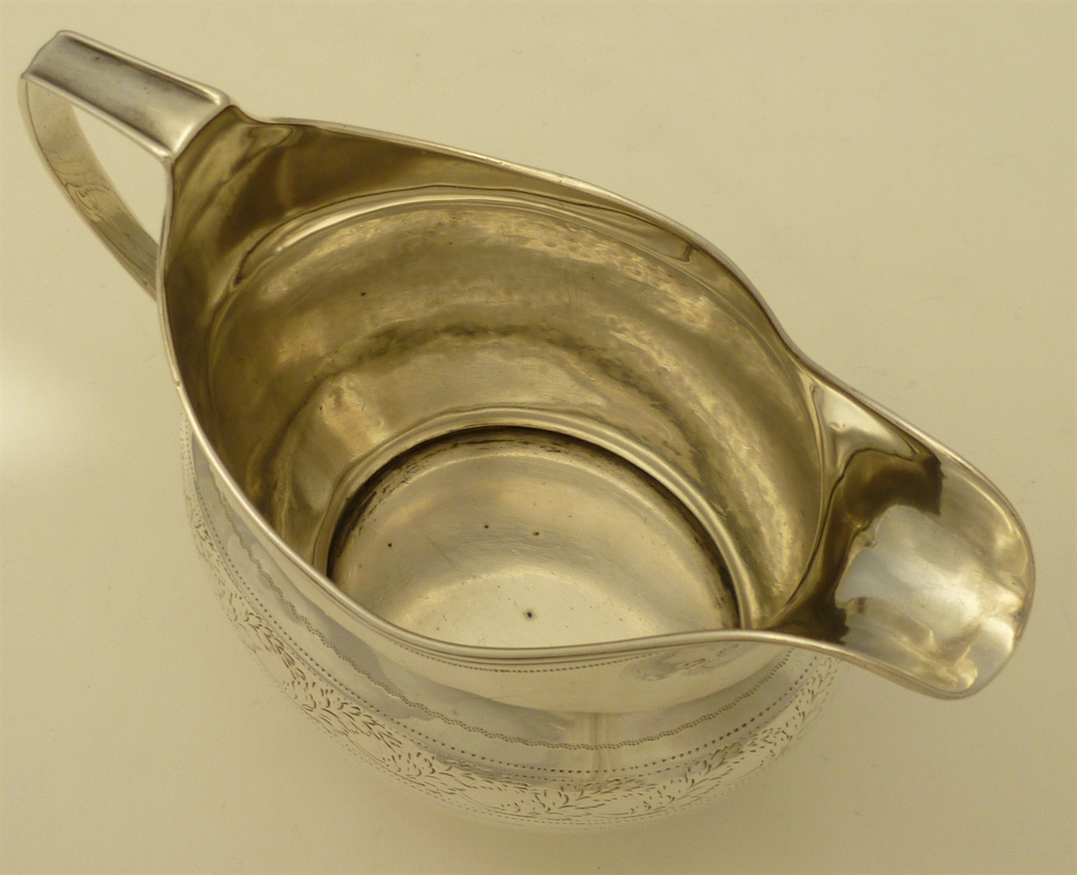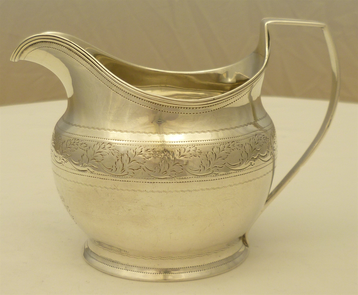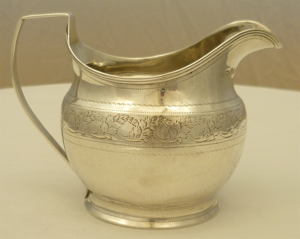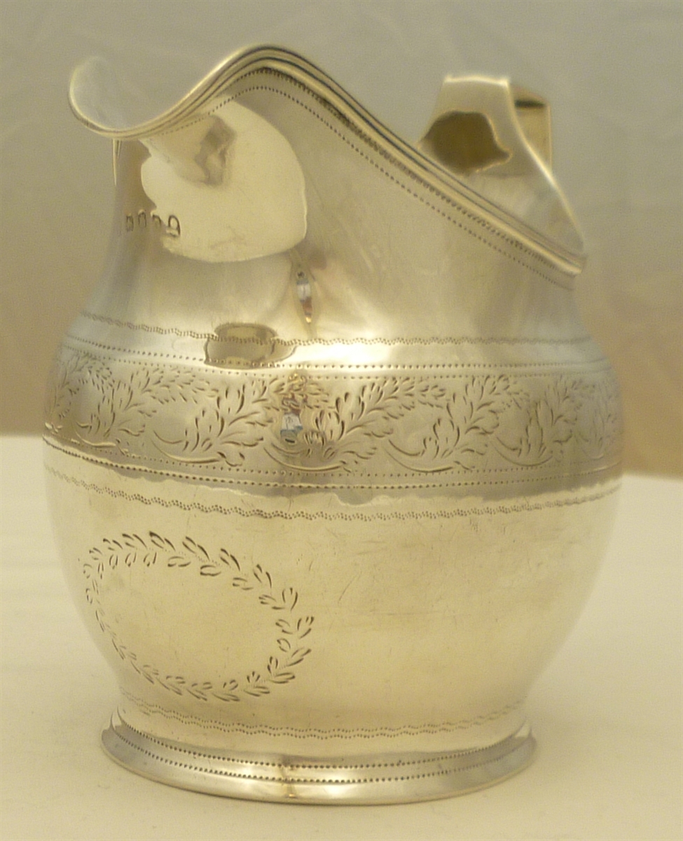 DESCRIPTION | Georgian solid sterling silver milk jug with a band of decorative foliate engraving, prick dot borders and thread lined top rim. The original assayer's scrape can still be seen on the base. |