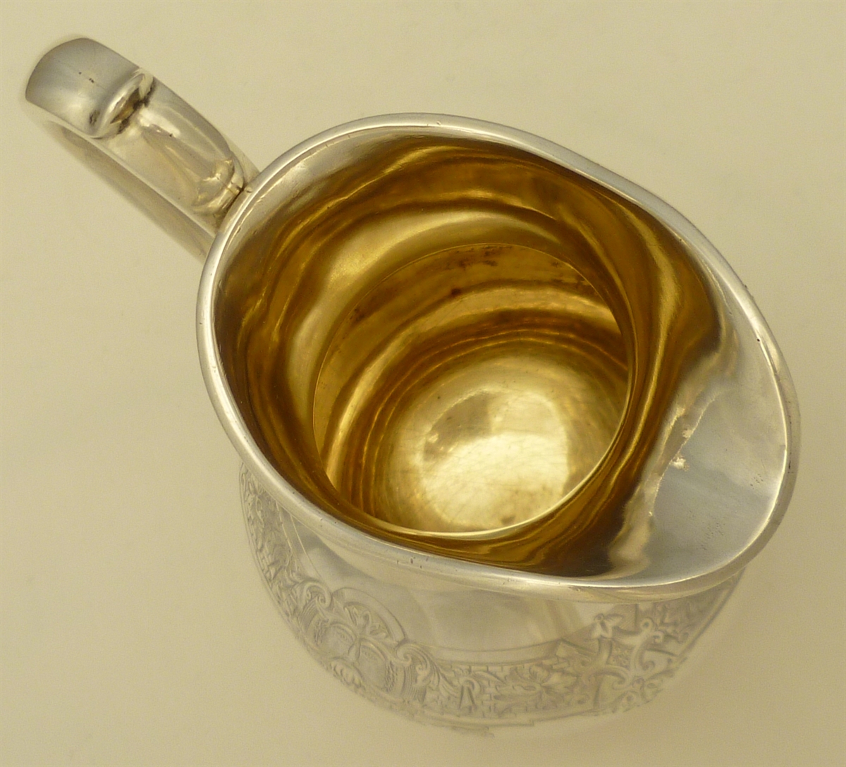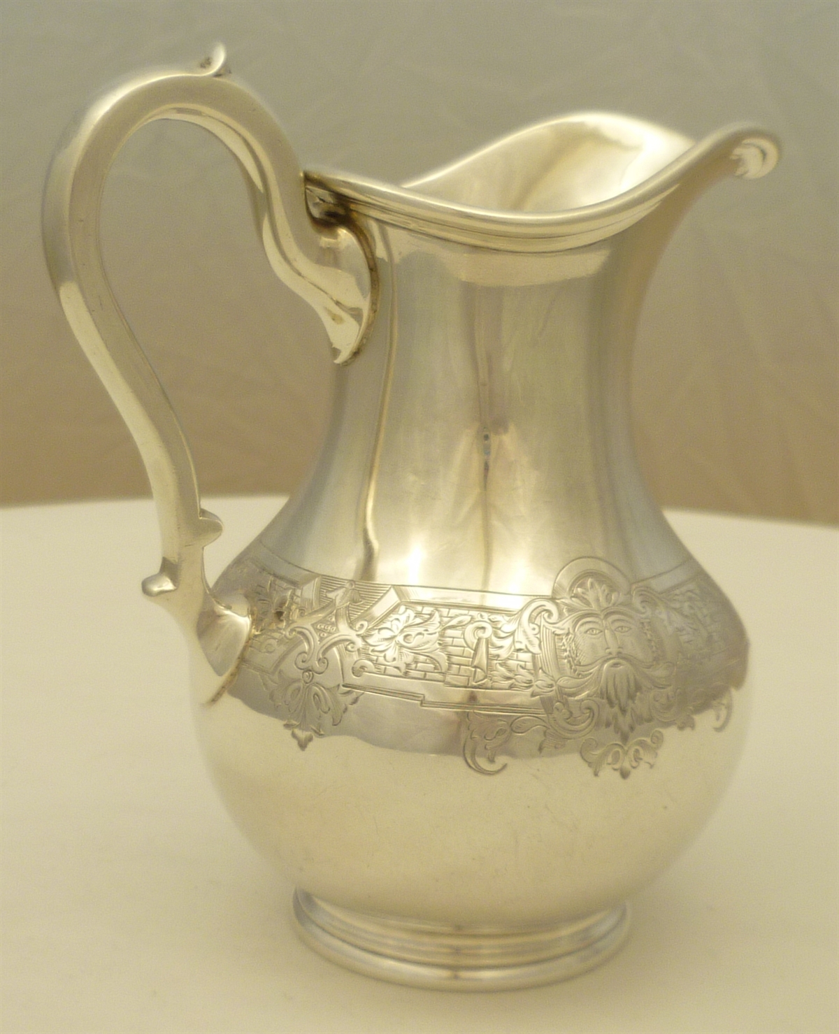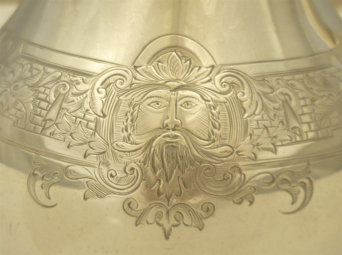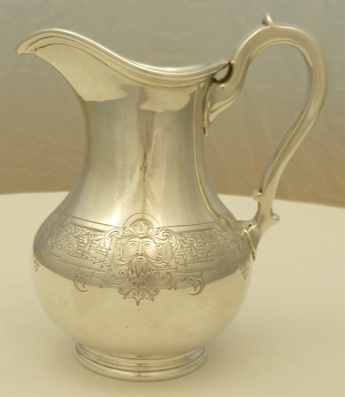 DESCRIPTION | Victorian solid sterling silver milk or cream jug with a gilded interior and engraved decorative central band. The unusual decoration contains two bearded male masks amongst stylised foliage that may represent The Green Man. |