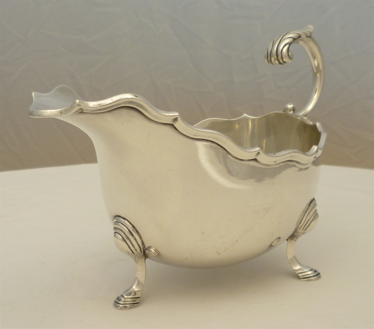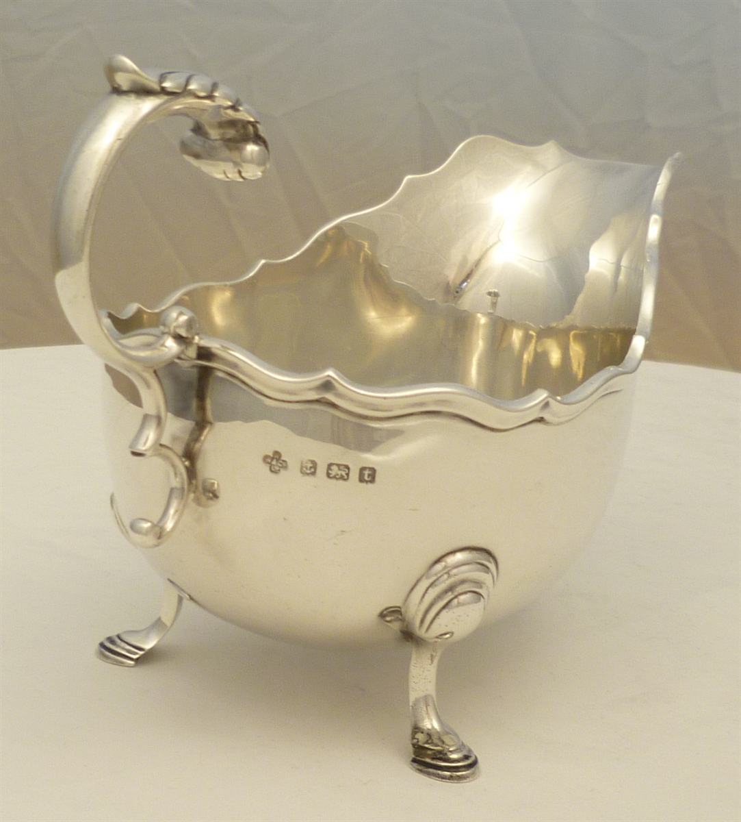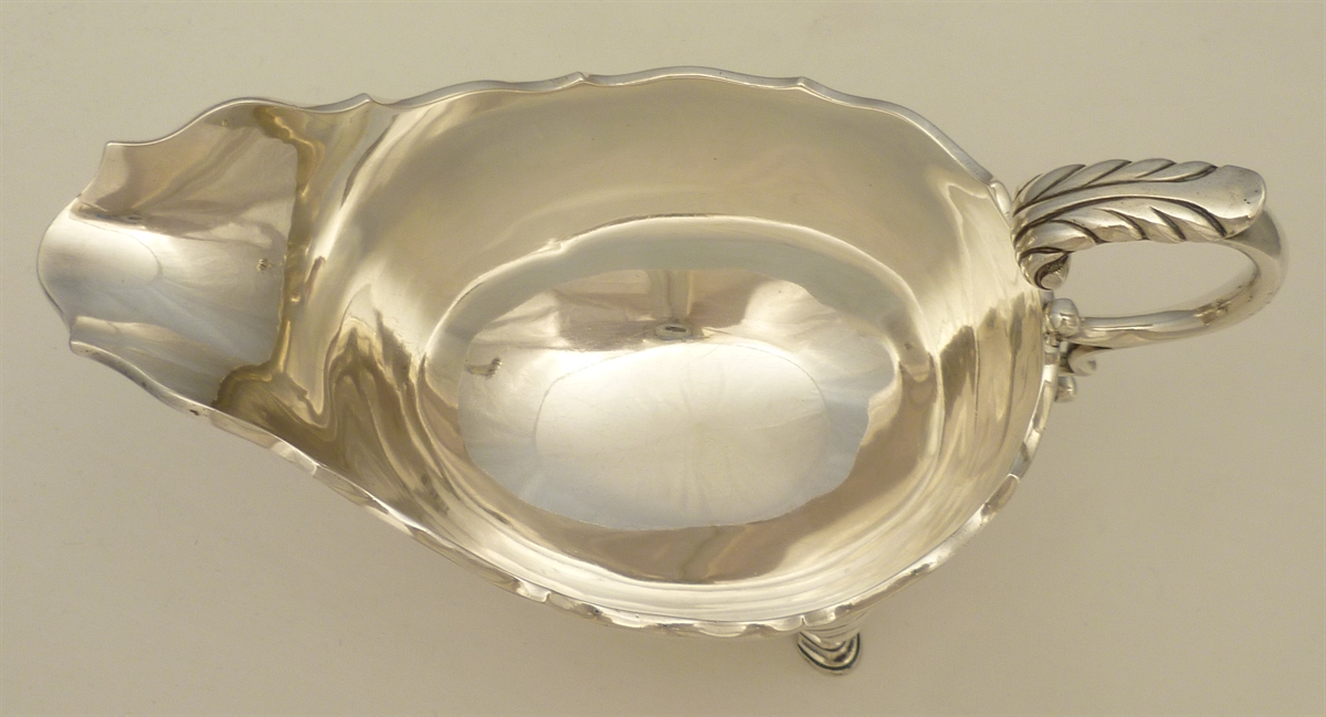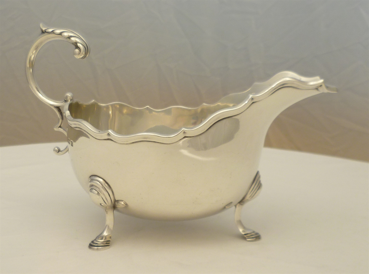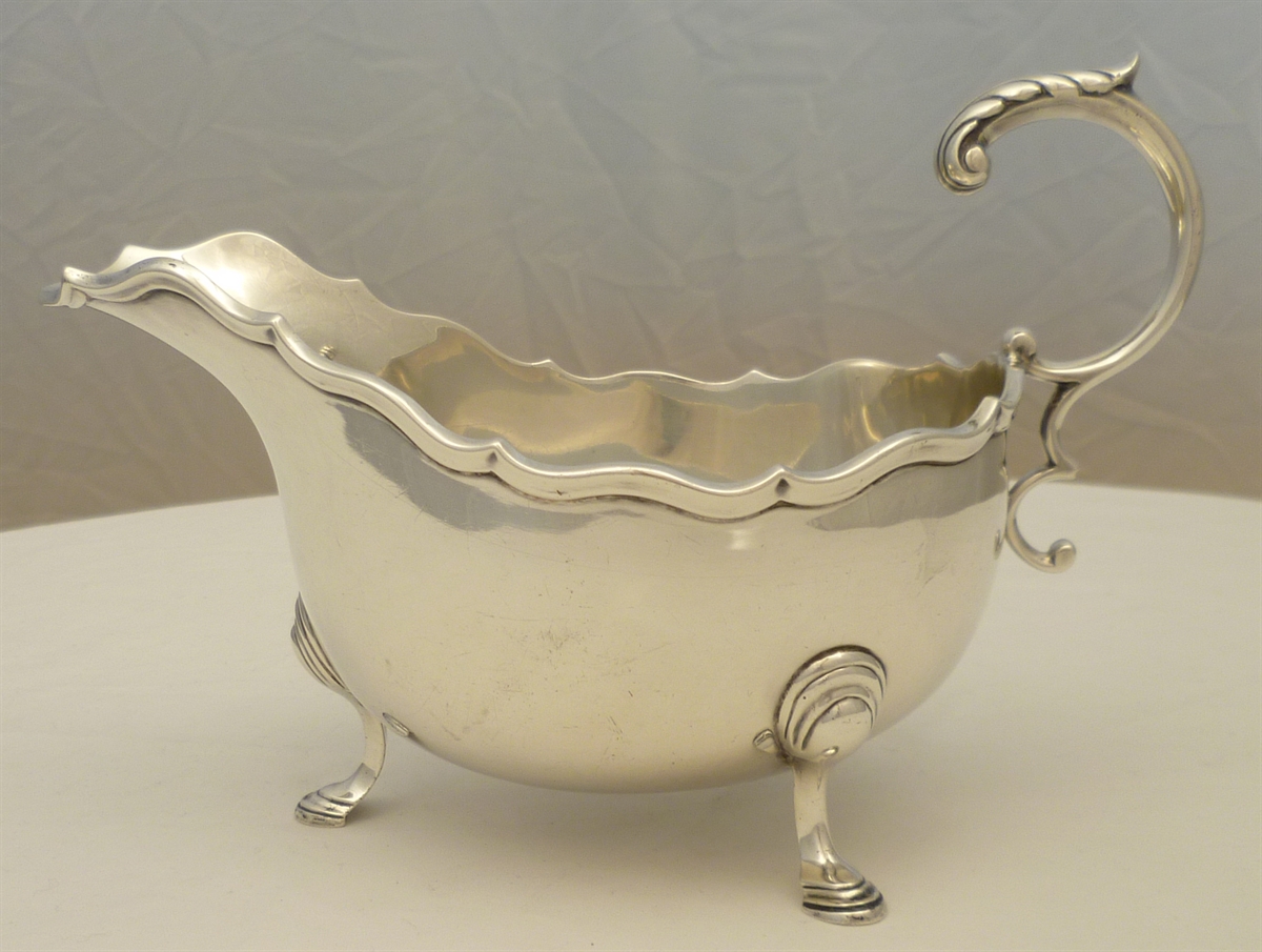 DESCRIPTION | Good quality solid sterling silver gravy boat with wavy top rim, flying leaf capped scrolling handle and three hoof feet. Holds ¾ pint, 15 fl. ozs, 430ml. |