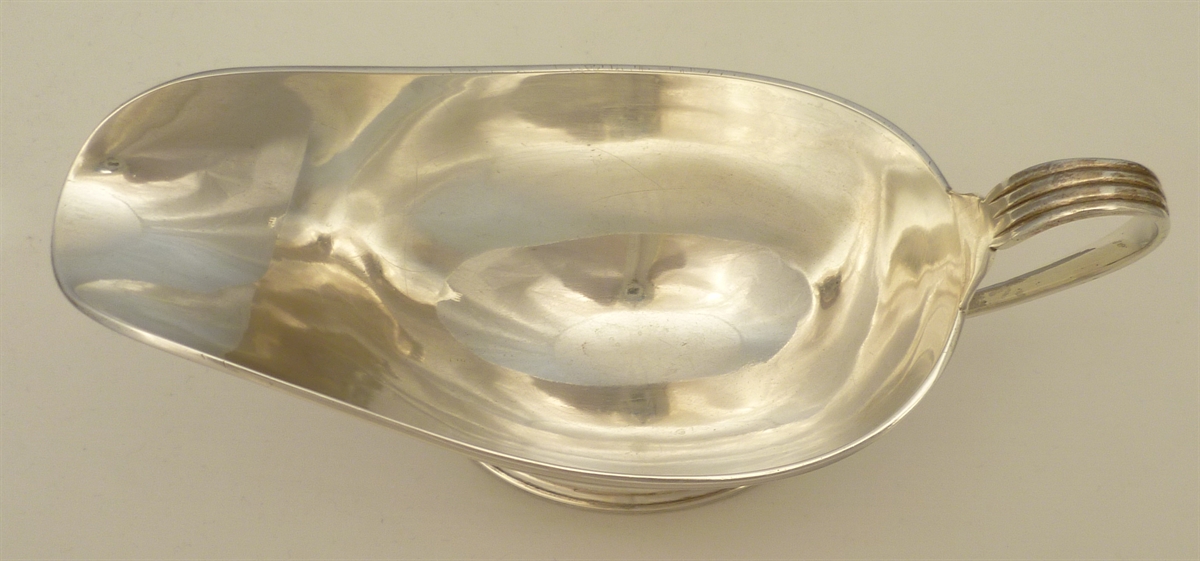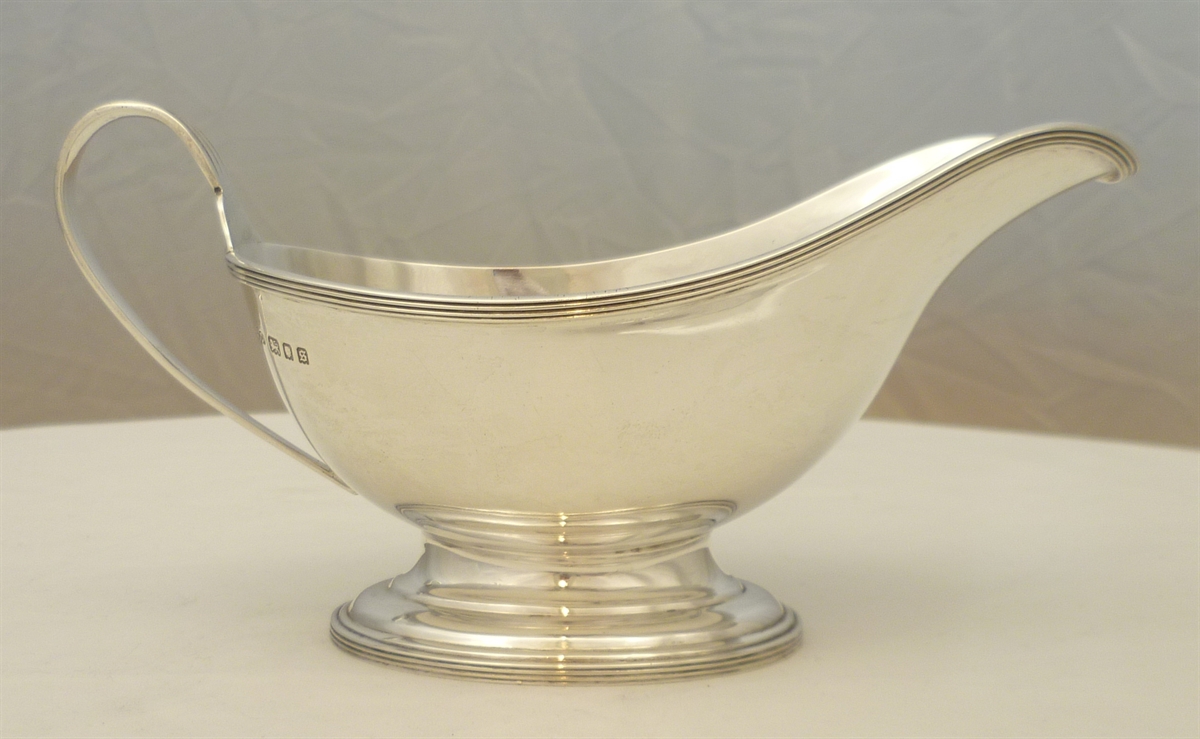 DESCRIPTION | Superb quality and surprisingly heavy solid sterling silver sauce boat with an oval pedestal foot and thread decoration. Great pourer. |