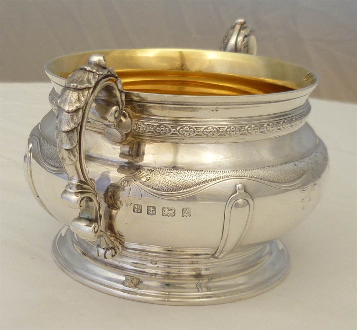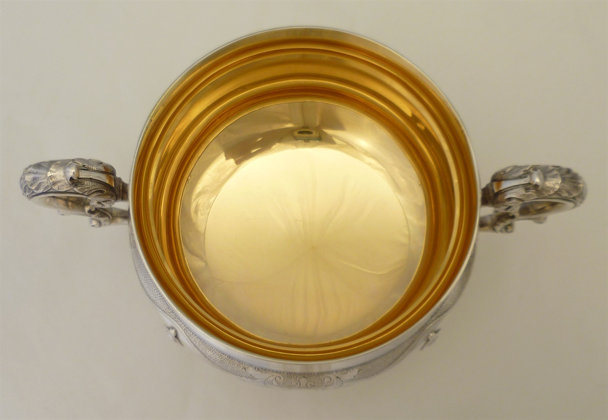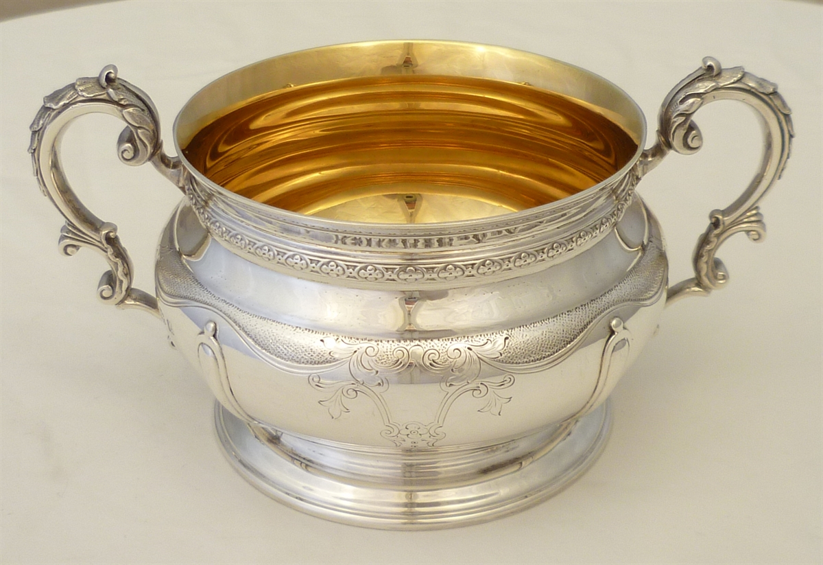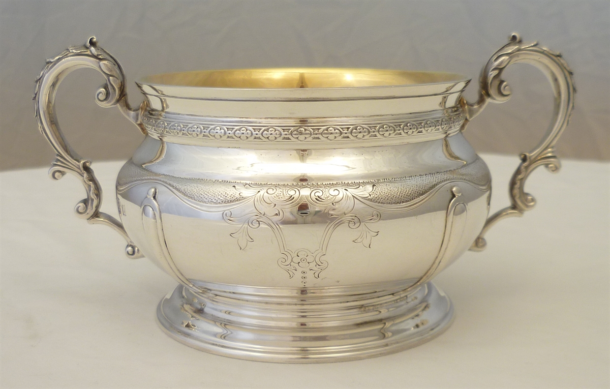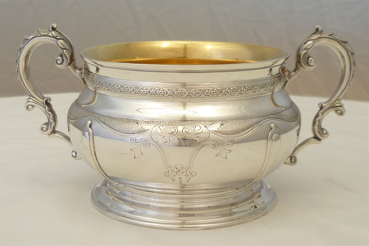 DESCRIPTION | An amazing solid sterling silver sugar bowl with breathtaking decoration and a gilded interior. |