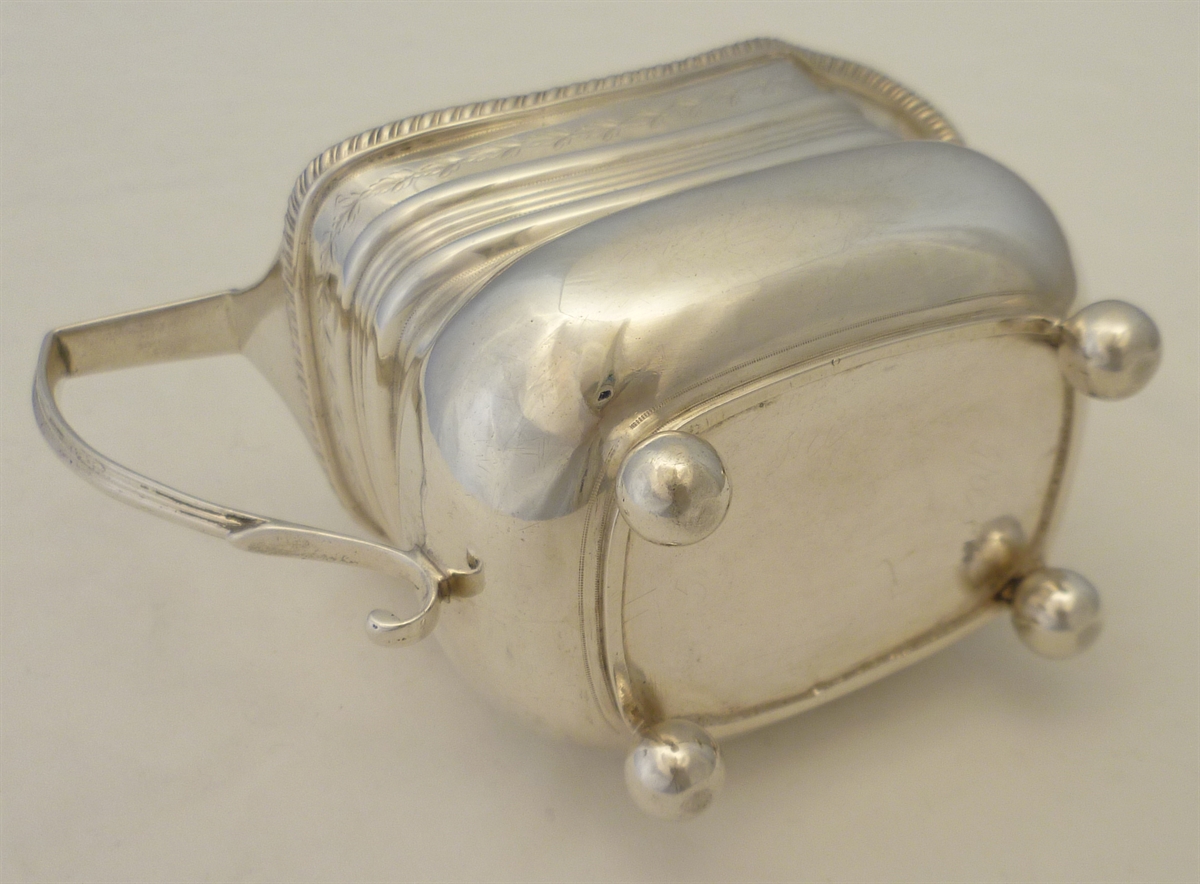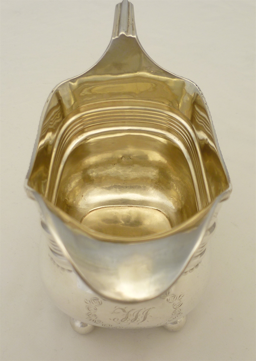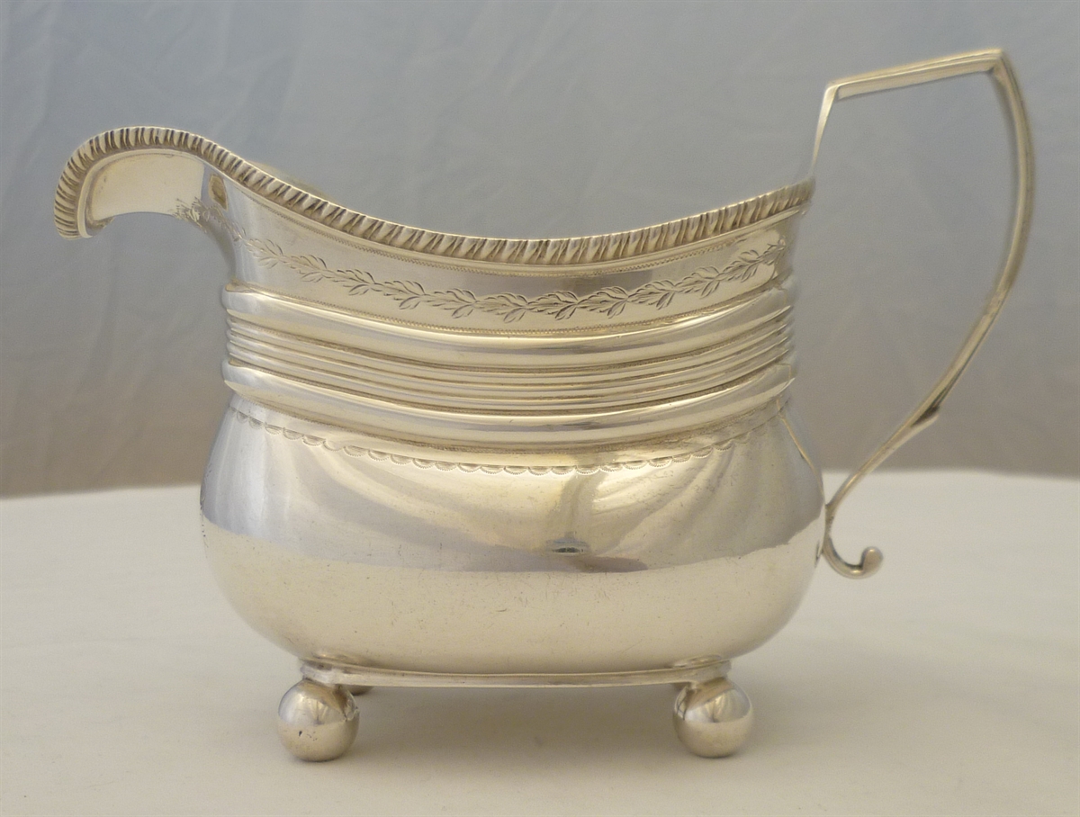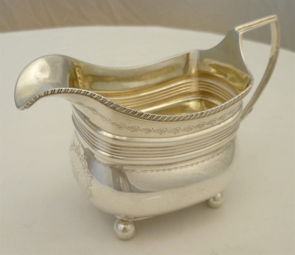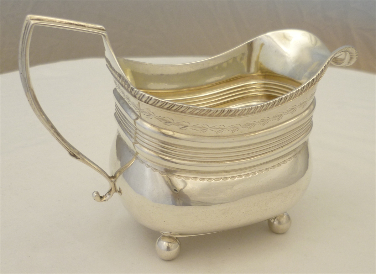 DESCRIPTION | Good Georgian solid sterling silver milk or cream jug with a lightly gilded interior, four ball feet, gadrooned top rim and bands of decorative engraving. Very similar to this item that I sold many years ago http://www.silfren.com/Bateman/items10/M1016.htm |