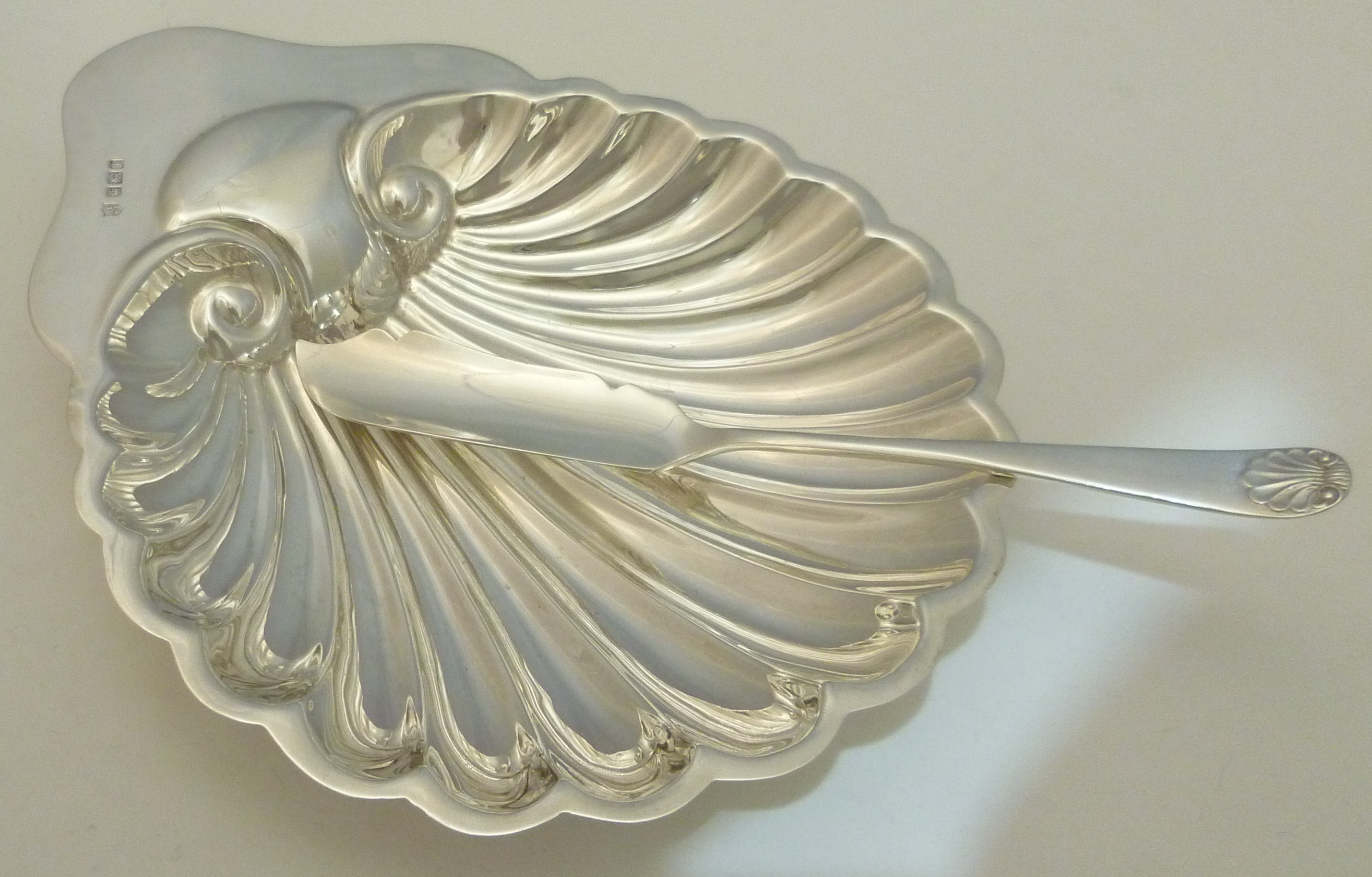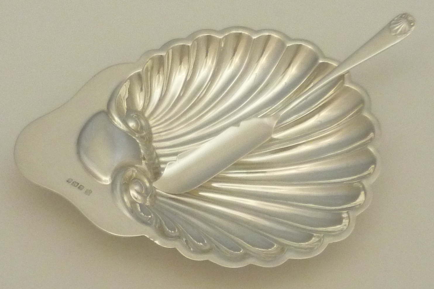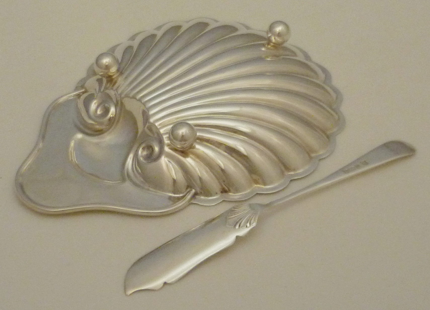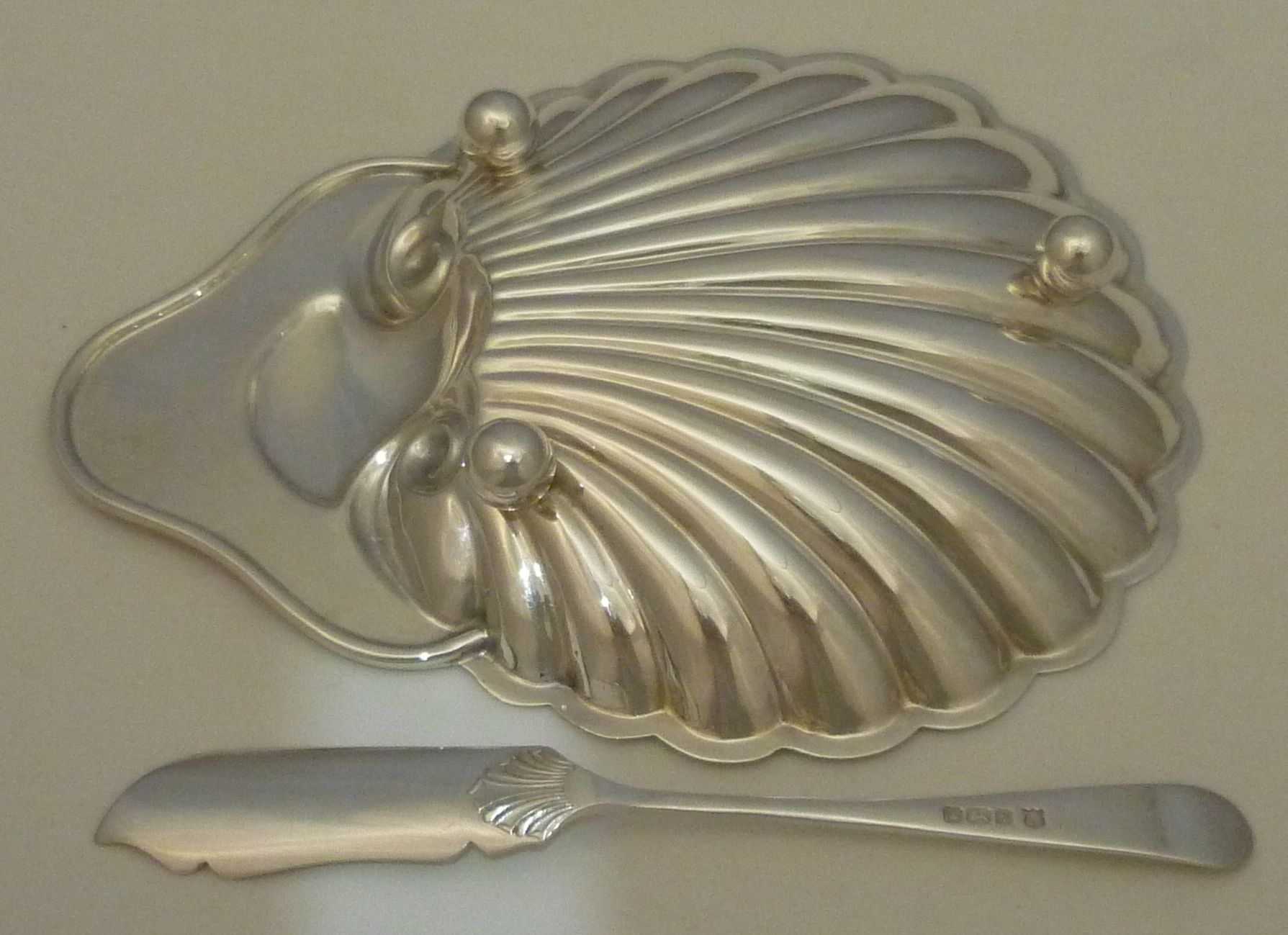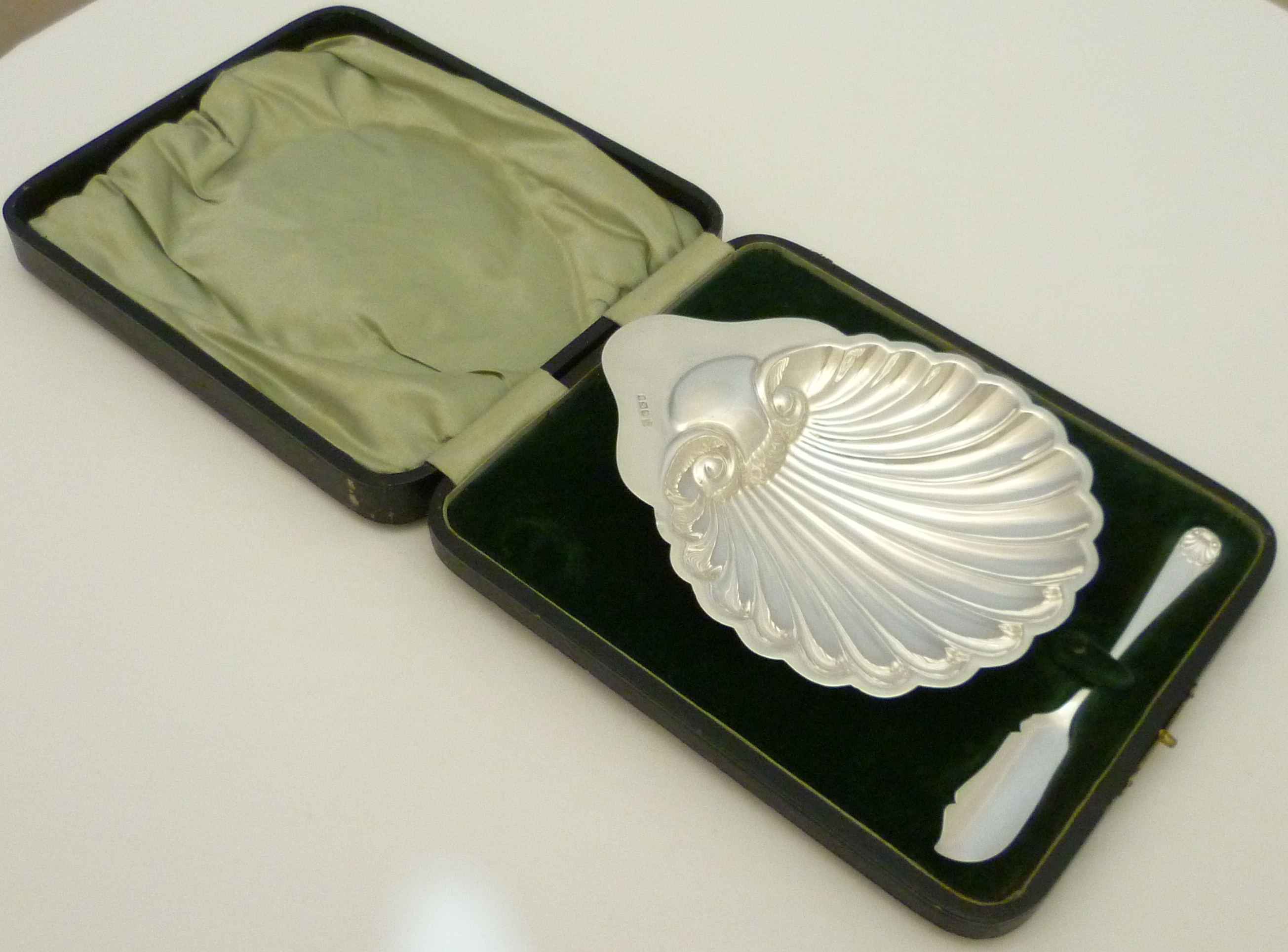 DESCRIPTION | Very good solid sterling silver butter shell and pretty shell decorated butter knife complete with original fitted case. |