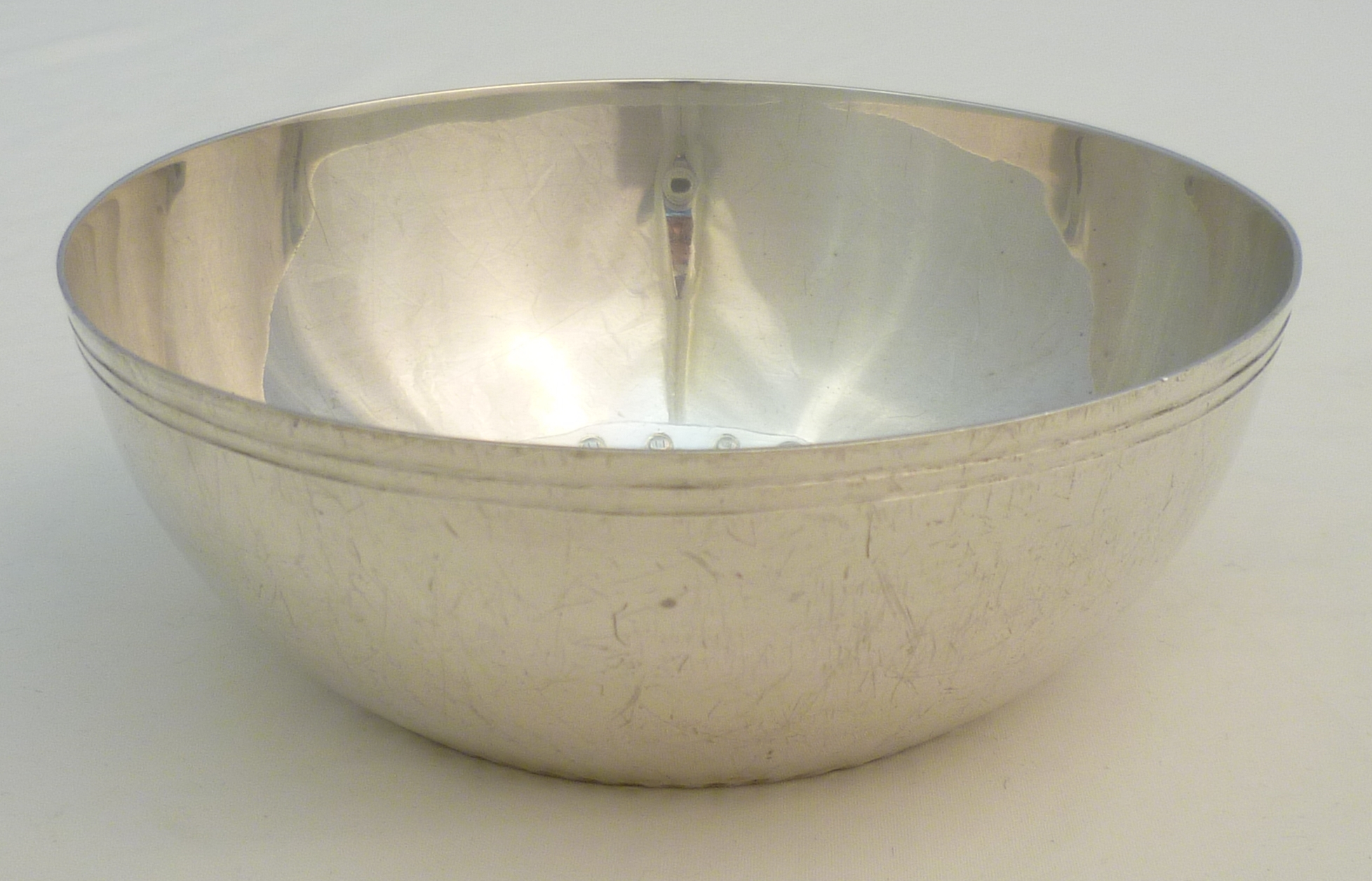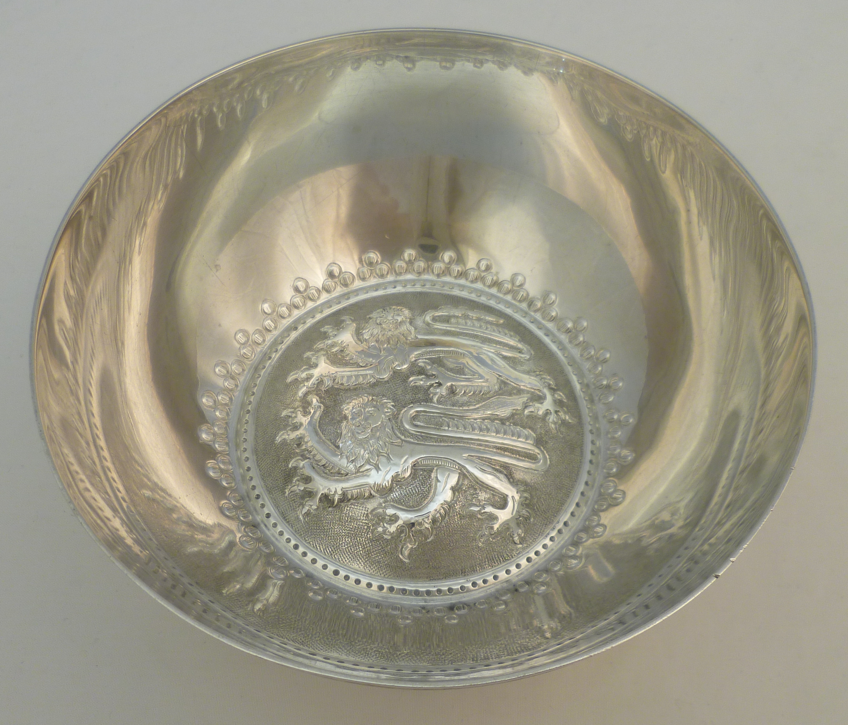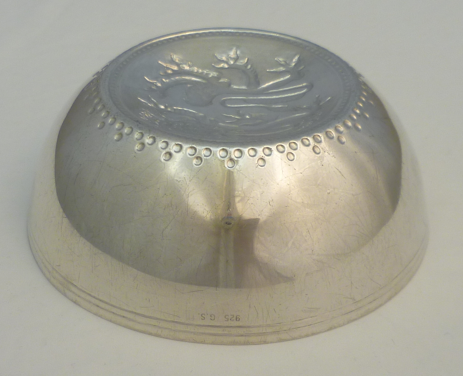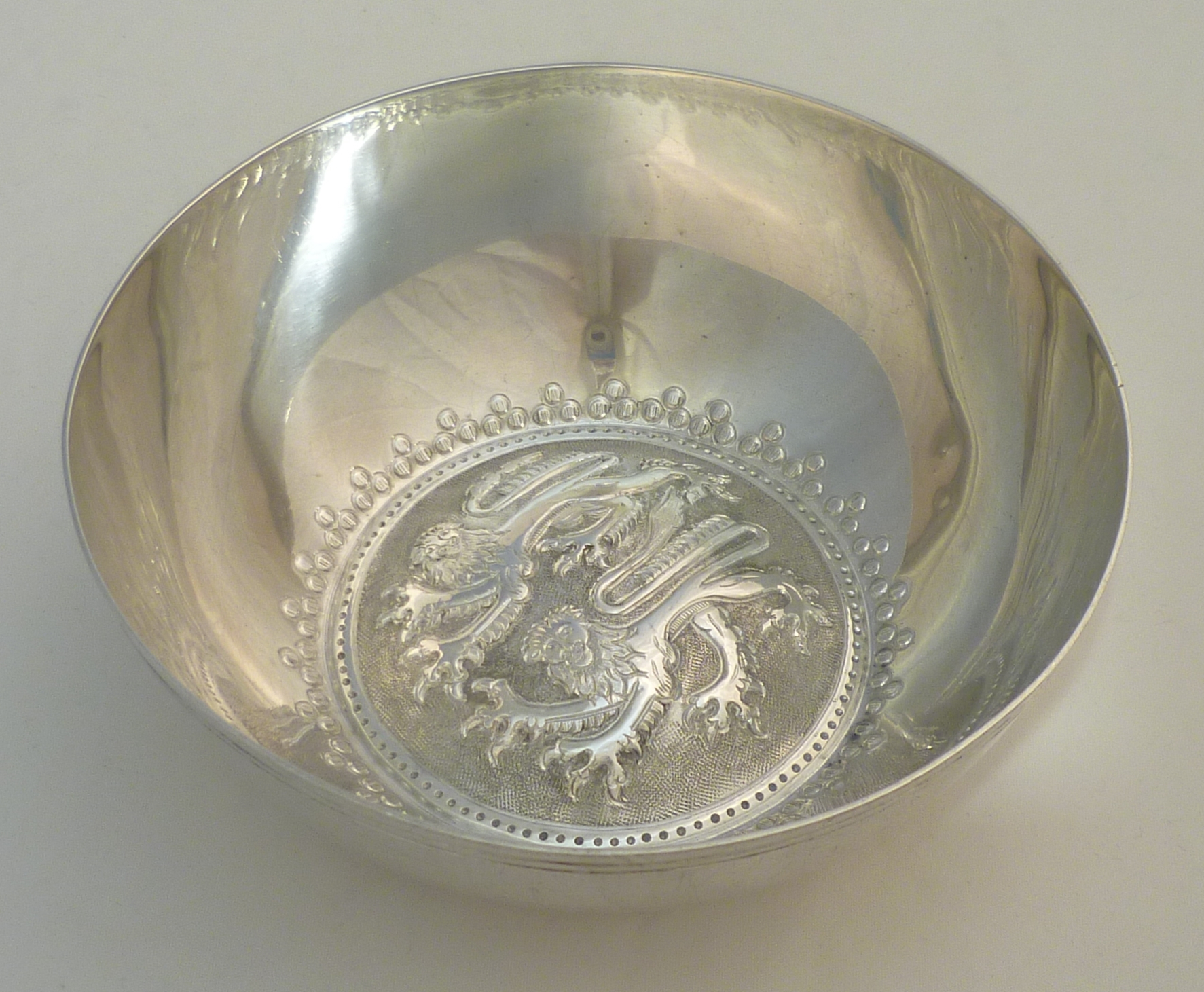 DESCRIPTION | Nice quality solid sterling silver bowl with embossed and engraved decoration to the base featuring two lions passant guardant. |