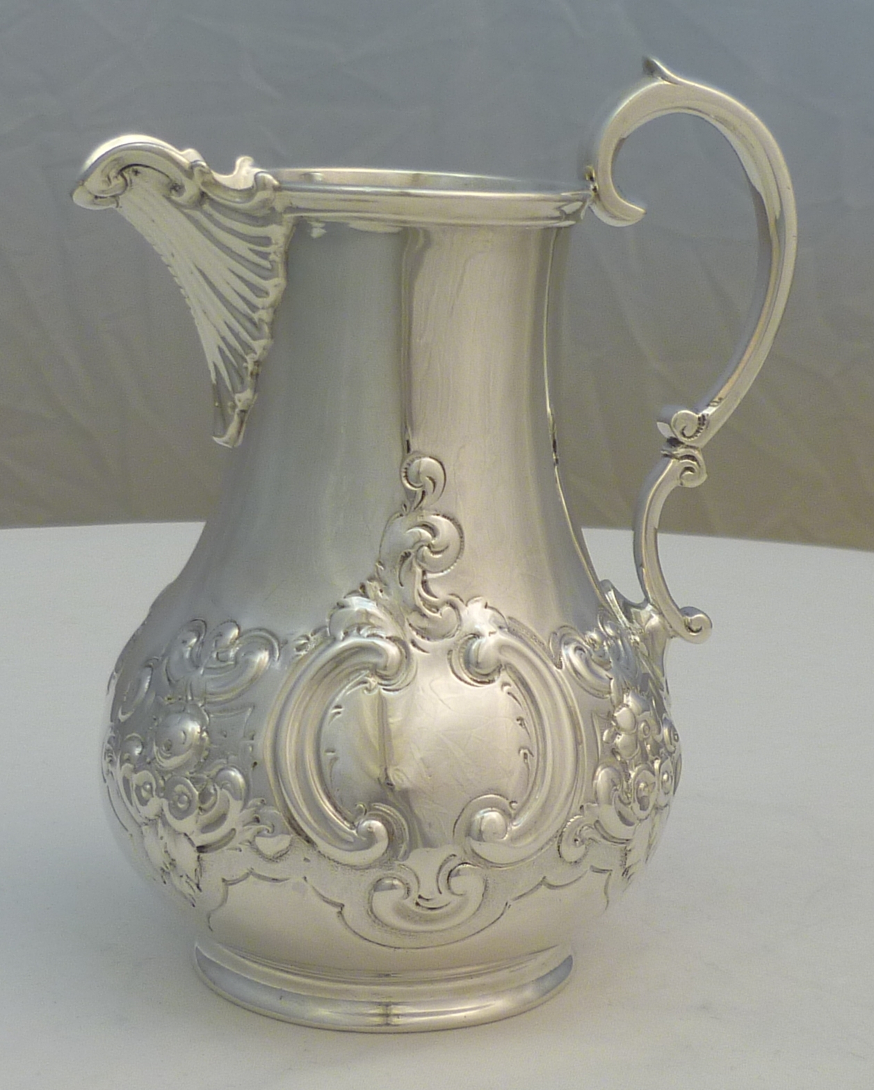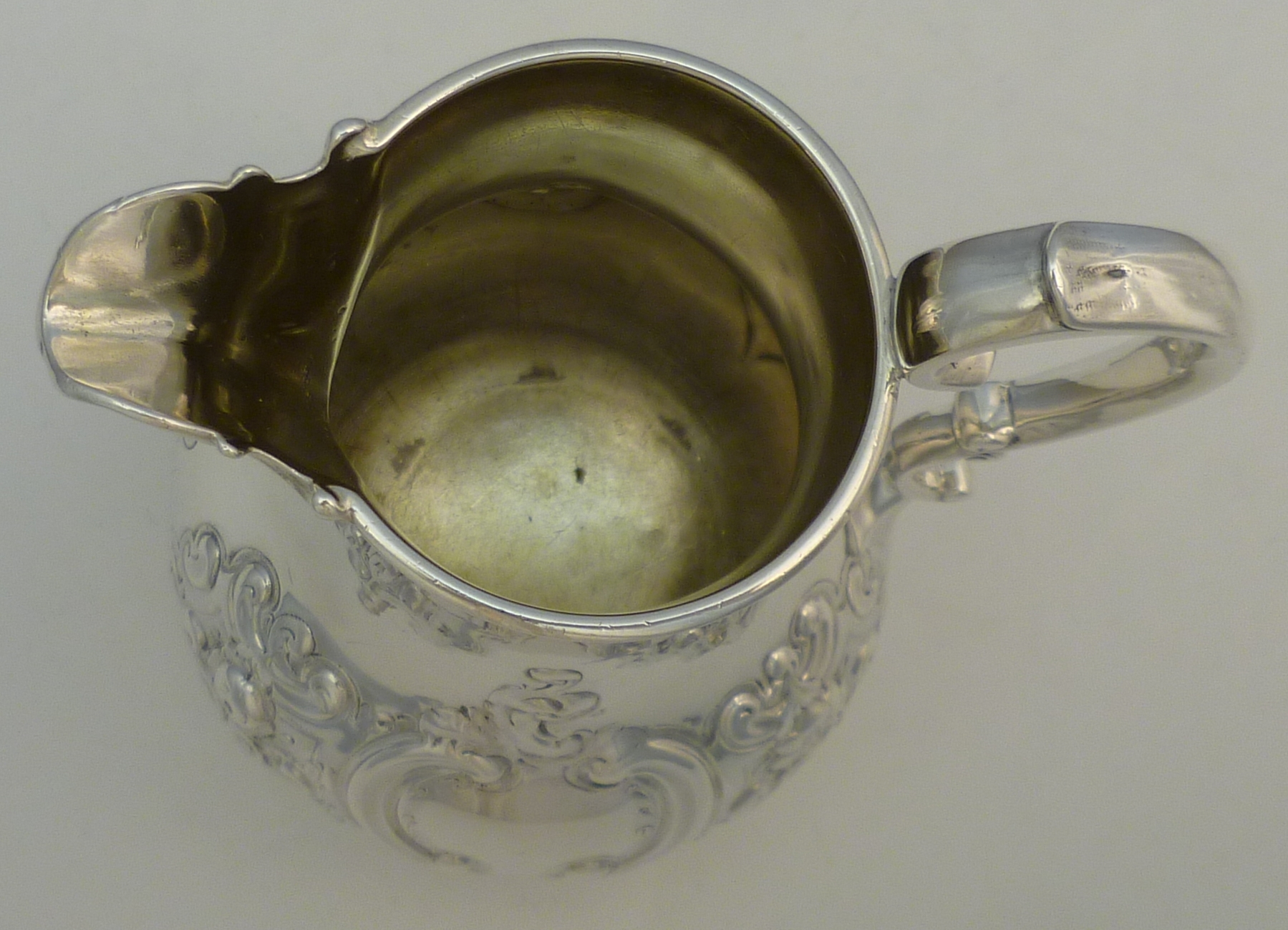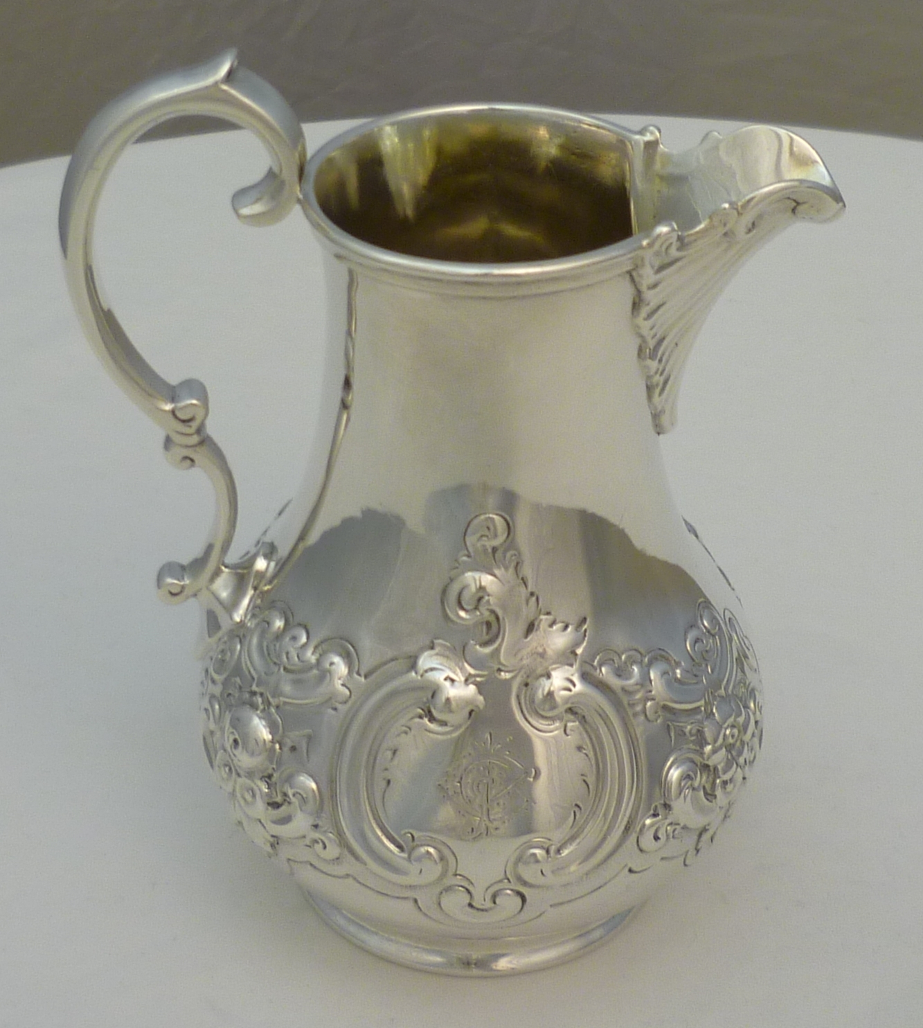 DESCRIPTION | Very good Victorian rococo solid sterling silver milk jug with embossed, cast and engraved decoration, blank cartouche to one side and a monogram engraved cartouche to the other. Thick, heavy silver throughout, a very solid piece. |